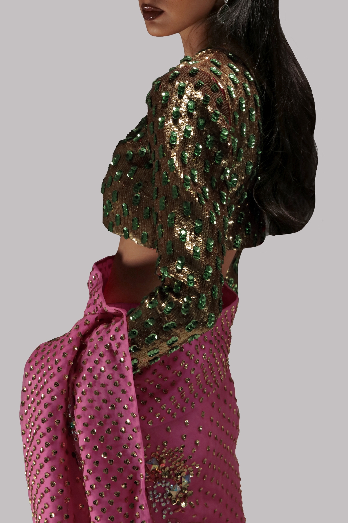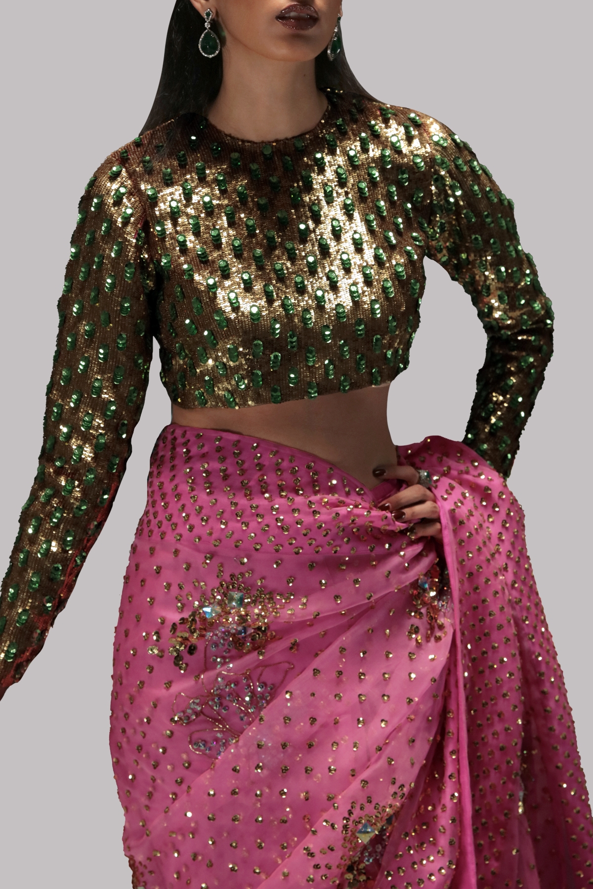 Pink Carnation organza sari with matching embellished dupion cropped blouse. Hand embellished with freshwater pearls, glistening sequins, dazzling crystals and gold beads. This sensational sari is no exception. The sari has stitched pleats for ease of wearing. Silk petticoat included.