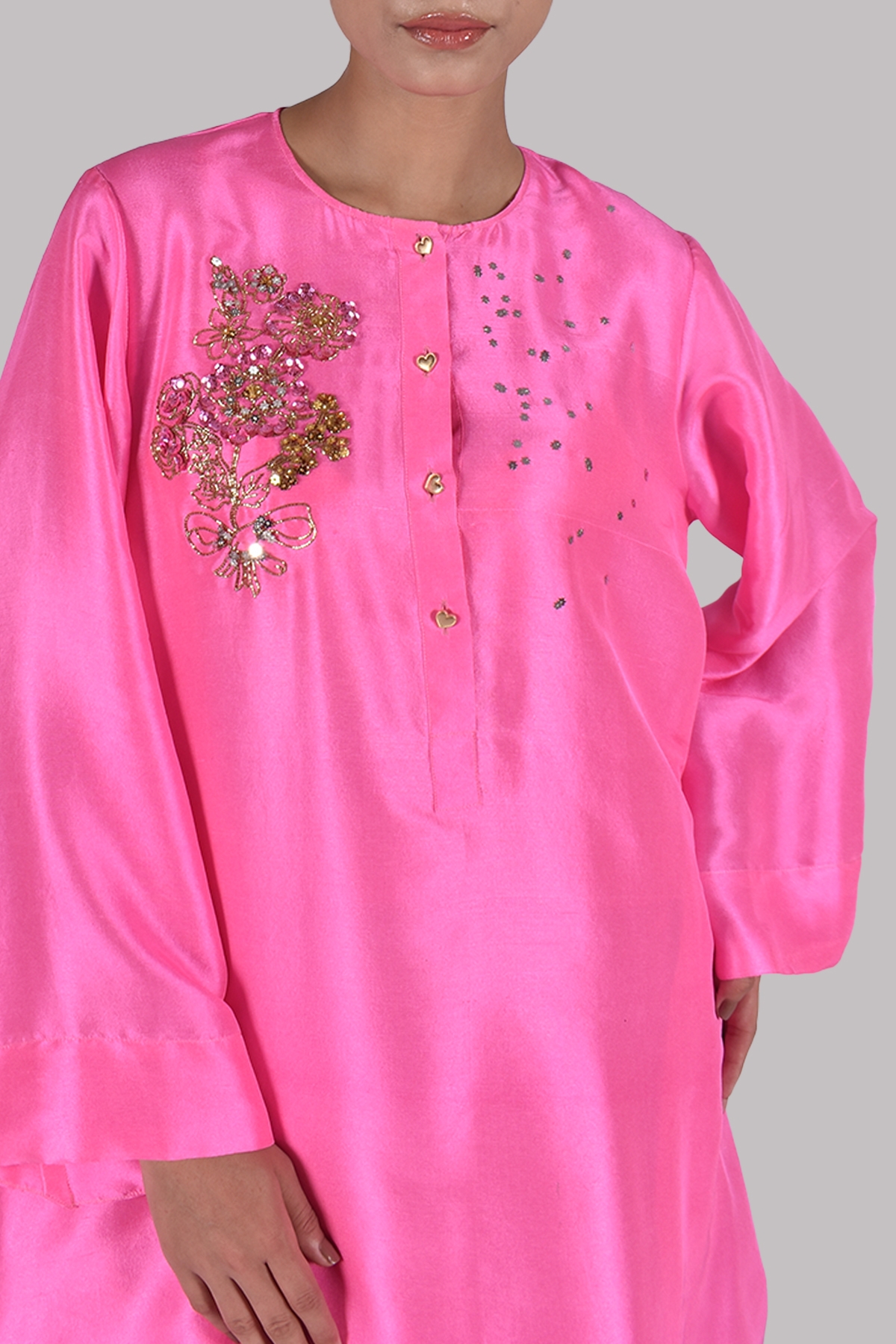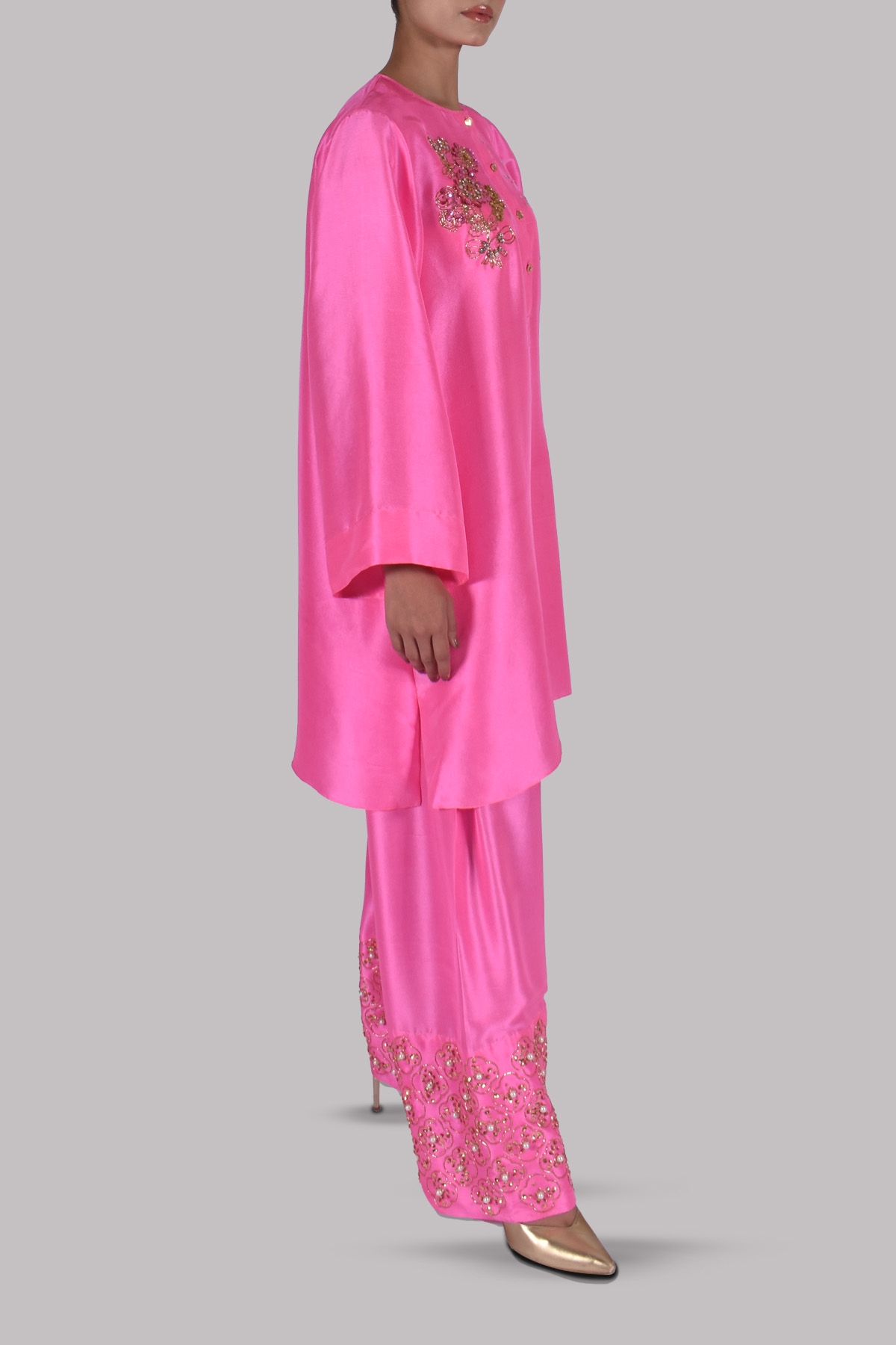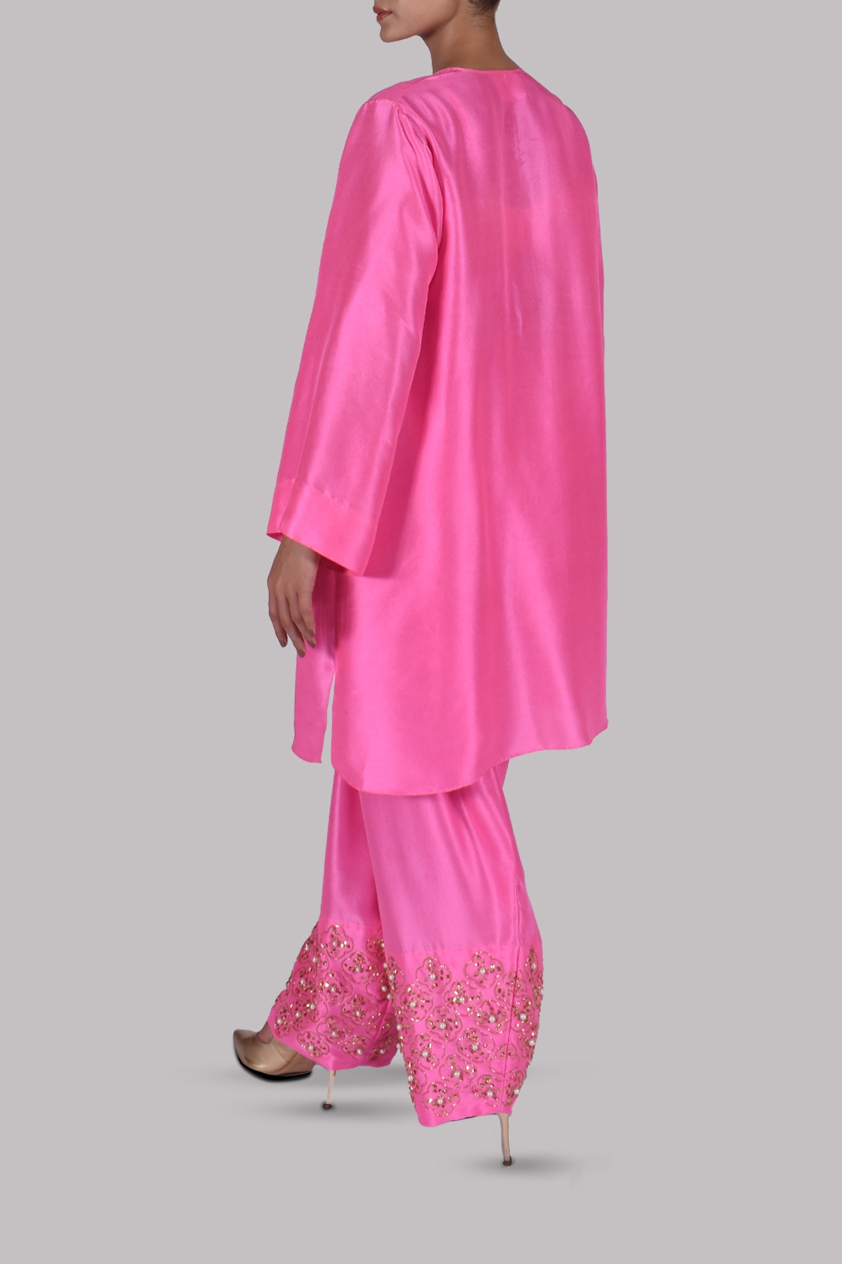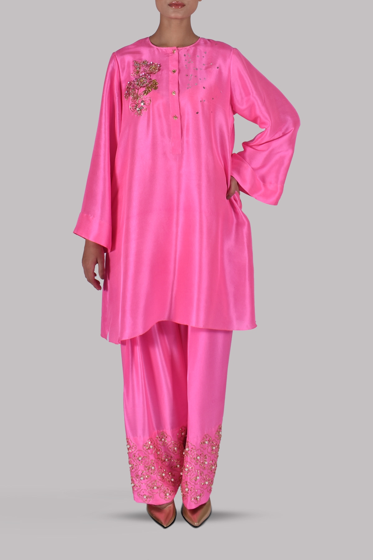 Pink Carnation close neck raw silk tunic with button details. Impeccably tailored with matching raw silk shalwar pants.