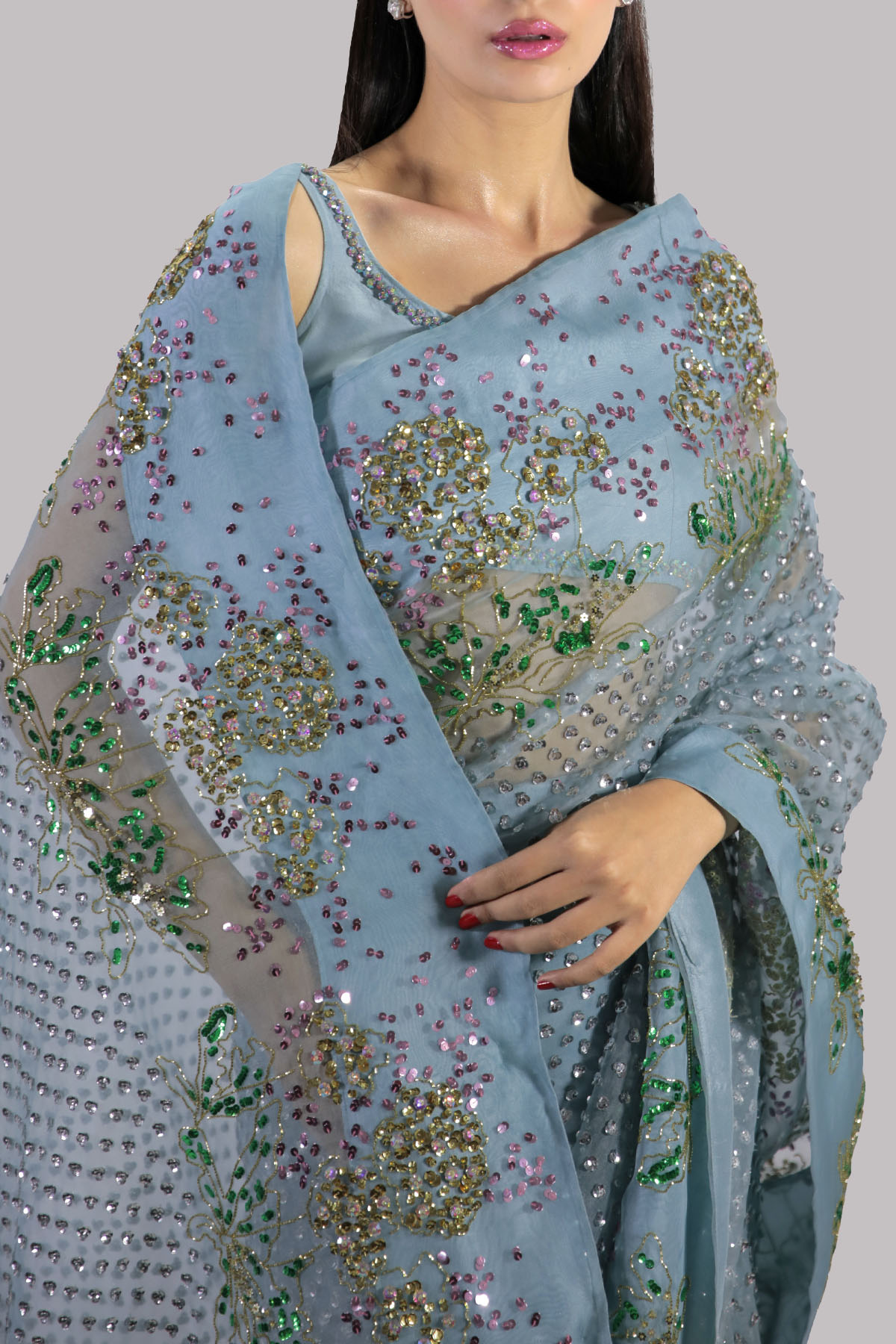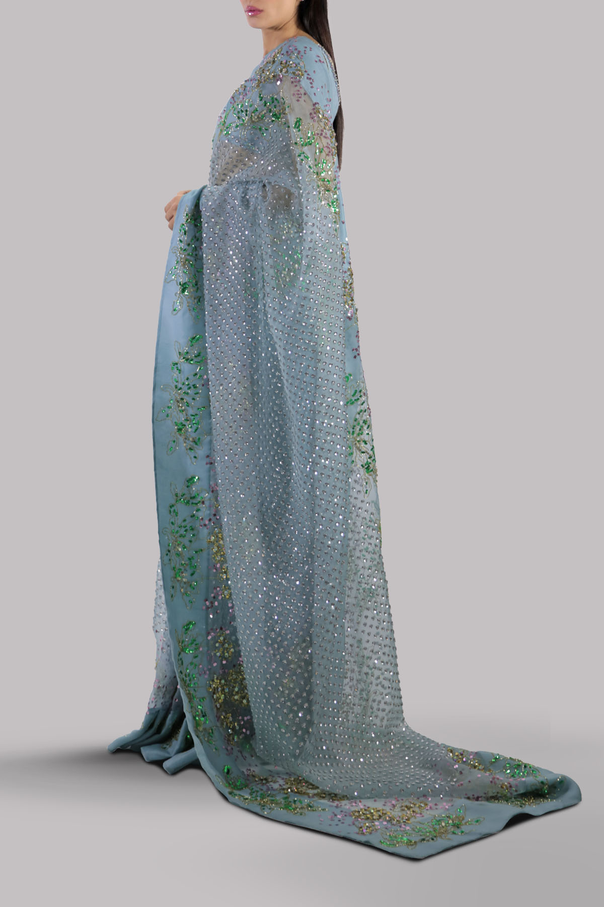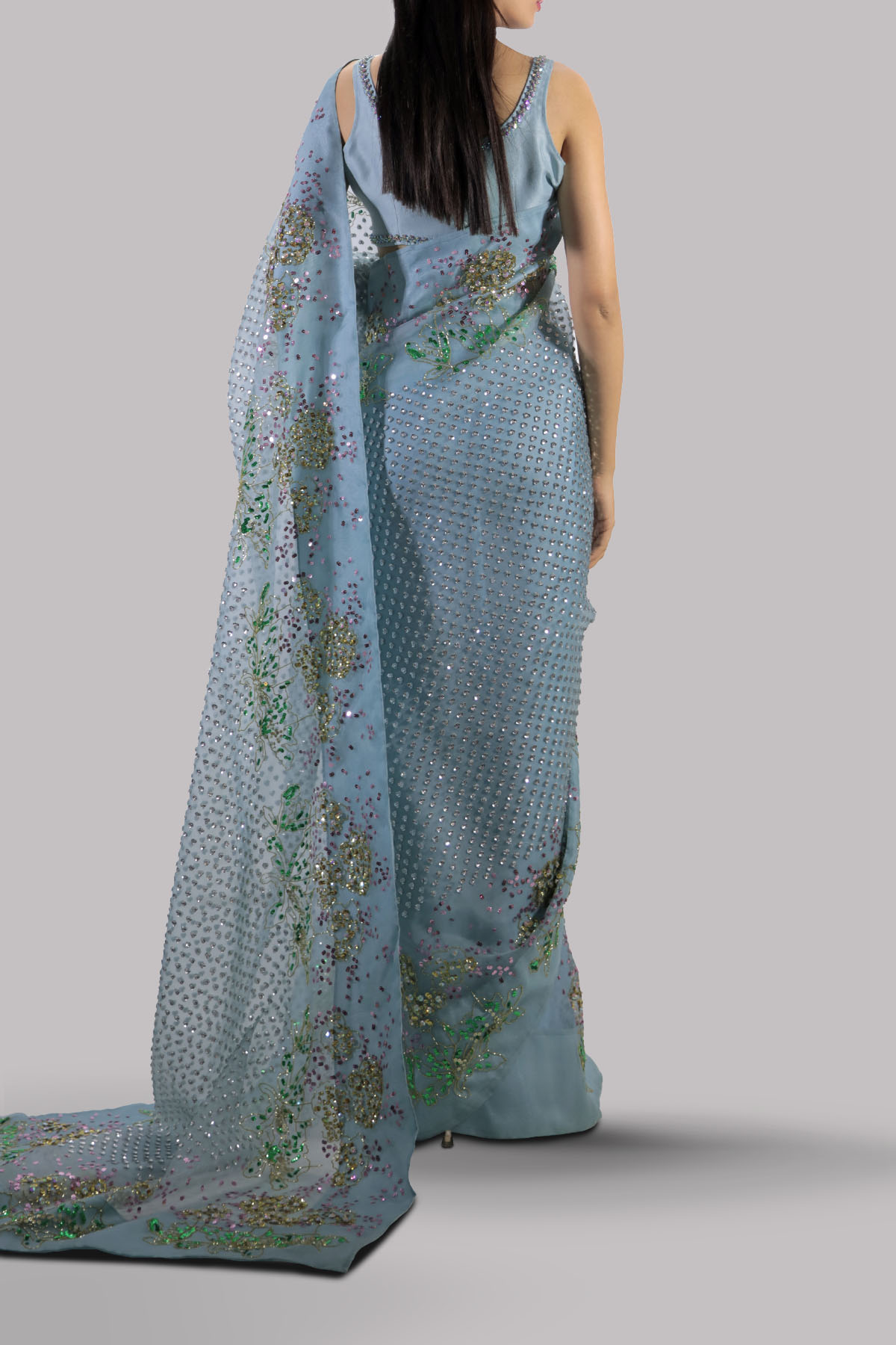 PORCELAIN BLUE ORGANZA SARI AND CROPPED BLOUSE, HAND EMBELLISHED WITH INTRICATE EMBELLISHMENTS OF FRESHWATER PEARLS, DAZZLING CRYSTALS, AND MULTI COLORED GLITTERING SEQUINS. A SOPHISTICATED AND MODERN TAKE ON THE TRADITIONAL SARI. THE SARI HAS STITCHED PLEATS FOR EASE OF WEARING. MATCHING STITCHED UNDERSKIRT INCLUDED.