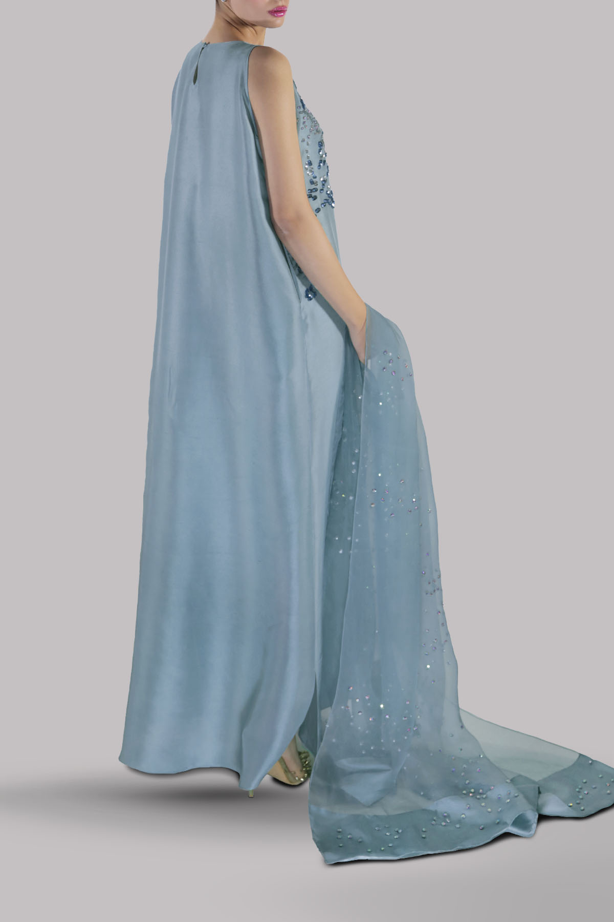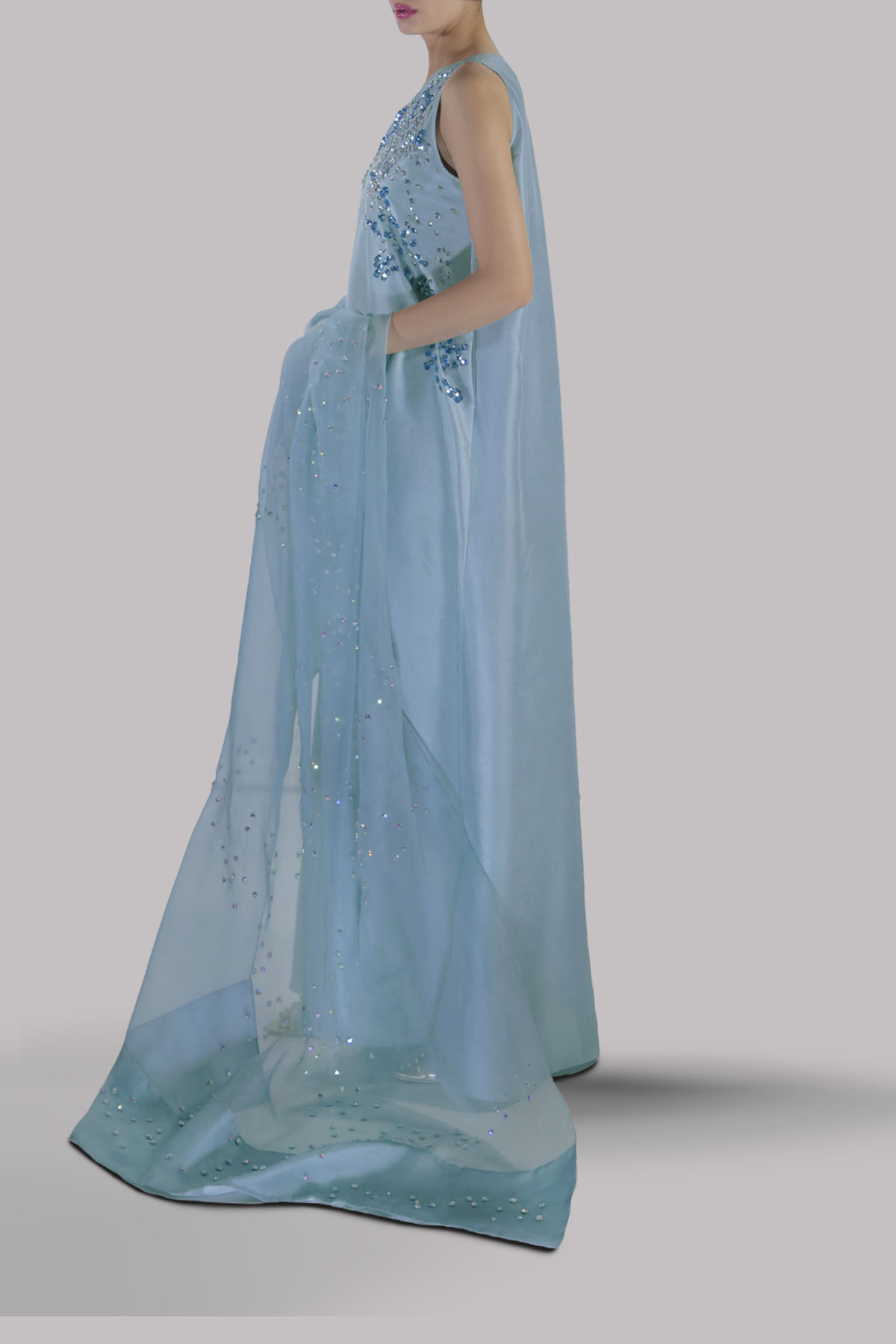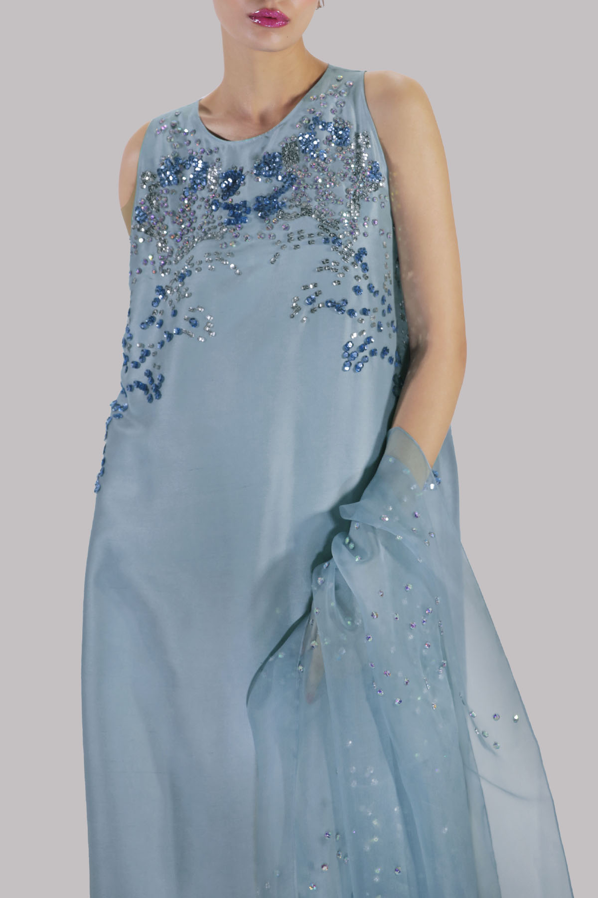 Sterling Blue, Straight raw silk maxi dress, hand embellished with glittering crystals and blue coloured French and Italian sequins. It’s designed in a slim silhouette with bold side slit. Matching embellished organza dupatta Included.