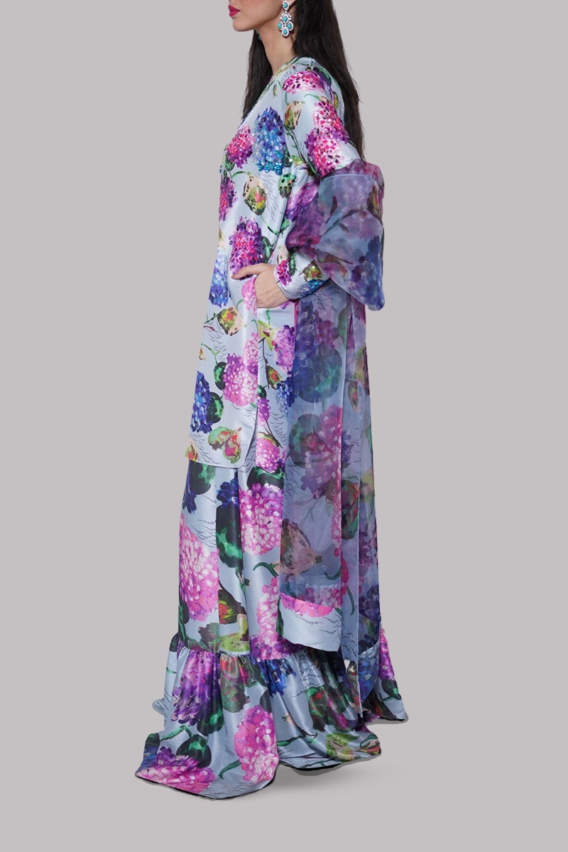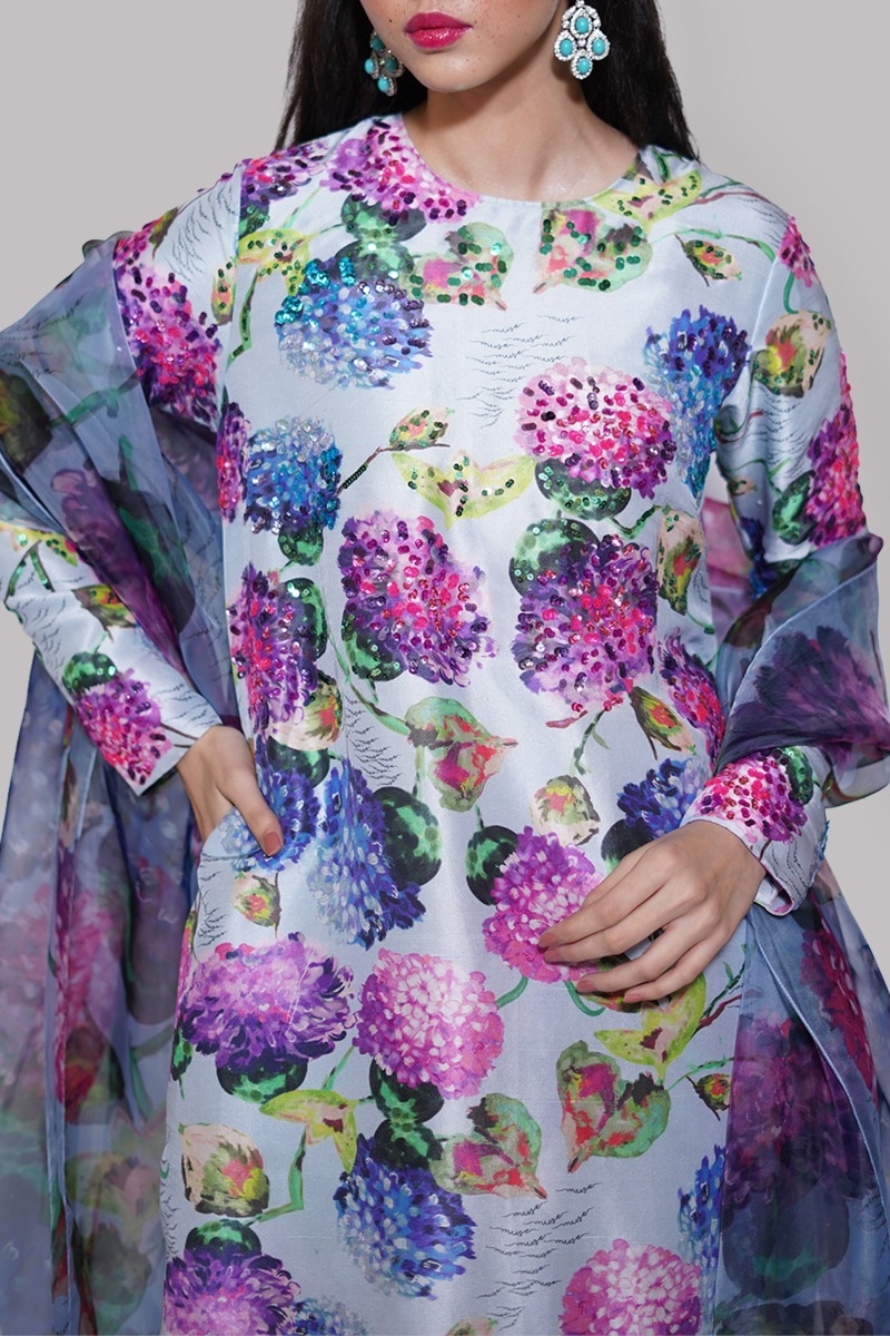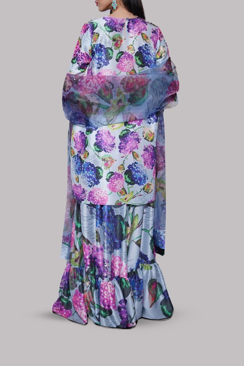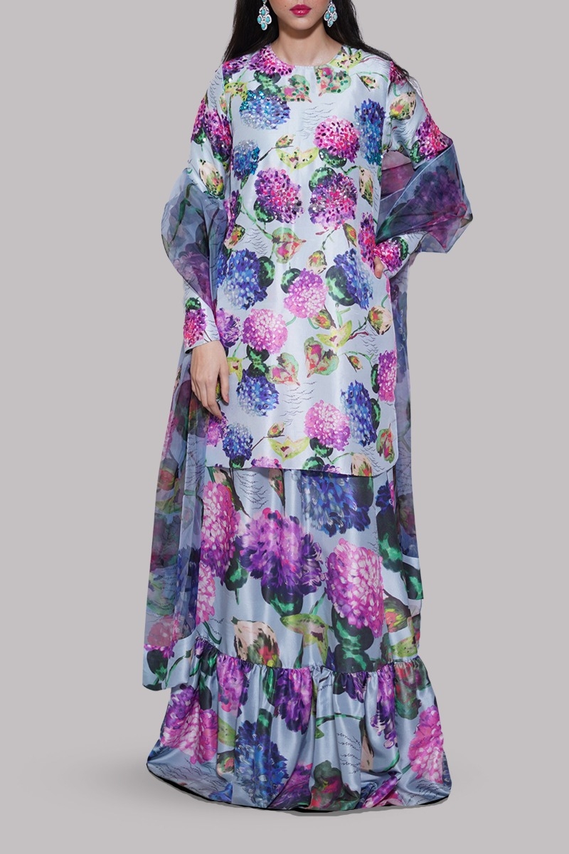 A stunning powder printed and embellished ensemble. The tunic is hand embellished with beautiful French sequins, while the skirt adds a touch of regal charm with its flowing style. Matching printed organza completes this elegant ensemble.