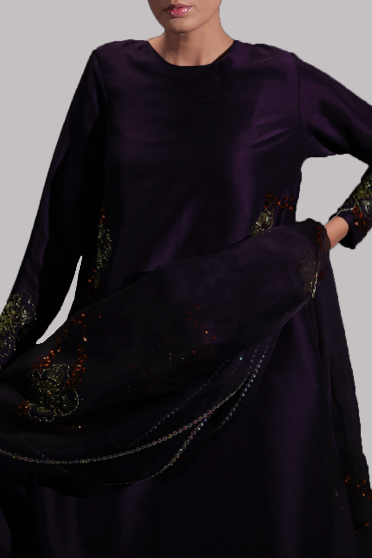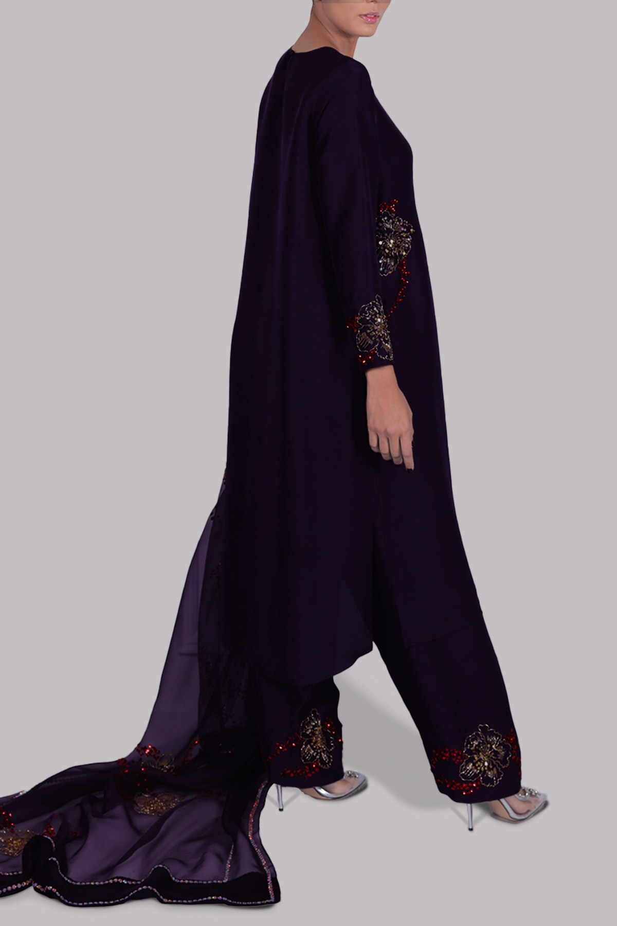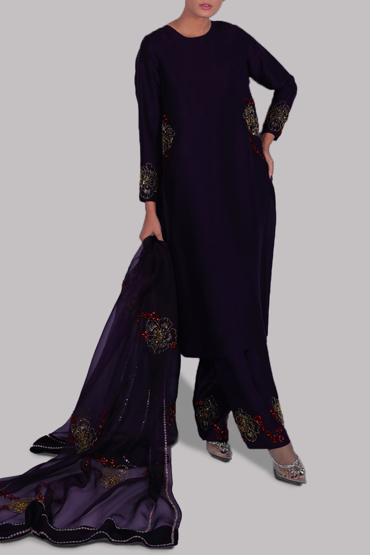 PURPLE PENANT, OVERSIZED RAW SILK TOP, HAND EMBELLISHED WITH MULTI-COLORED FRENCH AND ITALIAN SEQUINS. MATCHING EMBELLISHED RAW SILK SHALWAR PANTS AND EMBELLISHED ORGANZA DUPATTA.