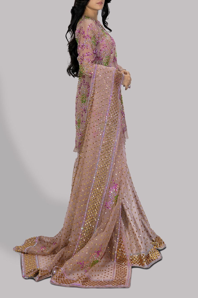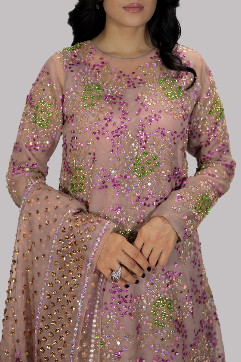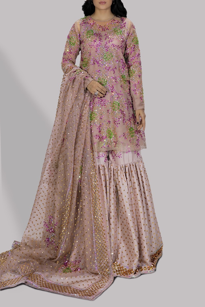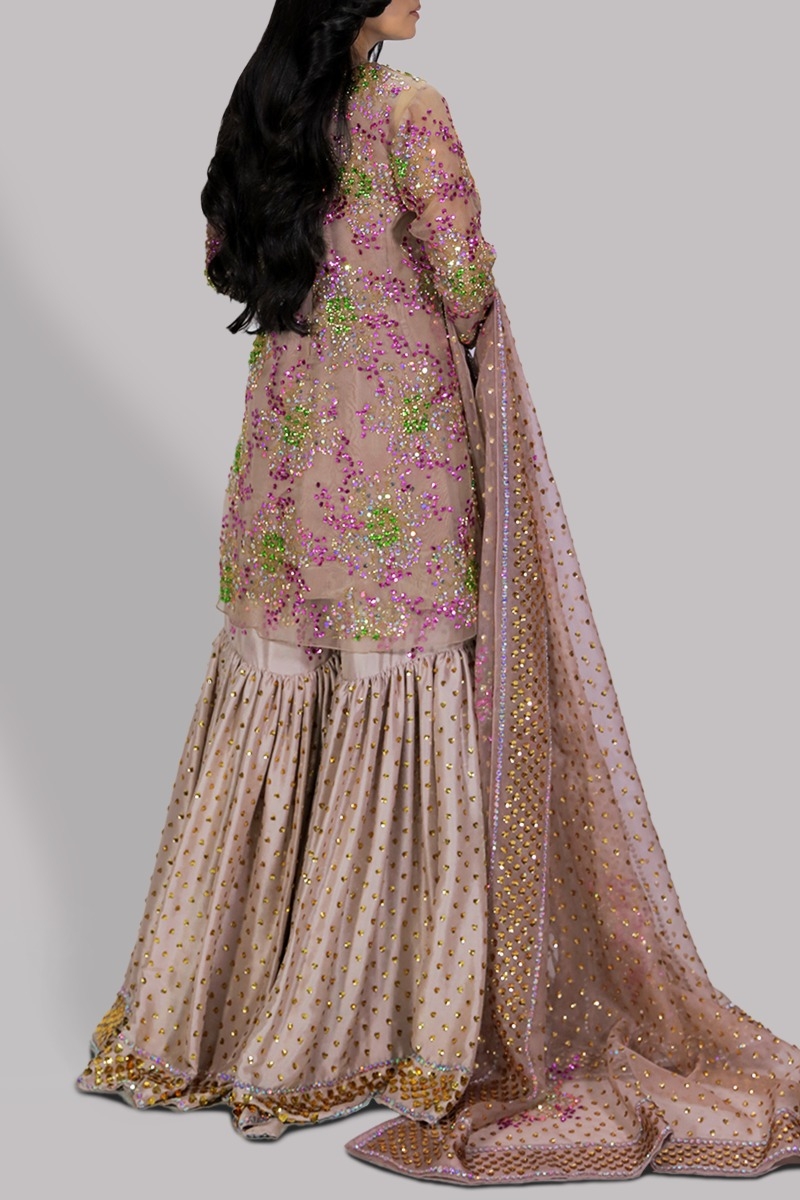 Rose Dust, close neck organza shirt, heavily hand embellished with multi-coloured French and Italian sequins with perfect cut and extravagant details. Impeccably tailored with matching embellished raw silk gharara and embellished organza dupatta.