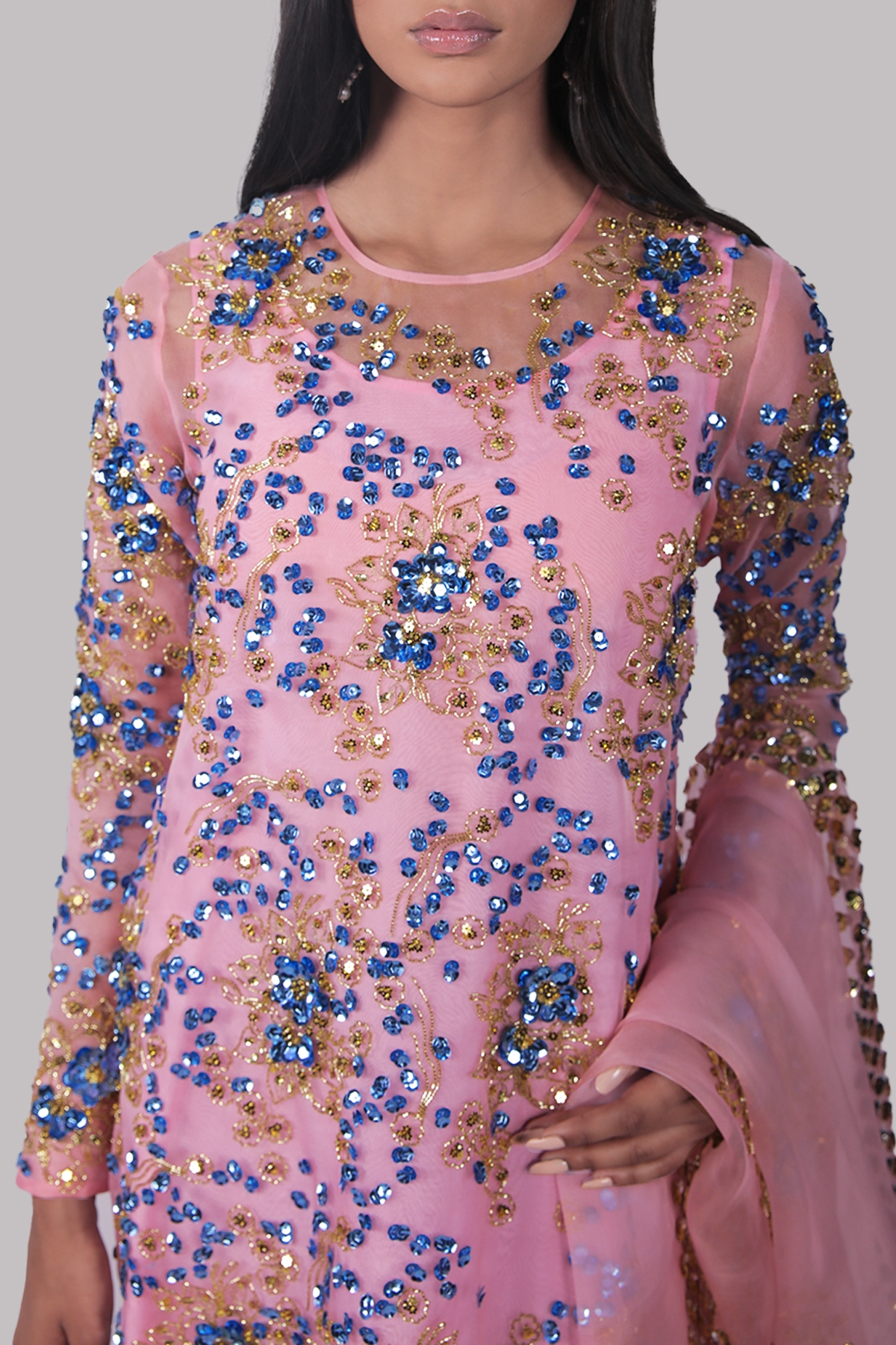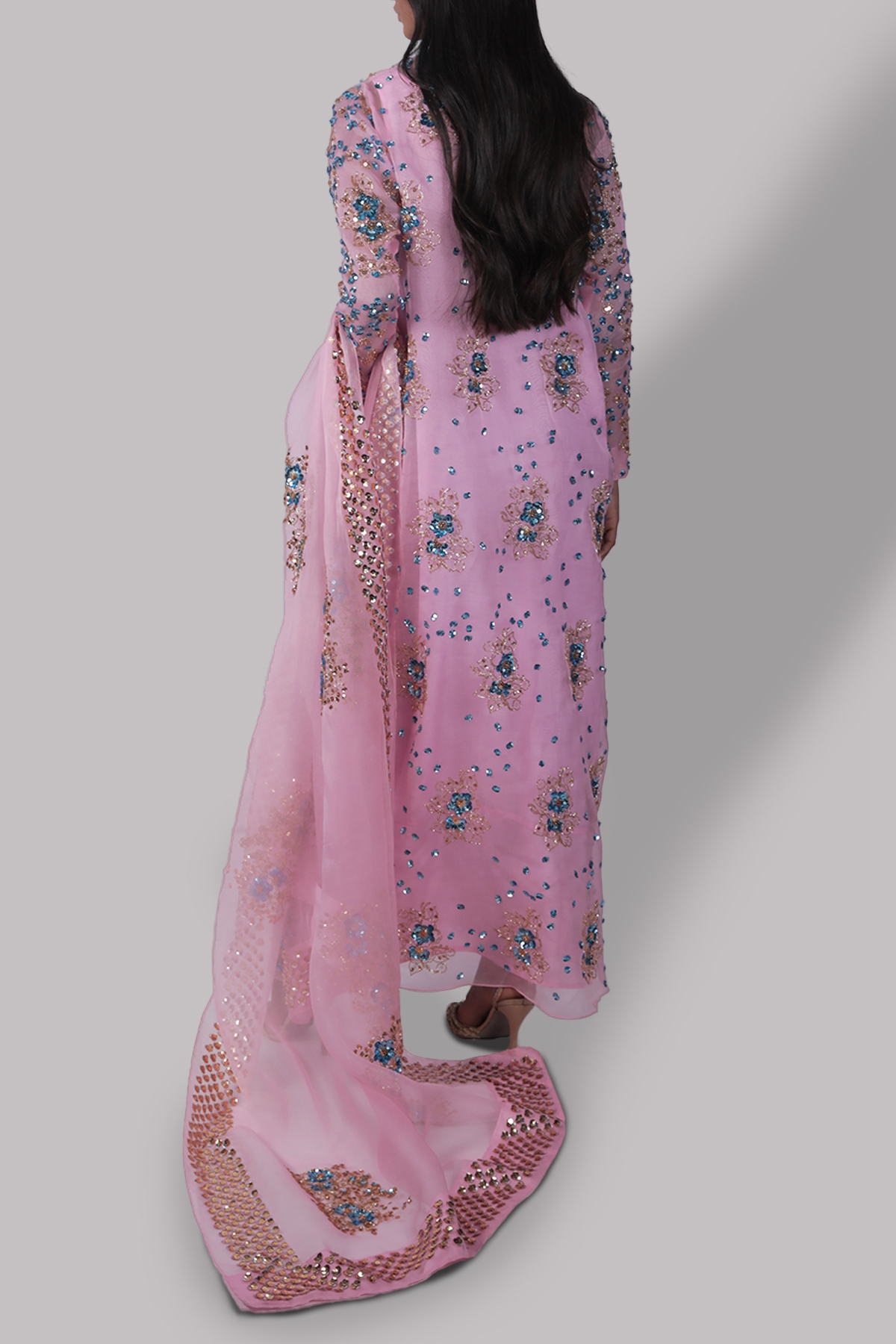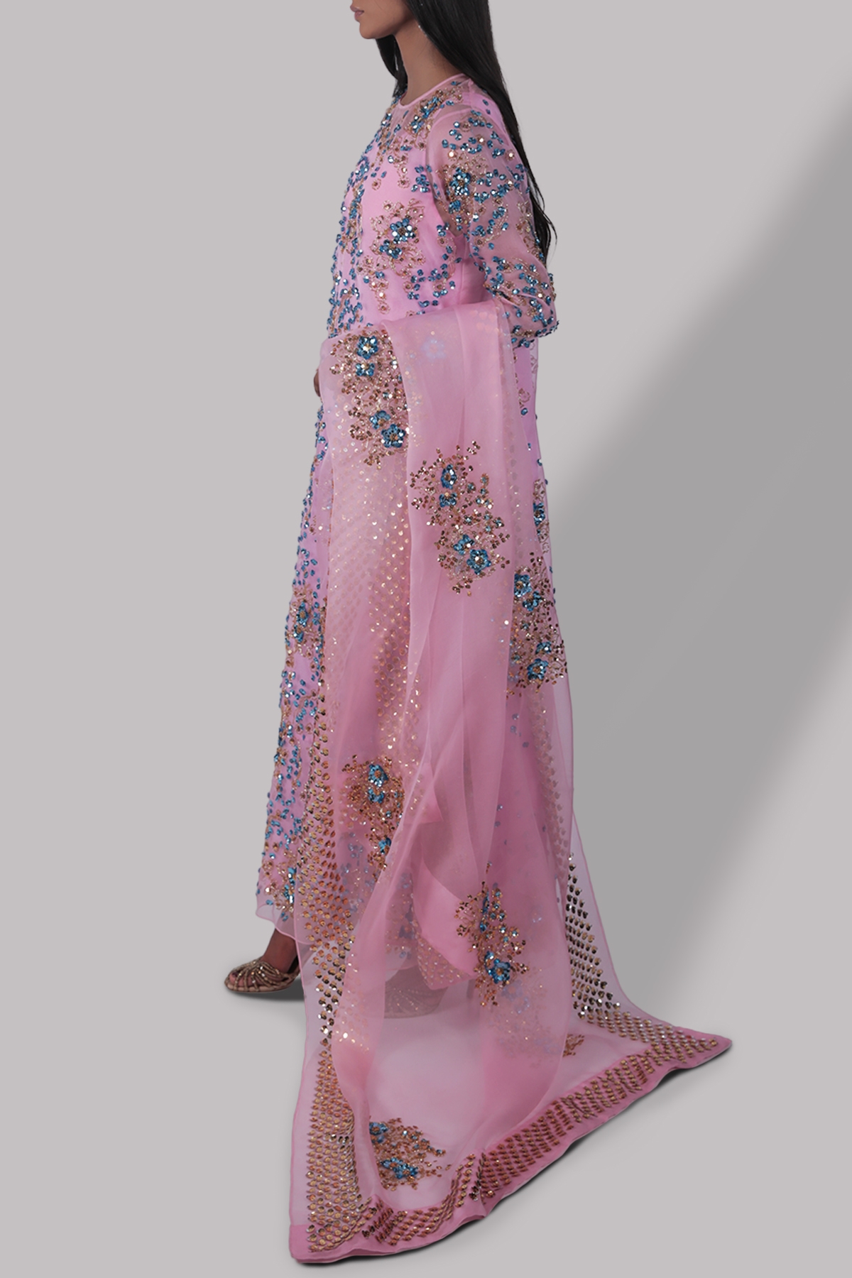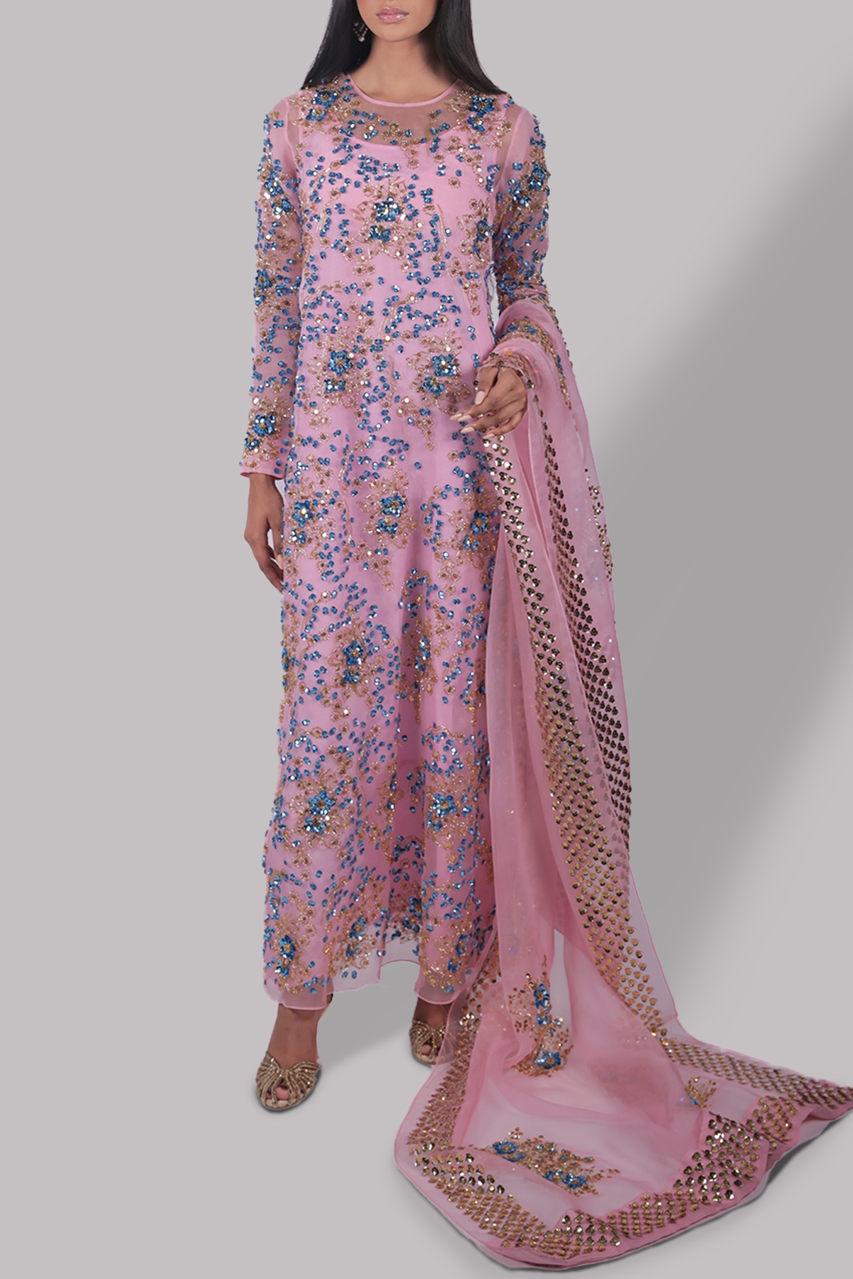 Rose Shadow, medium neckline organza straight maxi, hand embellished with multi-coloured French and Italian sequins. Matching embellished organza dupatta.