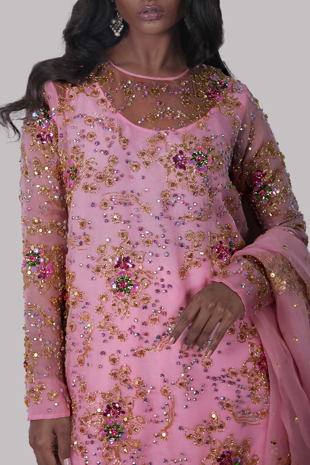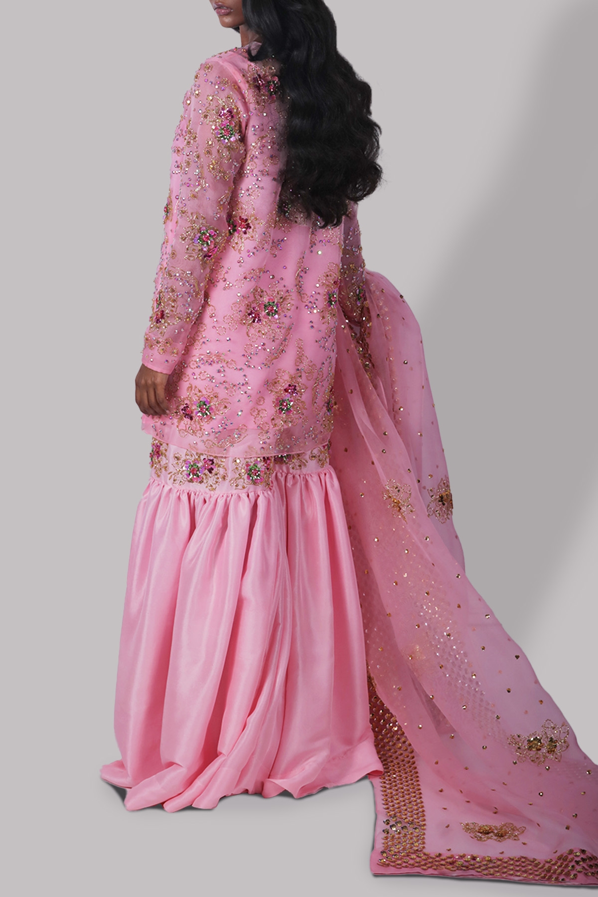 Rose Shadow, medium neckline organza shirt, hand embellished with multi-coloured French and Italian sequins. Matching embellished raw silk gharara and embellished organza dupatta.