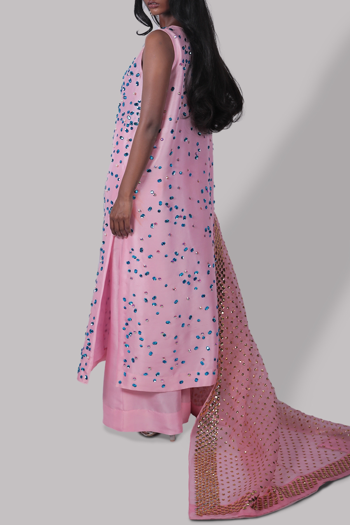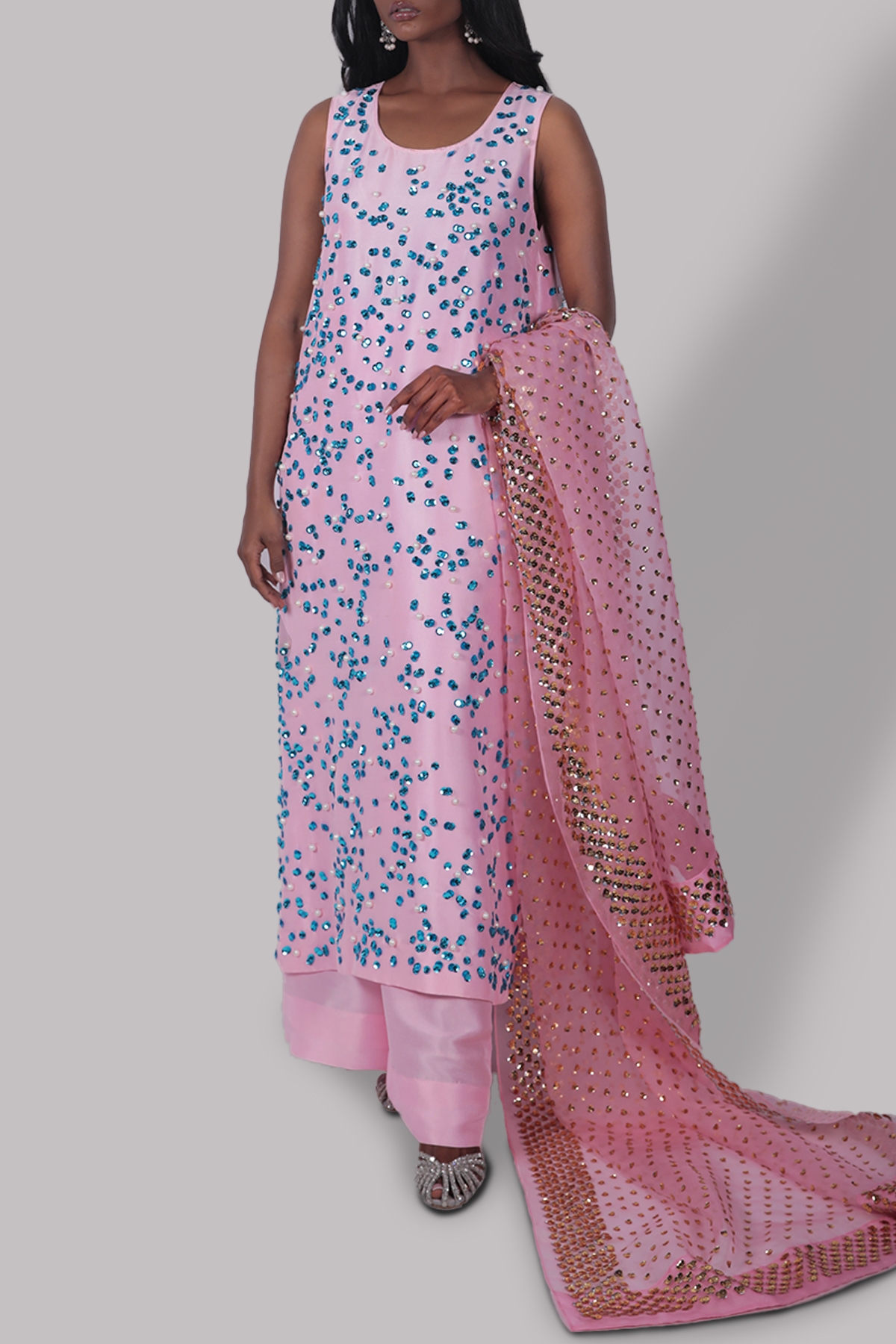 Rose Shadow raw silk deep neck shirt, hand embellished with multi-coloured French and Italian sequins. Matching raw silk wide legged pants and embellished organza dupatta.