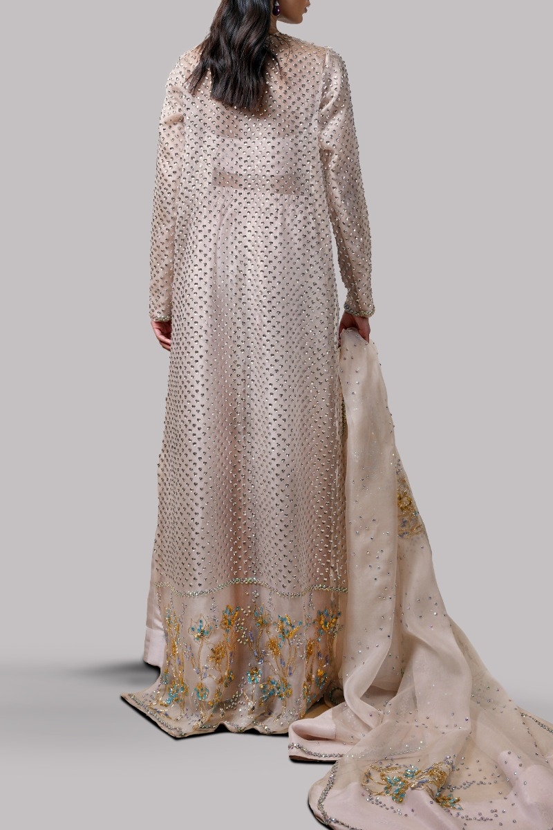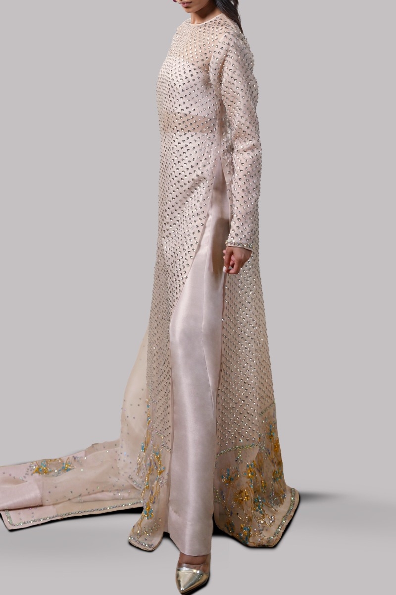 Rose Smoke, Oversized and flowing straight organza long maxi with side slit, exquisitely hand embellished with multi-coloured glittering French and Italian sequins. Its impeccably tailored with matching palazzo pants paired with matching embellished organza dupatta.