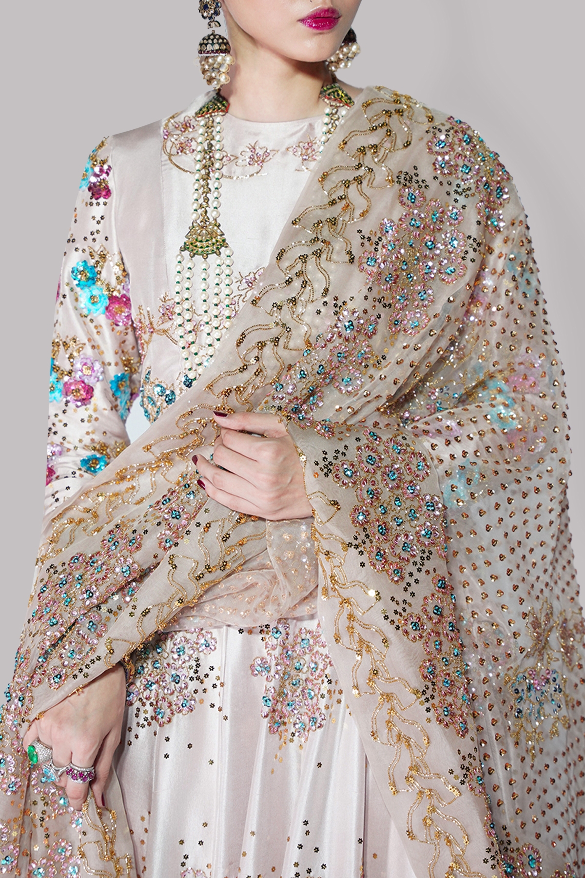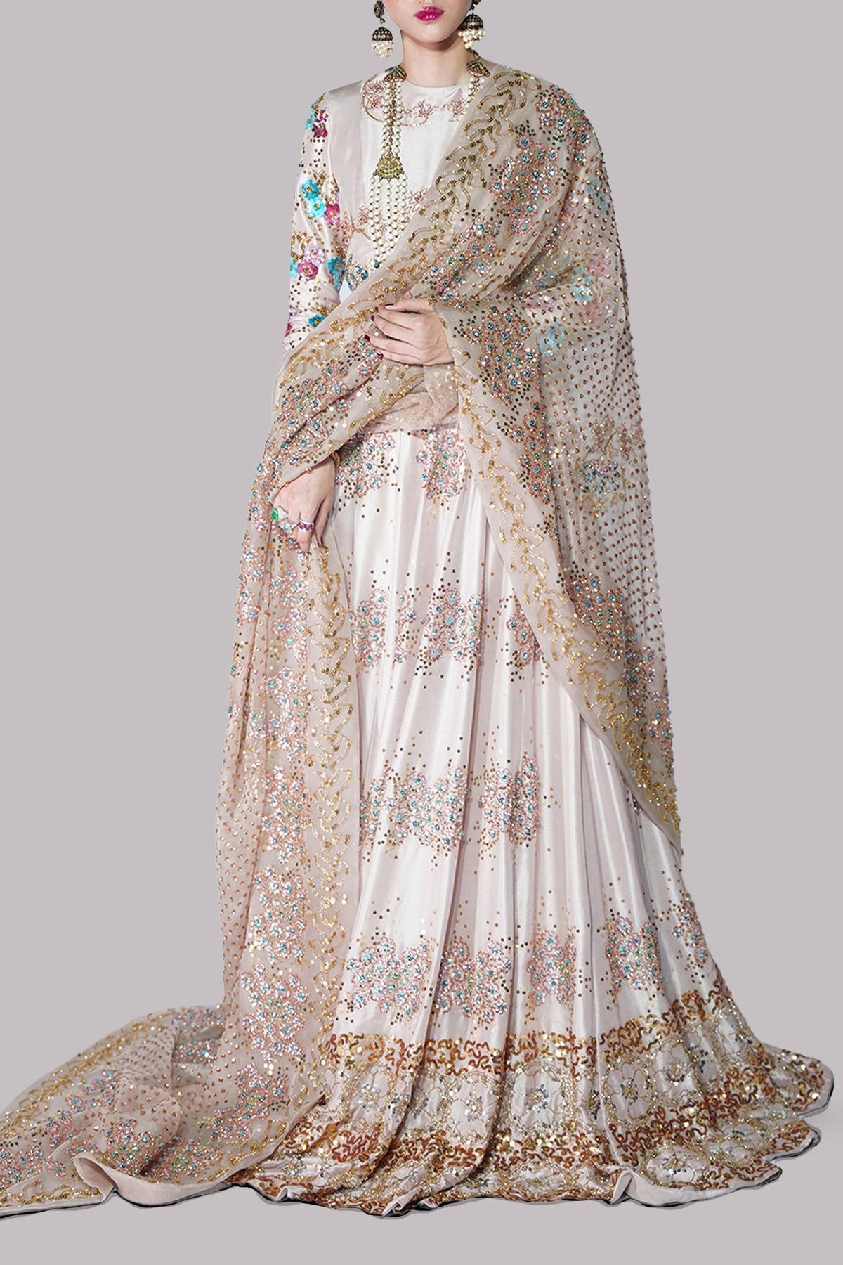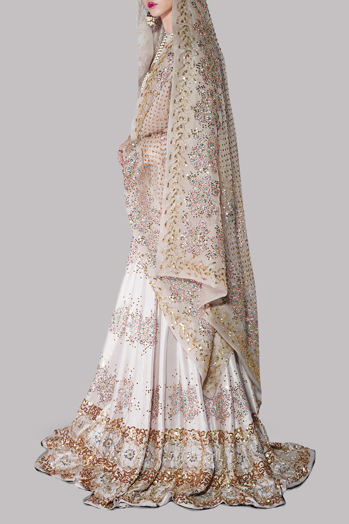 The Rose Smoke blouse is an exquisite display of couture craftsmanship, featuring a rich tapestry of sequin and gemstone-embellished sleeves that exude effortless luxury. The tailored silhouette is paired with a matching multi-hued lehenga, each pleat adorned with intricate embellishments that catch the light with every step. A sheer organza dupatta, meticulously detailed with ornate embellishments, completes this statement-making ensemble.