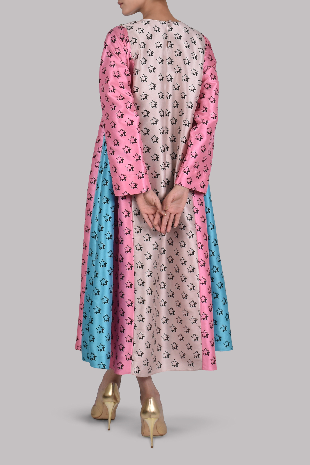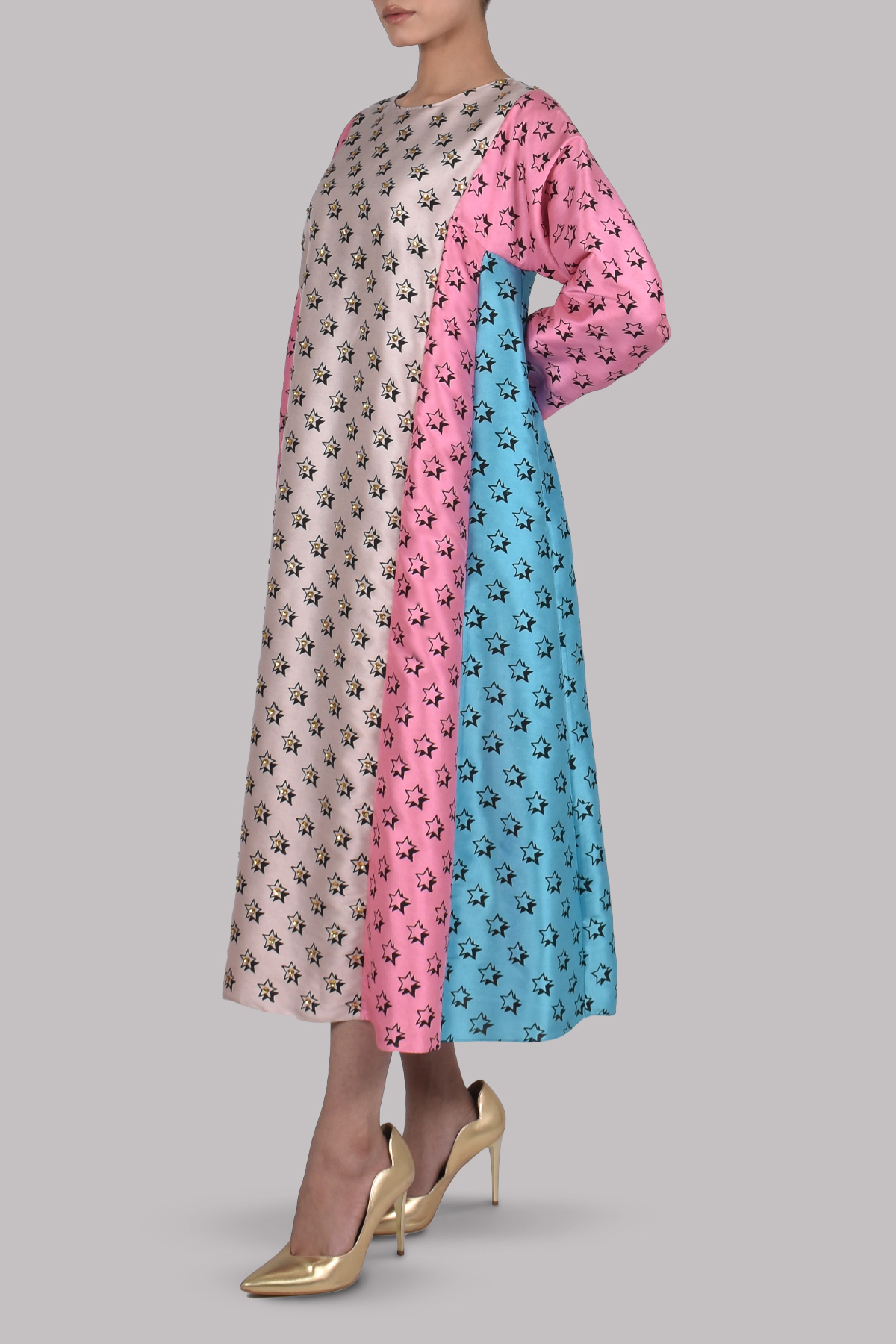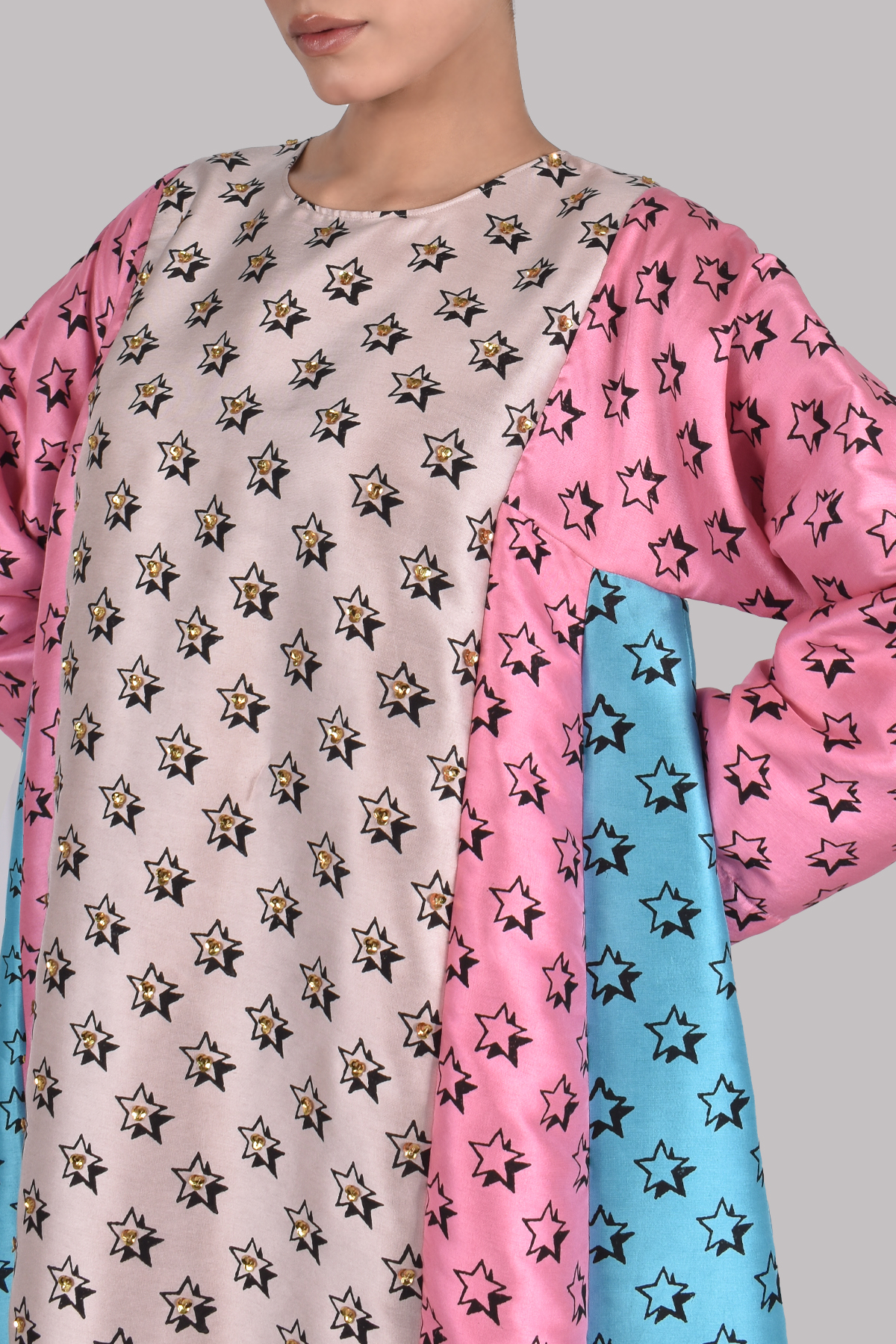 A standout piece featuring panels of Rose Smoke, Plumeria and Scuba Blue raw silk shirt is hand block printed with subtle star motifs and lightly embellished for a touch of celestial charm. Crafted in a relaxed yet tailored silhouette, it balances bold colour with refined detail.