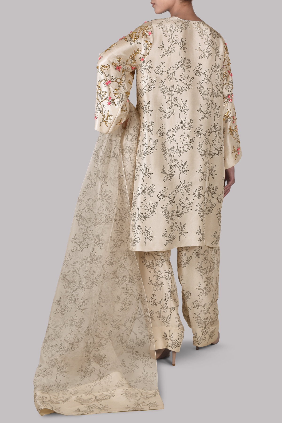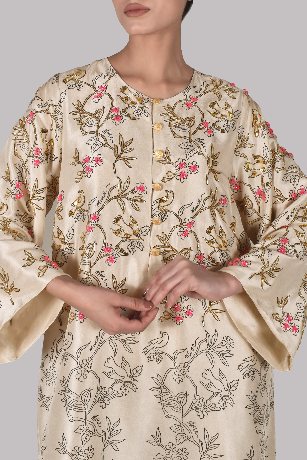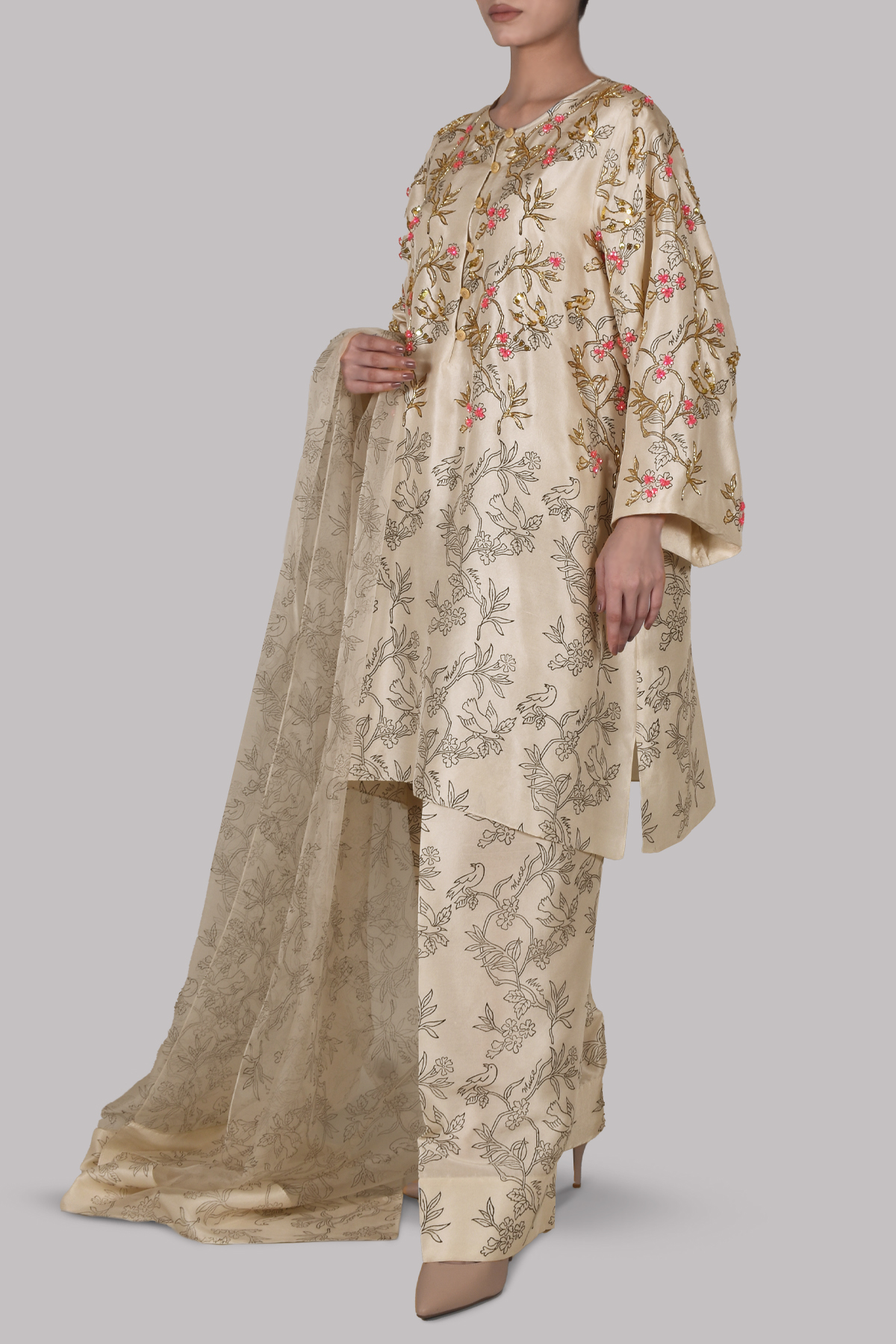 A harmonious blend of tradition and artistry, this Rugby Tan raw silk tunic features exquisite hand embellishments near neckline with French buttons complemented by delicate block-printed details, creating depth and texture across its graceful silhouette. Paired with a matching raw silk shalwar, the look carries an understated elegance. An airy organza dupatta completes the ensemble.