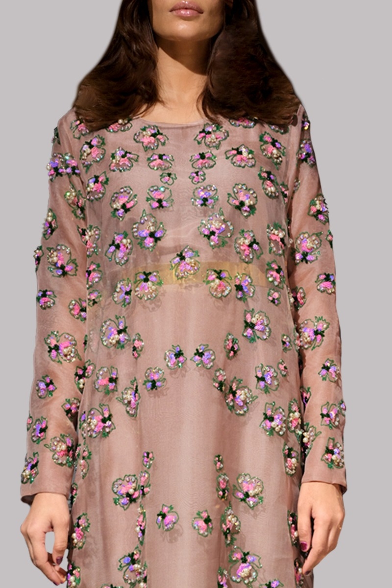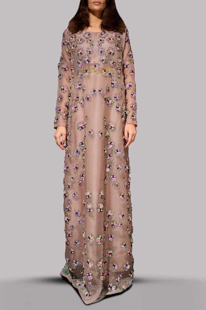 Rugby Tan, Oversized and flowing straight organza maxi dress, intricate hand embellished with multi-coloured glittering French and Italian sequins. Pockets add a cool sophisticated feel to this ultra-glamorous maxi dress.