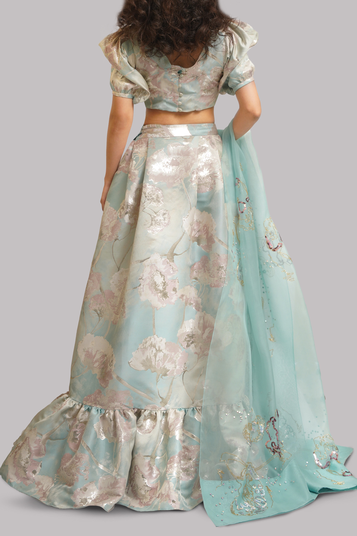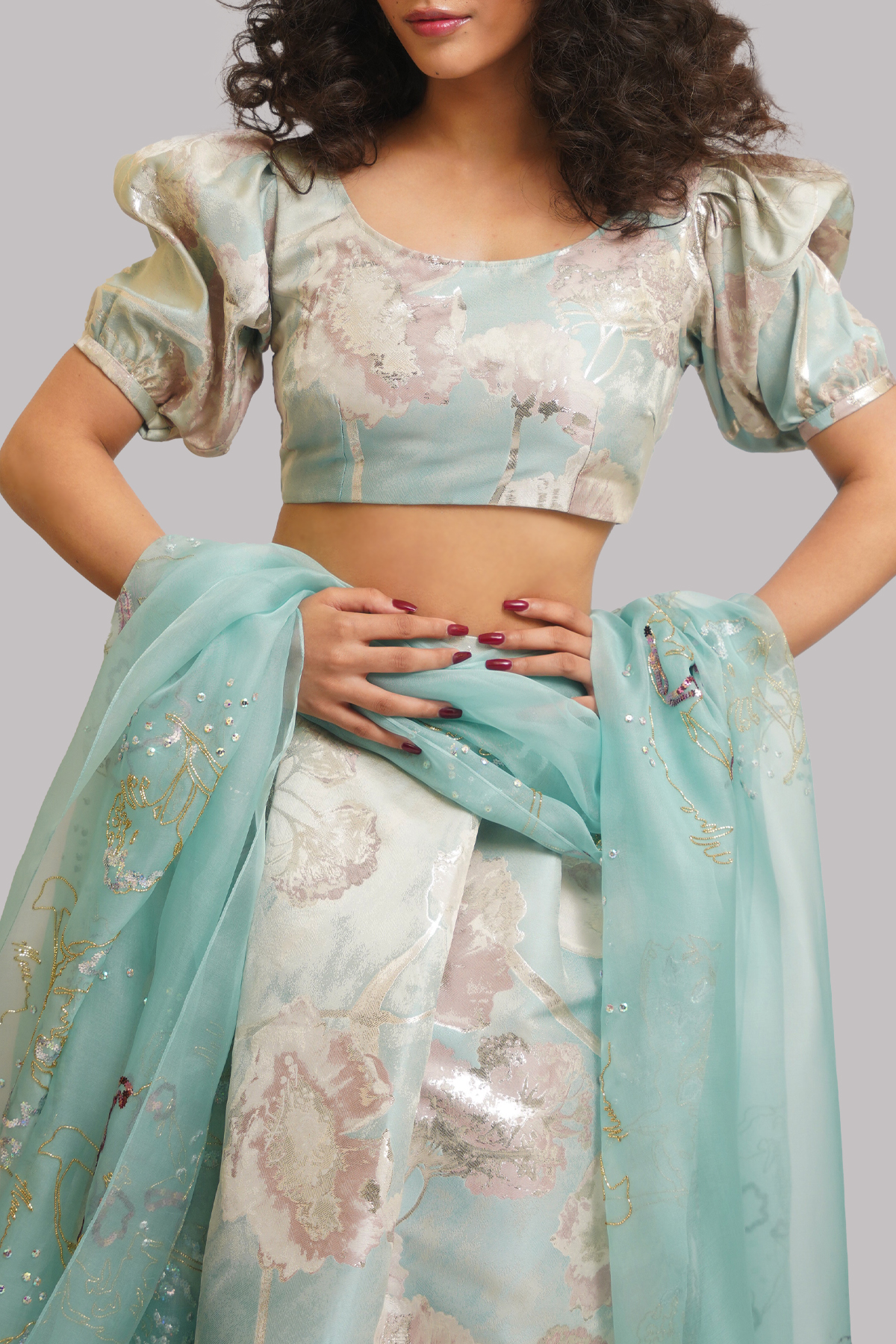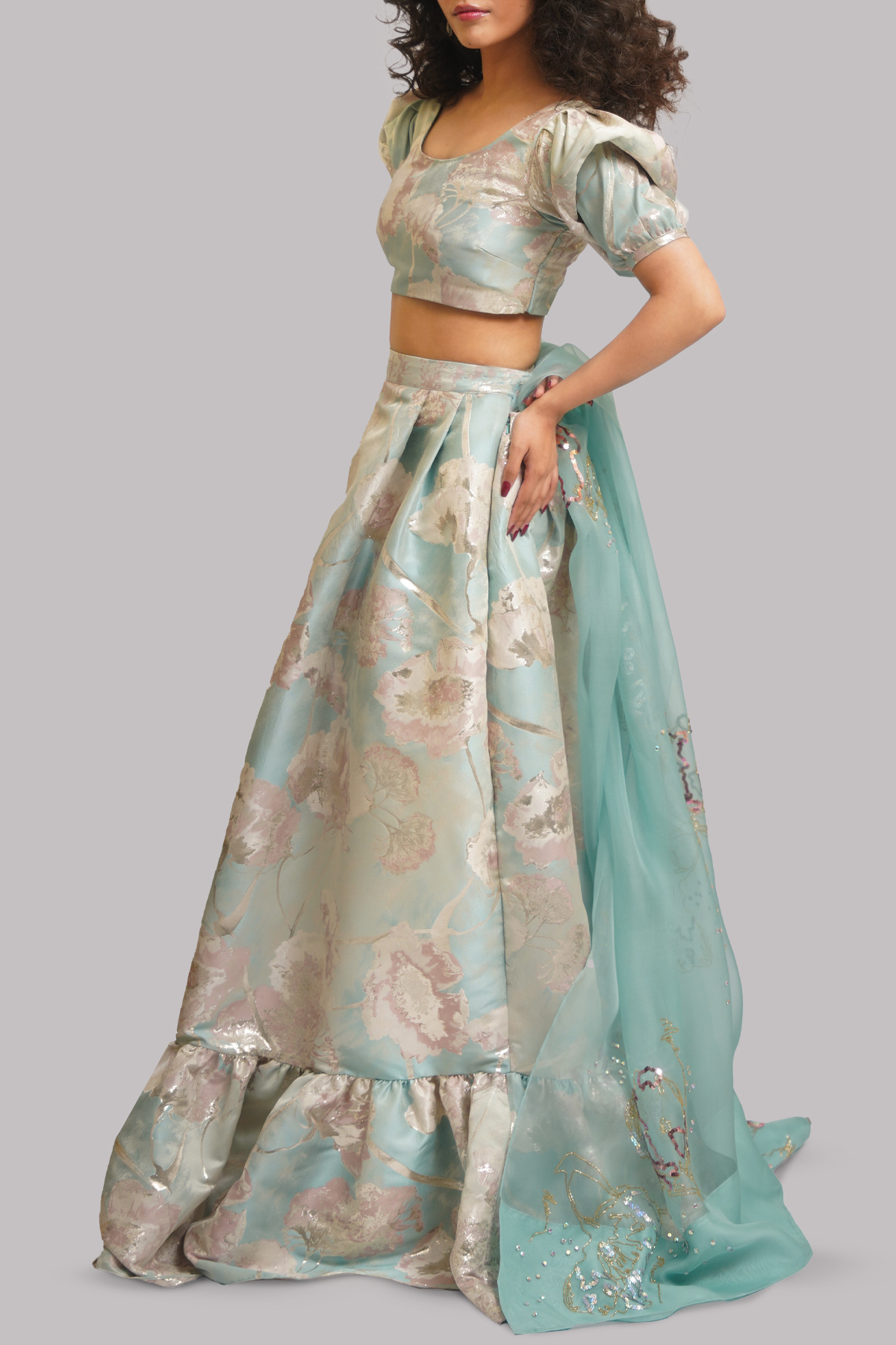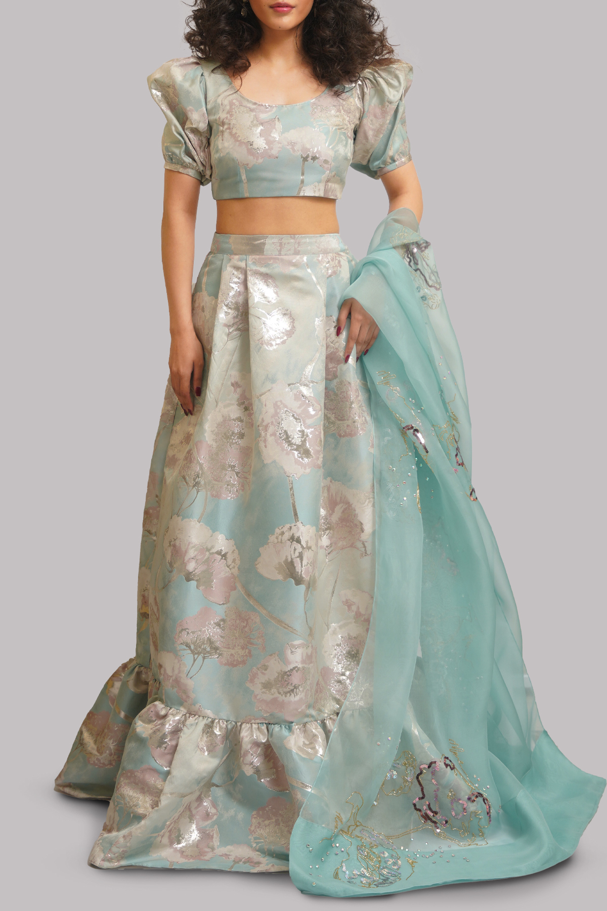 A serene Saltwater Slide Italian Cloqué ensemble, featuring a voluminous puffy-sleeved blouse and a matching layered skirt that flows with sculptural elegance paired with an embellished organza dupatta.