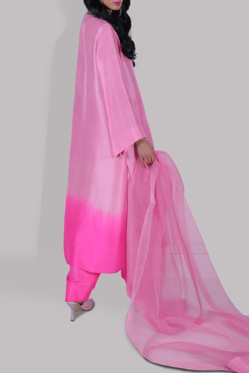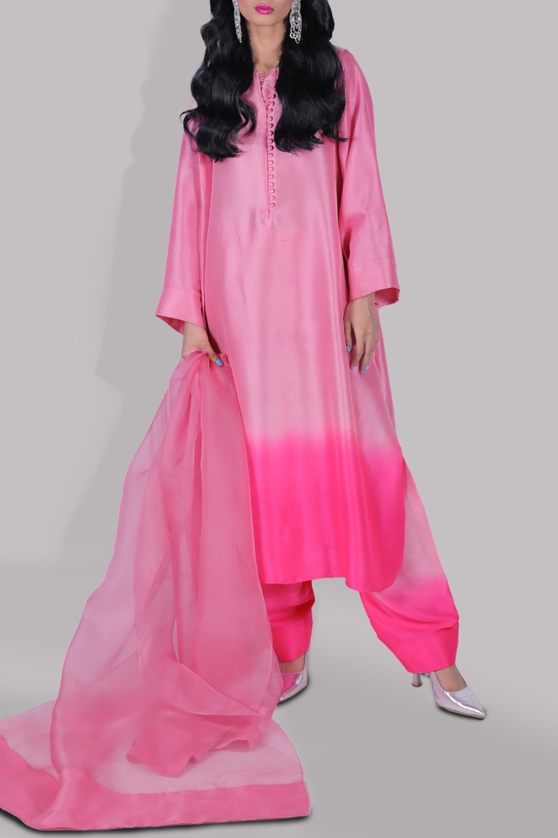 SACHET PINK & DIVA PINK OMBRE OVERSIZED CLOSE NECK RAW SILK SHIRT EFFORTLESS AND CHIC WITH VIVID AND SPARKLING HUES OF CONTRASTING COLOR, IT’S IMPECCABLY TAILORED WITH MATCHING RAW SILK SHALWAR PANTS AND ORGANZA DUPATTA. THIS LOOSE BREEZY SET WITH RICH COLOR PALETTE IS FLAWLESS FOR BALMY DAYS.