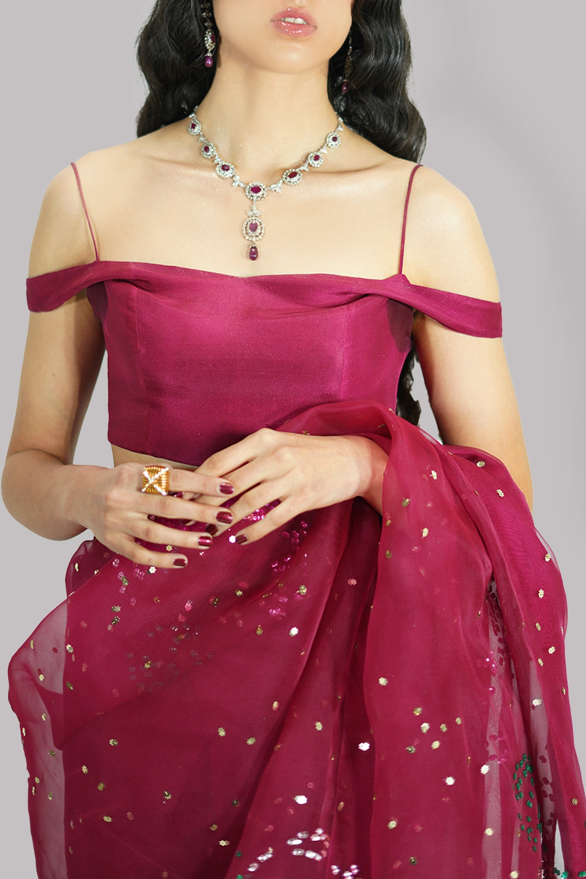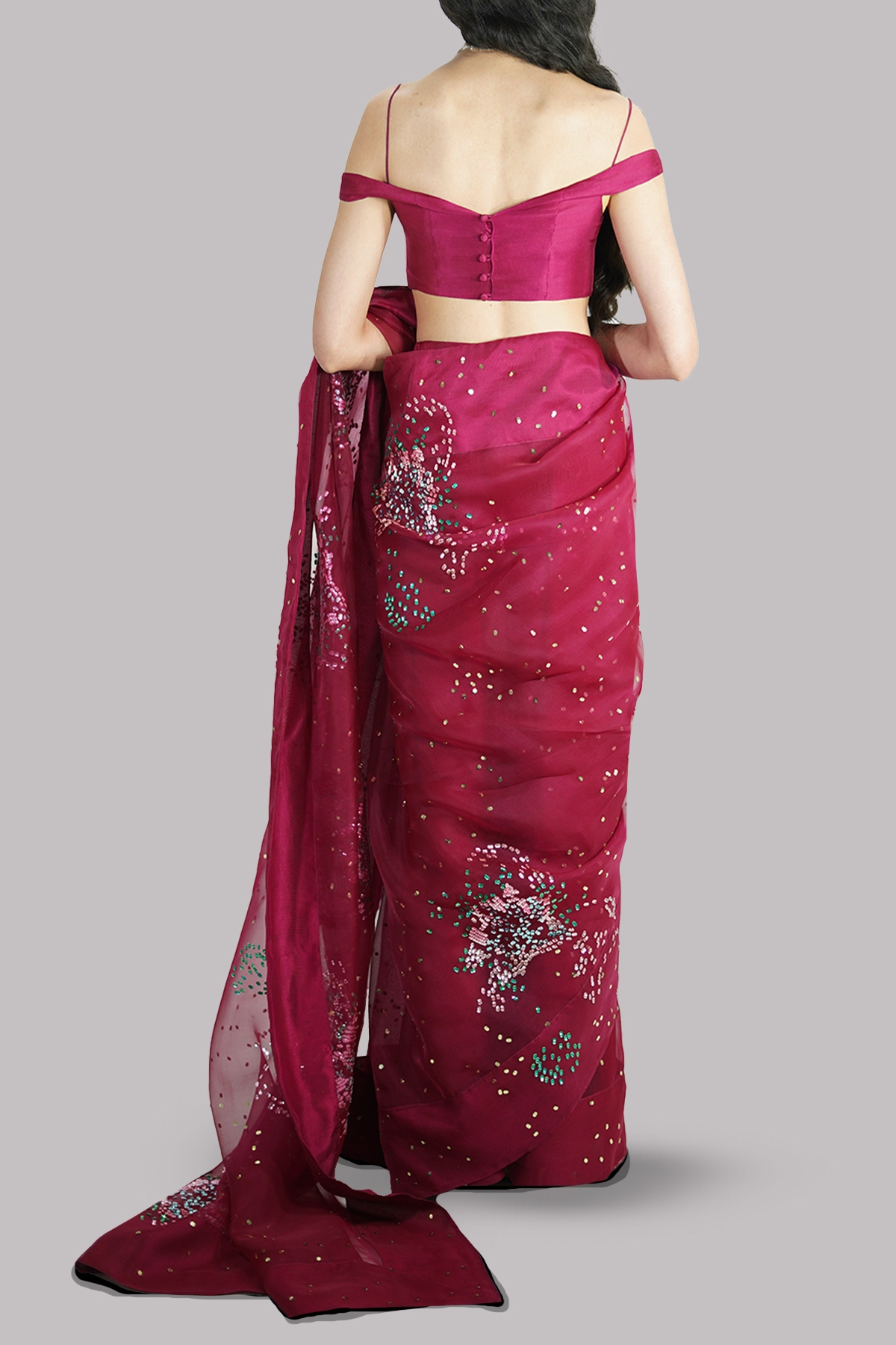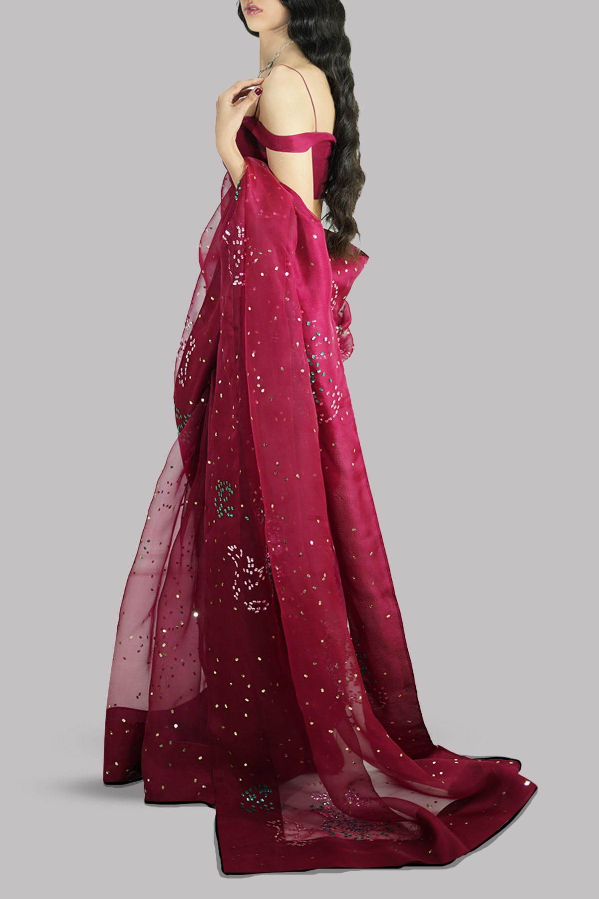 Scooter red embellished organza sari adorned with gold and multi coloured sequins. Impeccably tailored with matching detailed off-shoulder blouse.