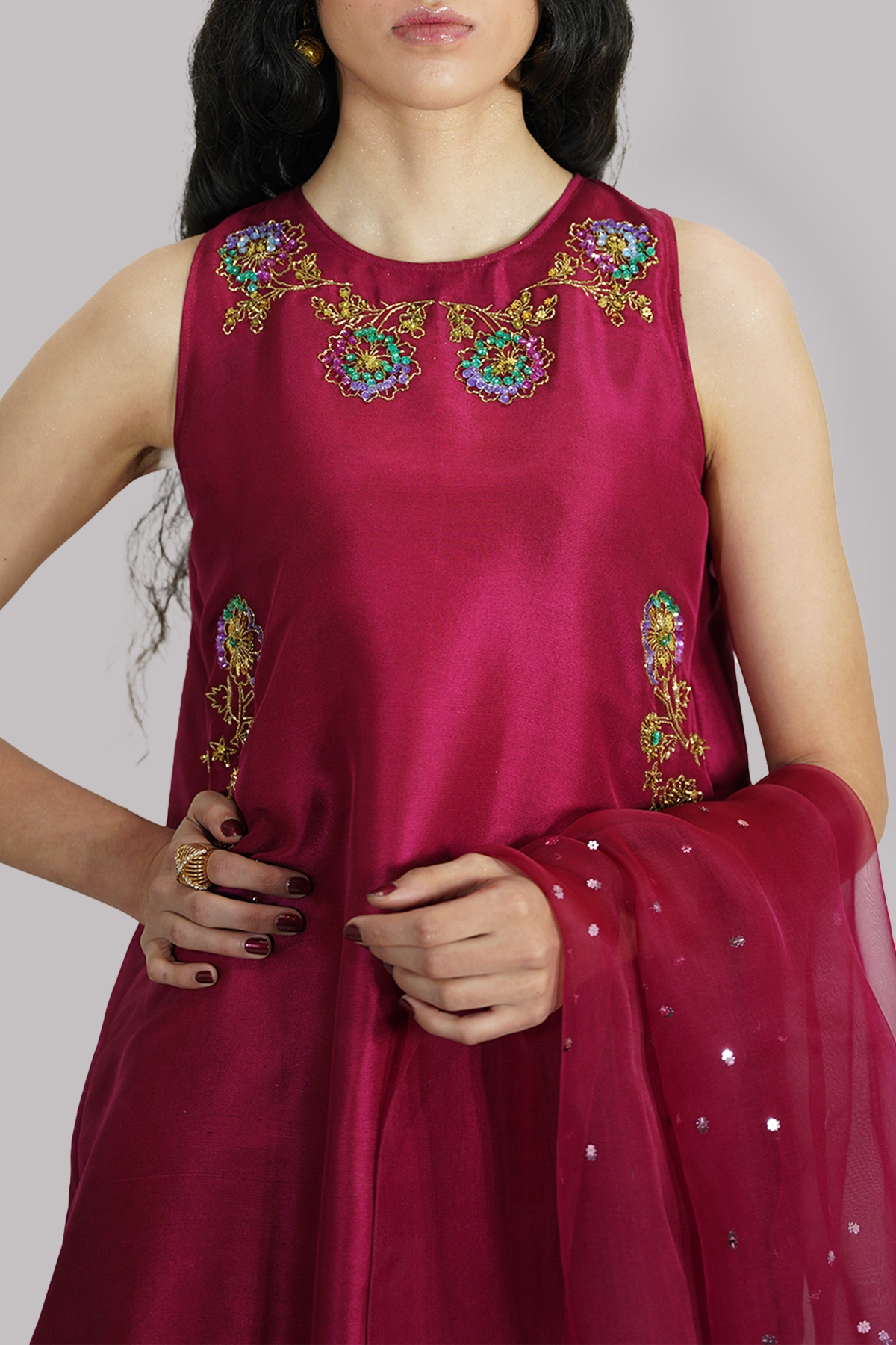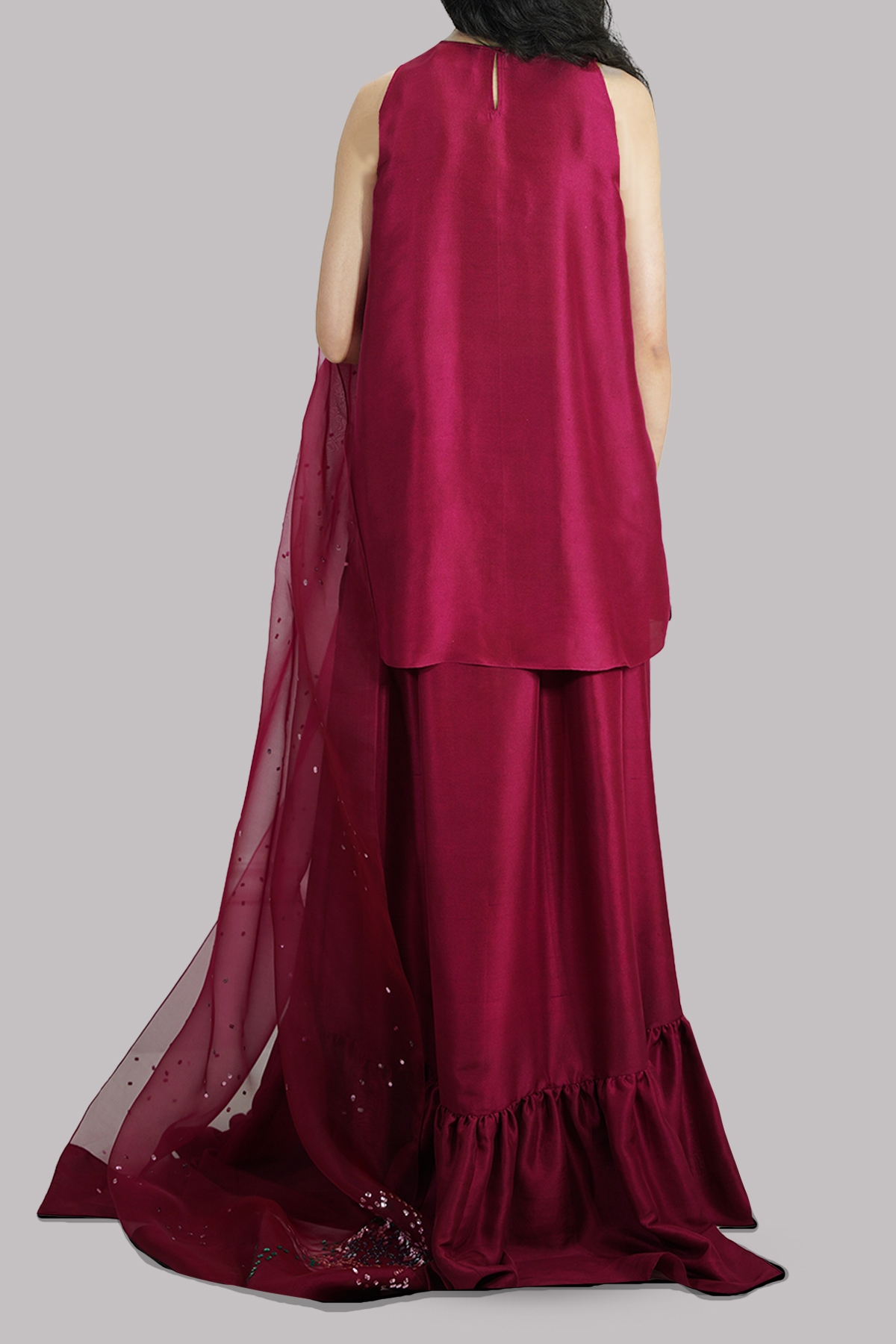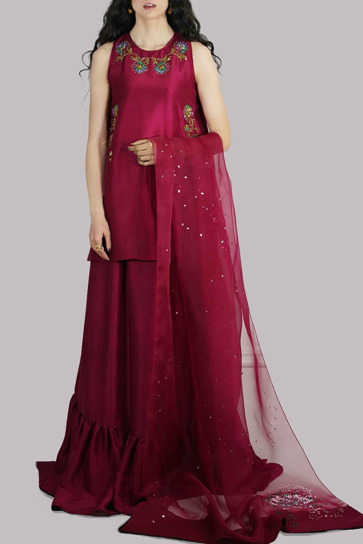 Discover an enchanting three-piece set featuring a scooter-embellished raw silk tunic, complete with a beautifully tailored lehenga and a matching dupatta. Adorned with shimmering gold and a vibrant array of multi-coloured sequins, this exquisite ensemble is designed for those who seek elegance and style.