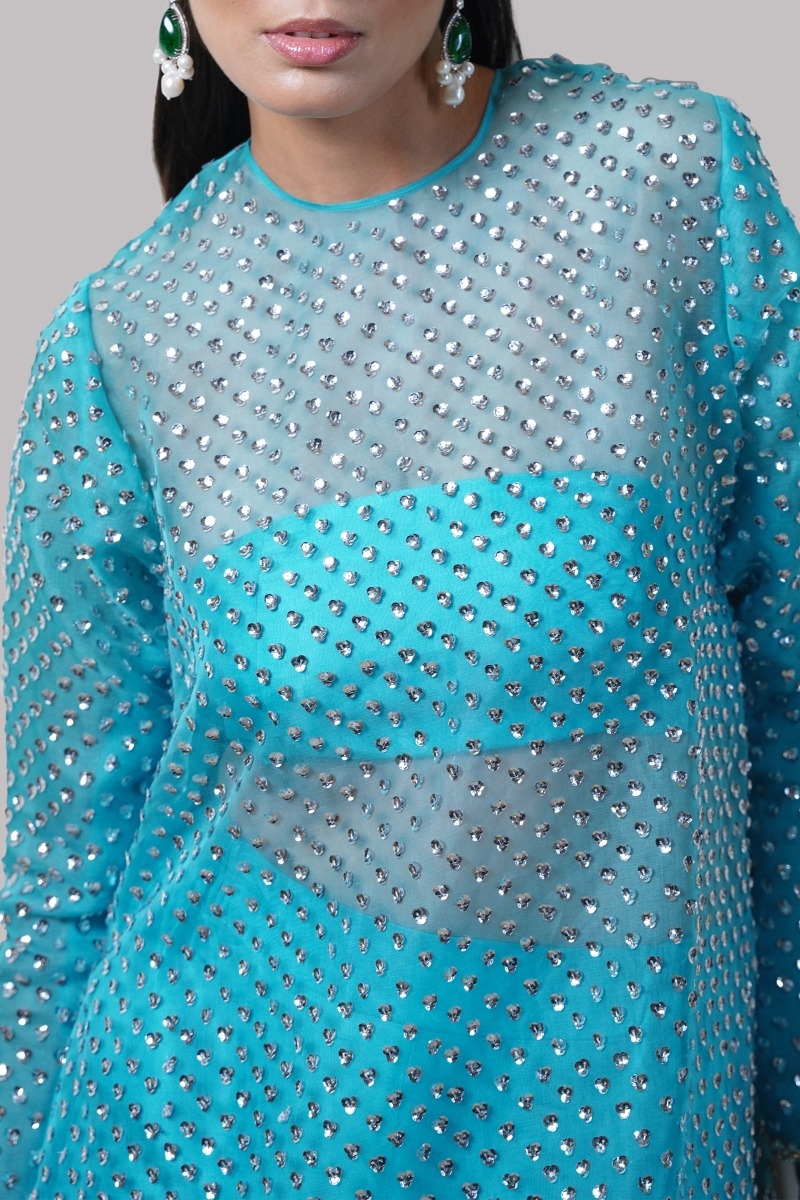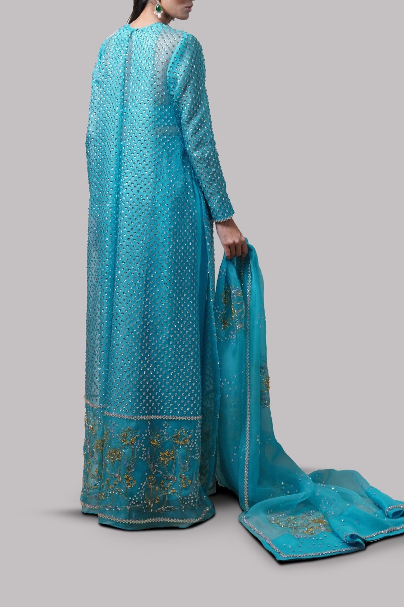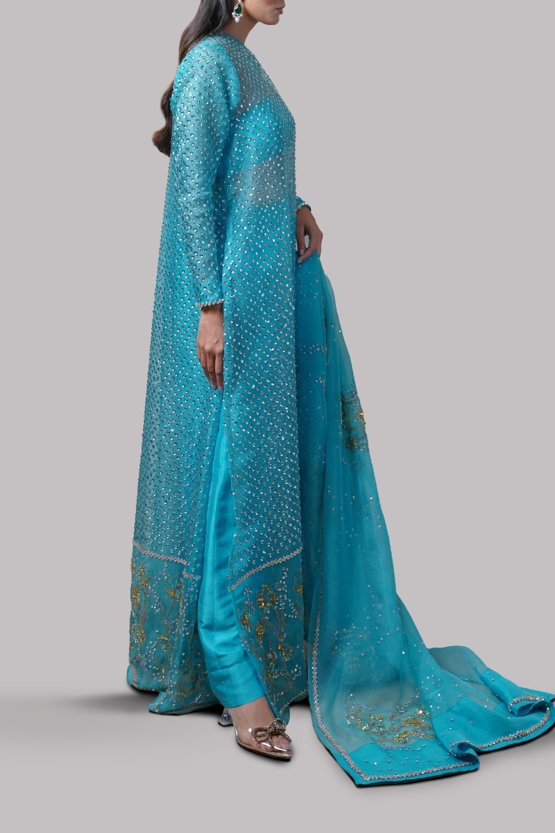 Scuba Blue, Oversized and flowing straight organza long maxi with side slit, exquisitely hand embellished with multi-coloured glittering French and Italian sequins. Its impeccably tailored with matching palazzo pants paired with matching embellished organza dupatta.