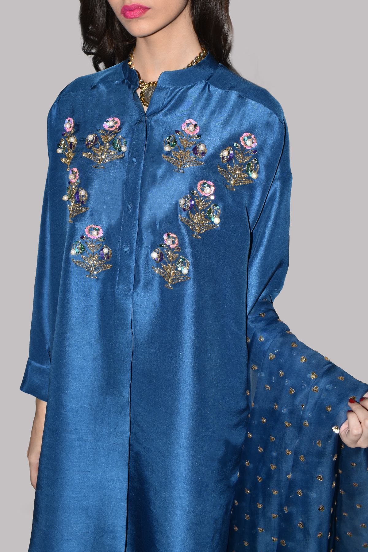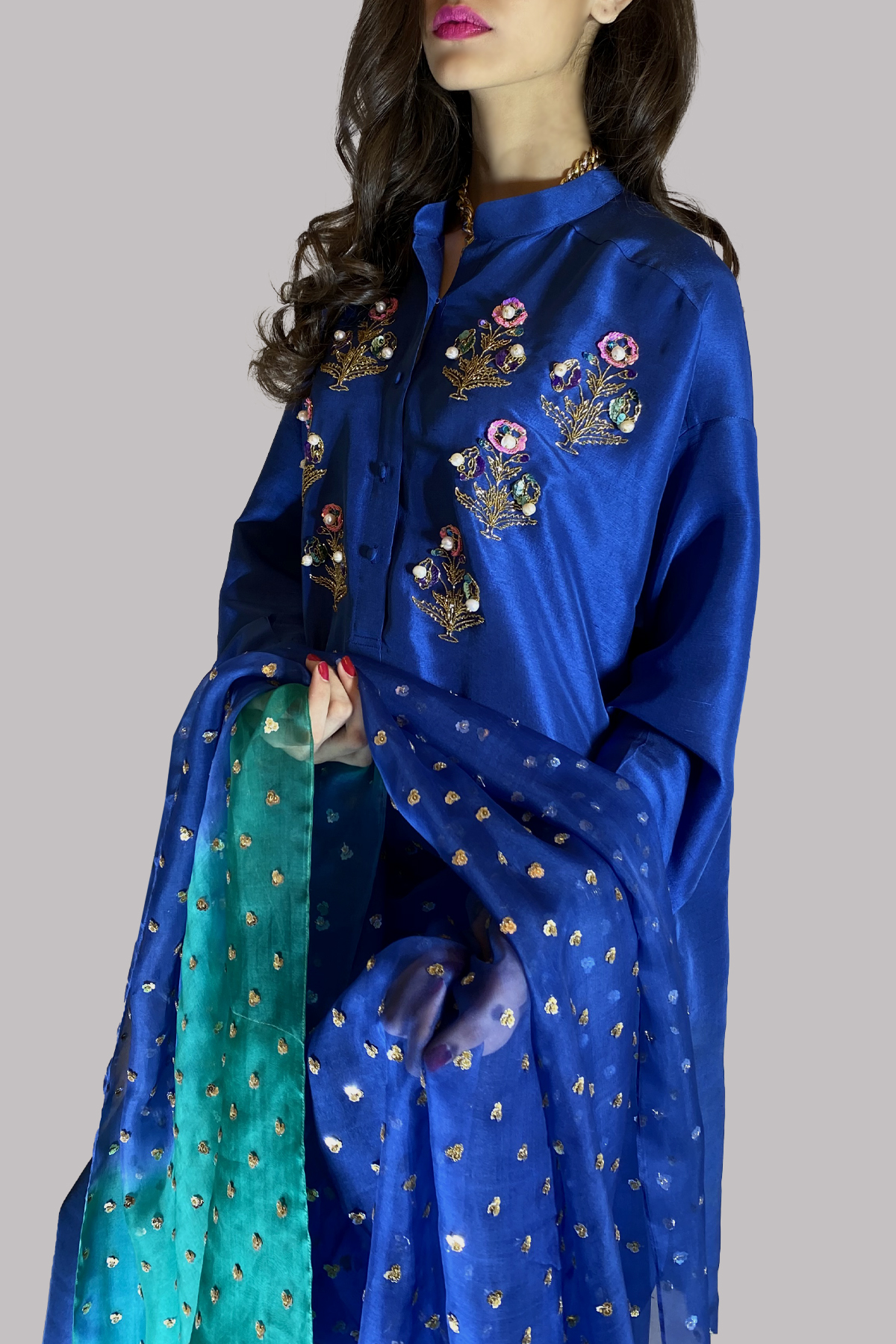 This set features a Seaport Blue raw silk tunic adorned delicate embellishments. Paired with a coordinating wide legged pants and a sheer organza dupatta in Seaport blue and Ultramarine hues.