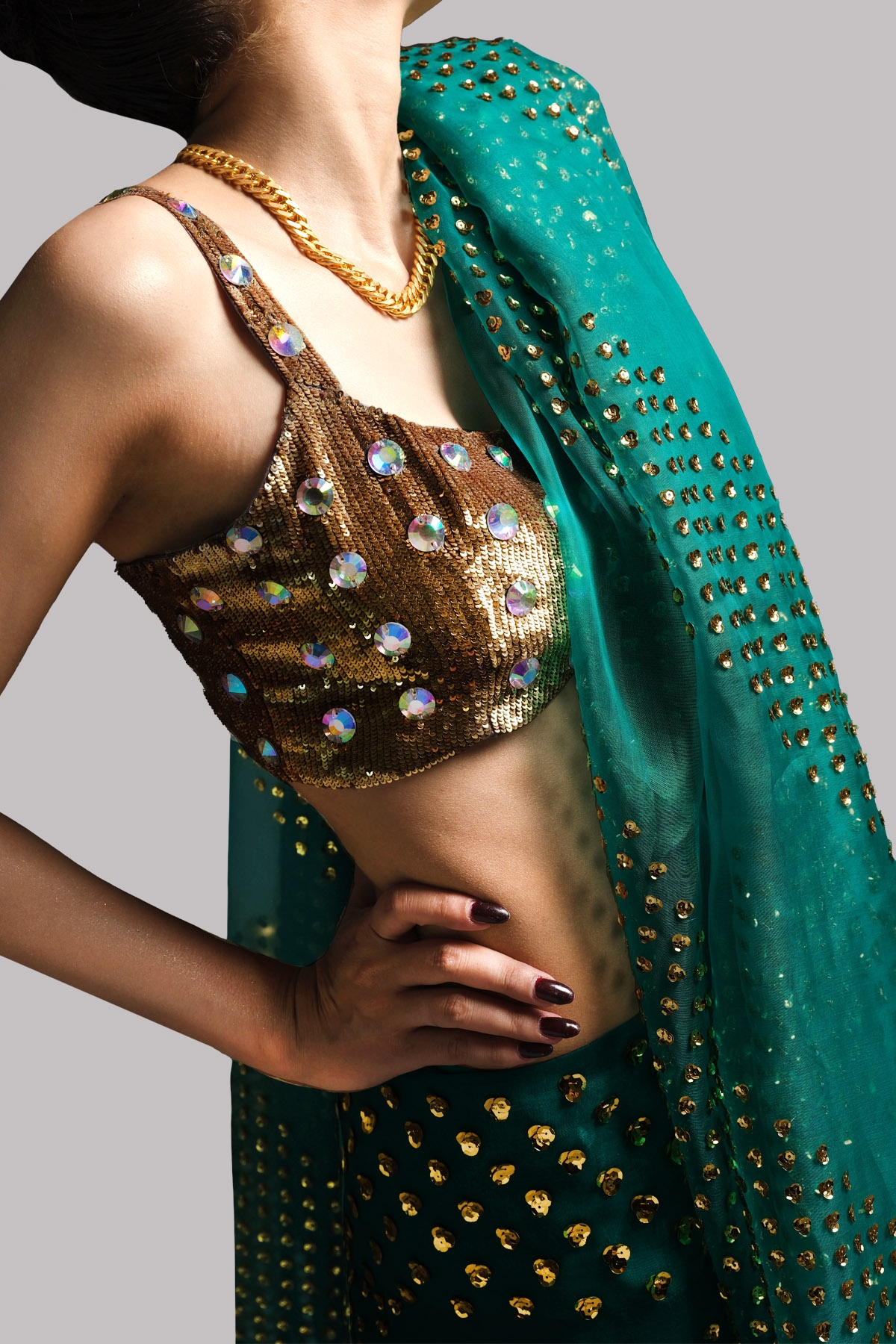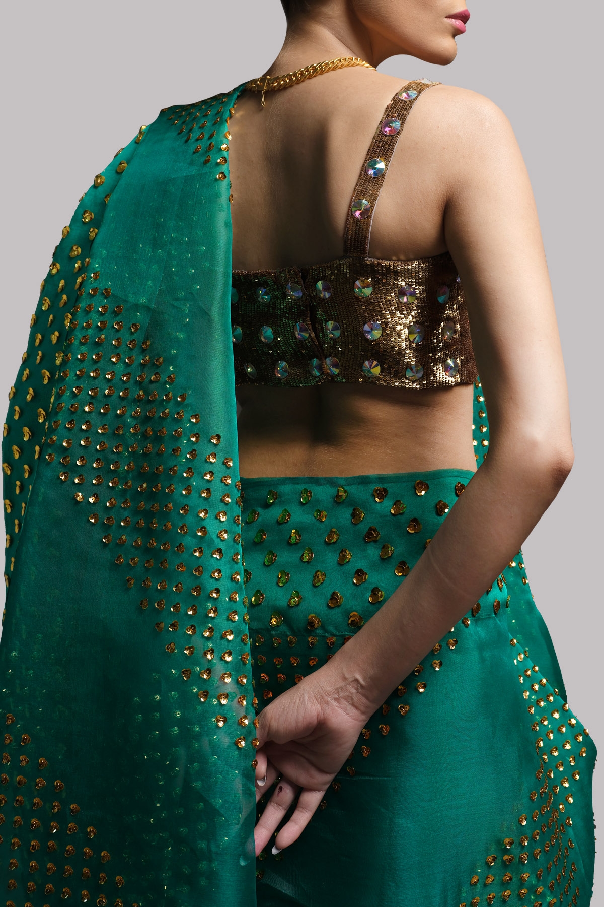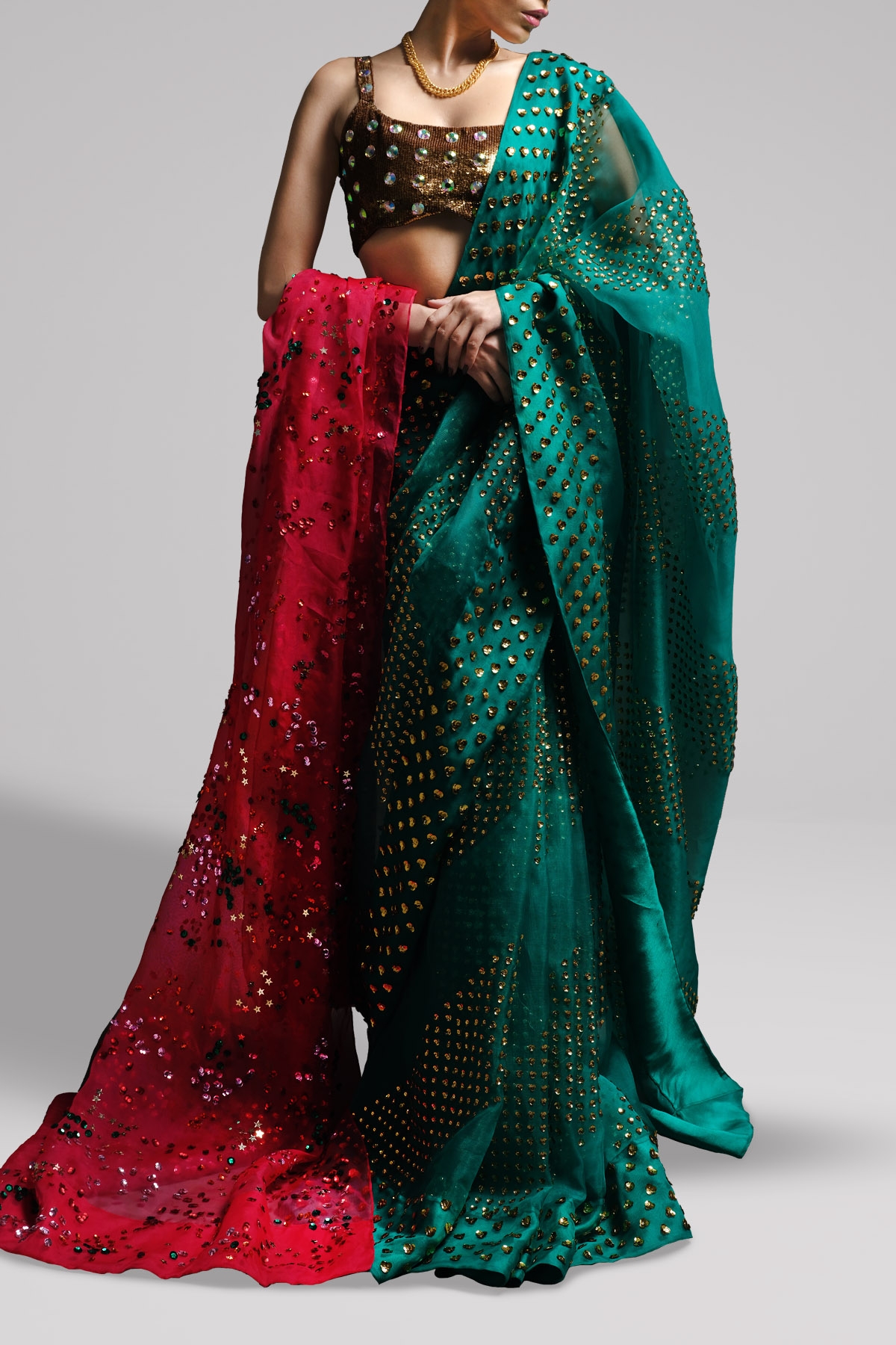 Shady Glade organza sari with matching embellished dupion cropped blouse. Sari is hand embellished with freshwater pearls, glistening sequins, dazzling crystals and gold beads. This sensational sari is no exception. The sari has stitched pleats for ease of wearing. Silk petticoat included.