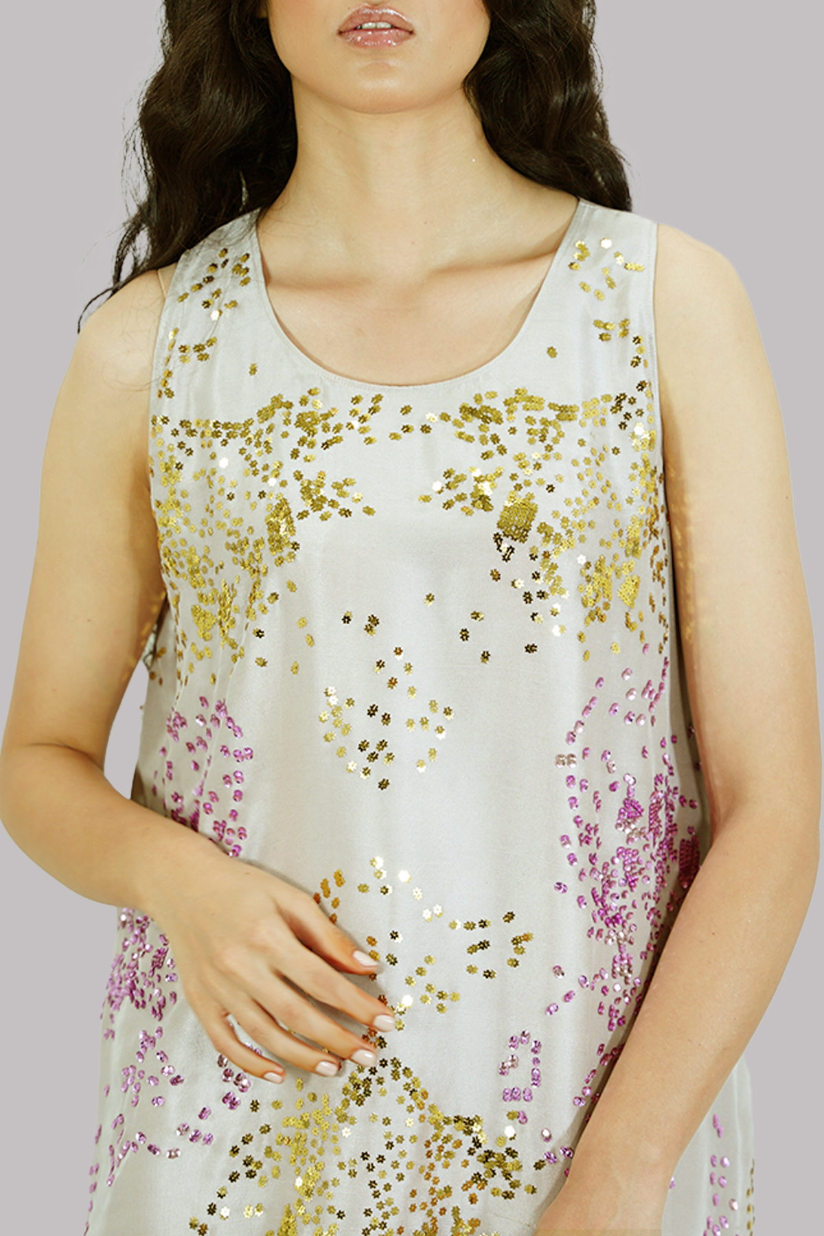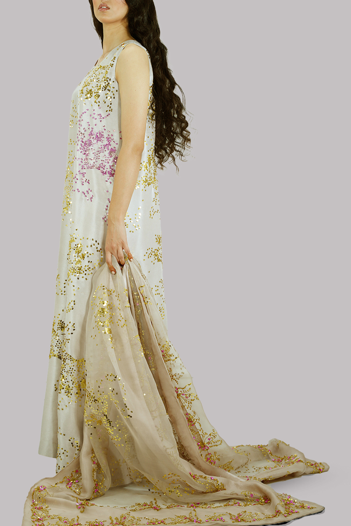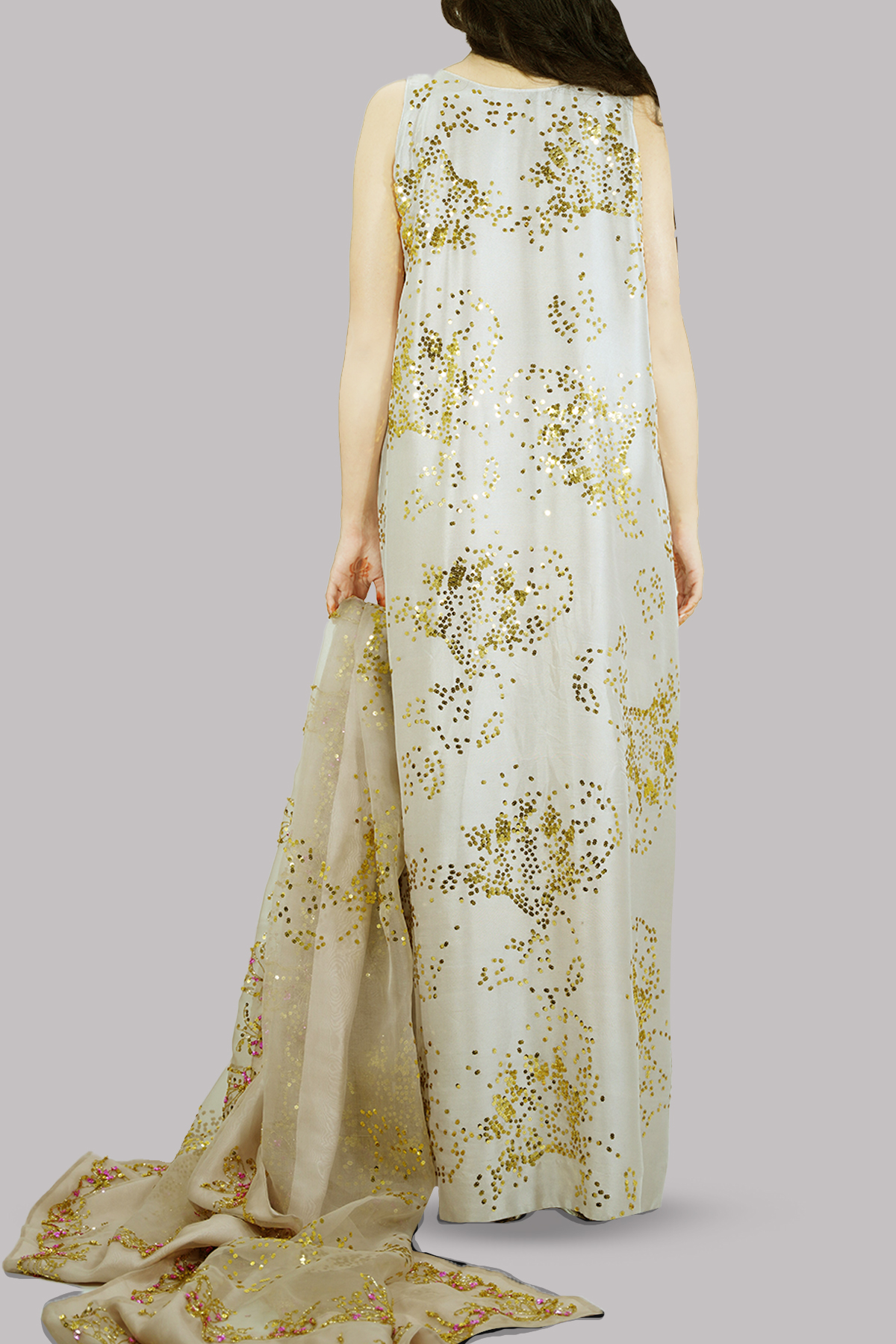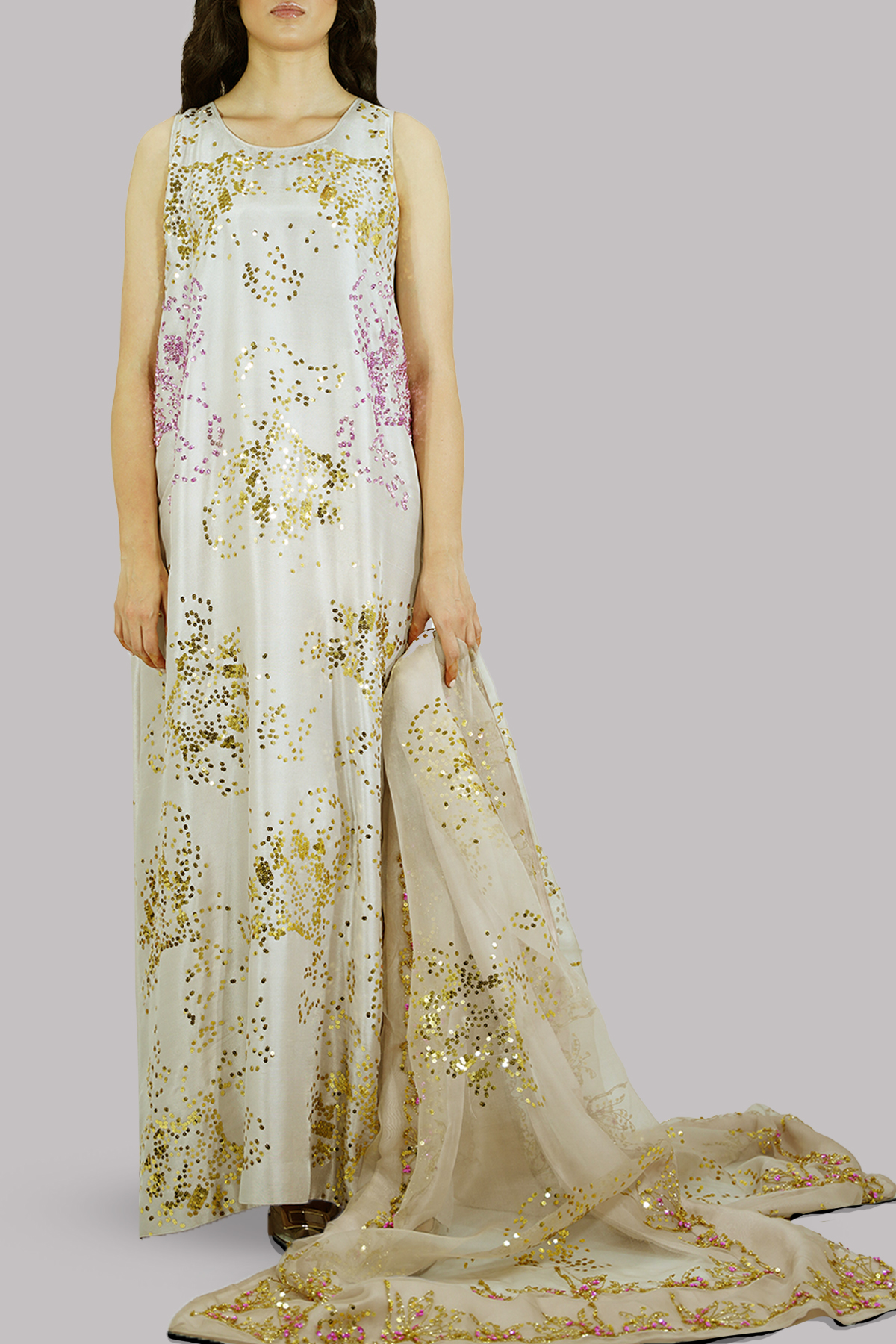 Silver Grey embellished maxi adorned with gold-silver coloured sequins. Impeccably tailored with matching detailed embellished organza dupatta.