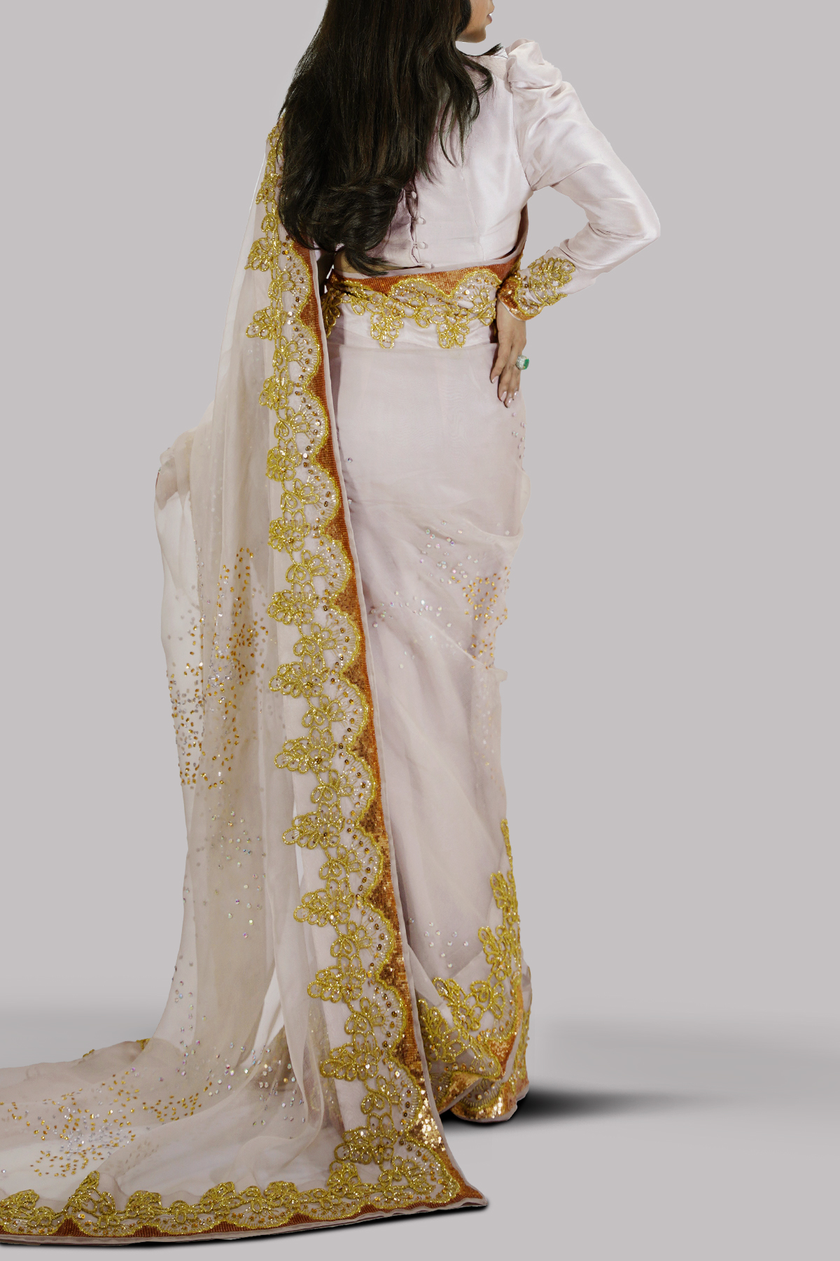 Silver Gray organza sari and blouse hand embellished with intricate embellishments of gold glittering sequins. Matching full sleeves cropped blouse. This is a stylish and perfect three piece look. The sari has stitched pleats for ease of wearing. Matching stitched underskirt included.