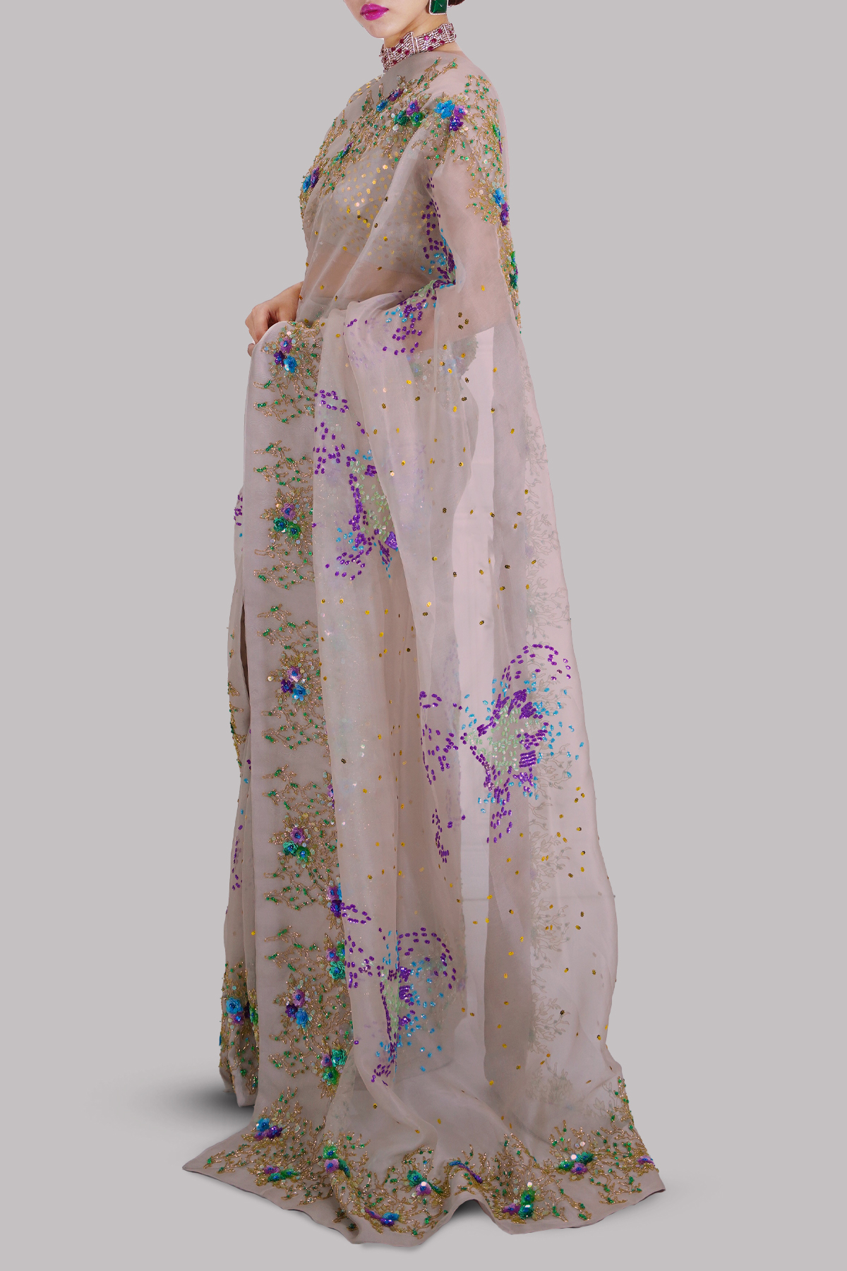 Silver Grey Embellished Organza Sari  530,000
