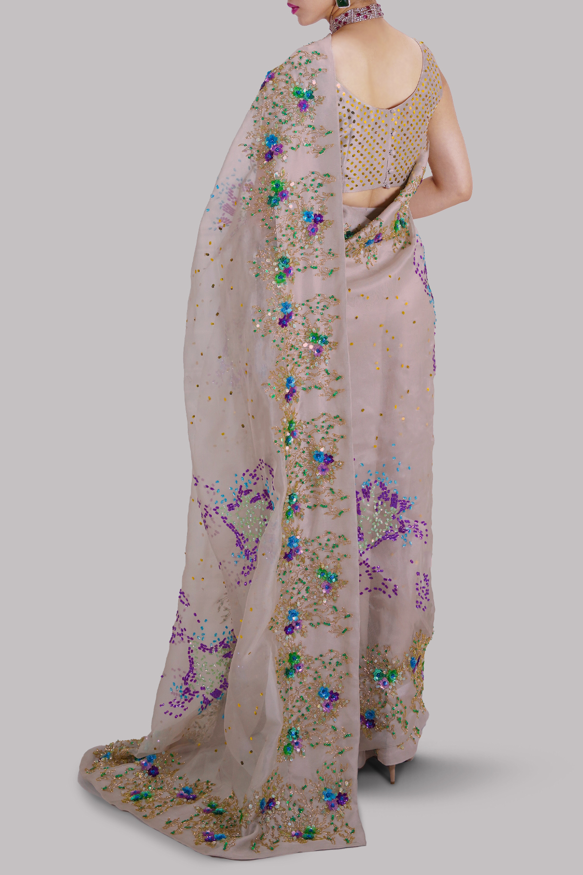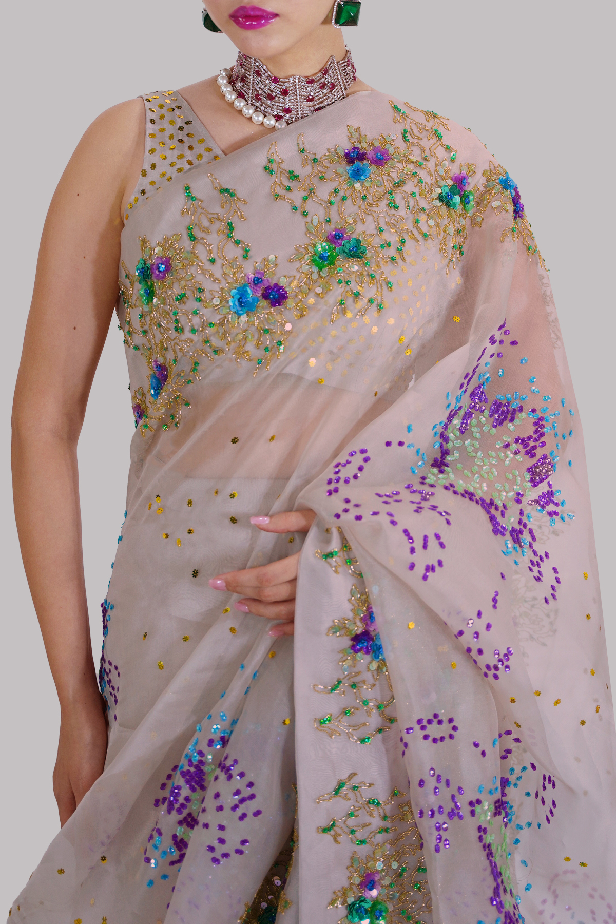 A Silver Grey Organza Sari adorned with delicate embellishment and finished with a heavily embellished border, paired with a matching raw silk blouse detailed with shimmering sequins.