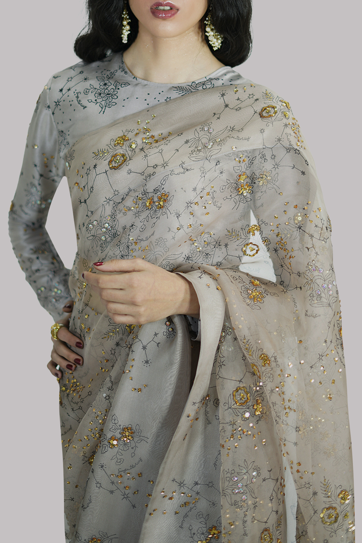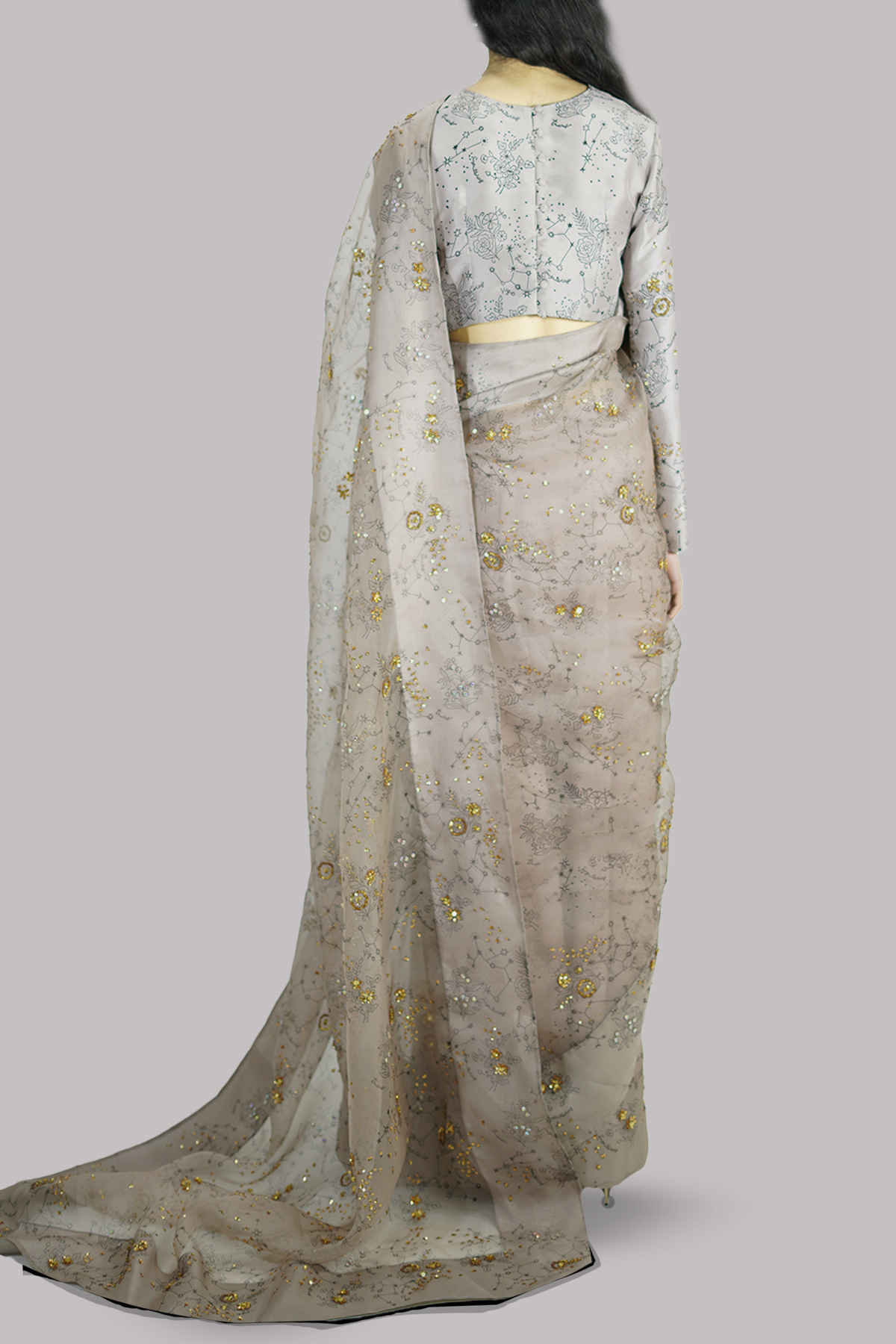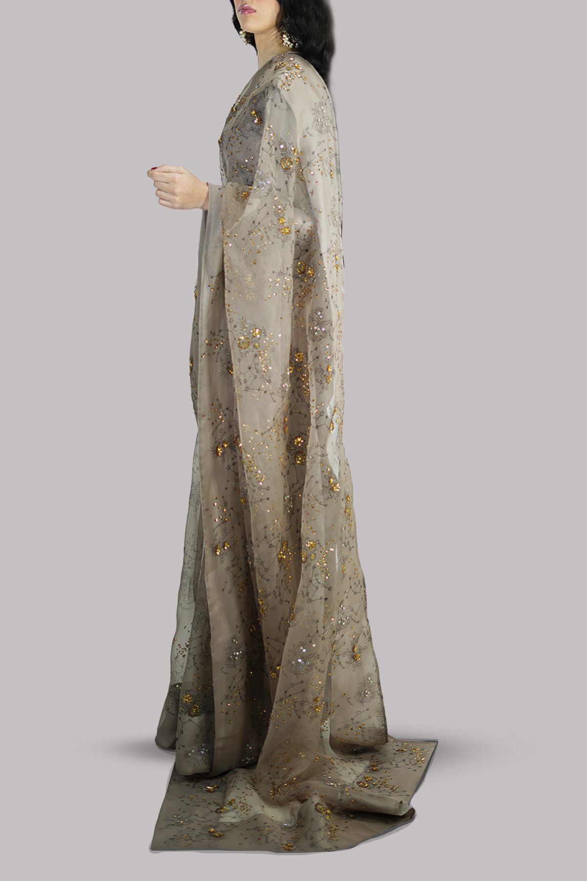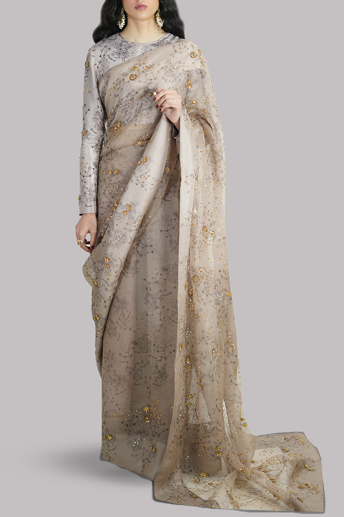 Simply Taupe block-printed embellished organza sari adorned with gold sequins and sparkling crystals. Impeccably tailored with matching detailed blouse with straight sleeves.
