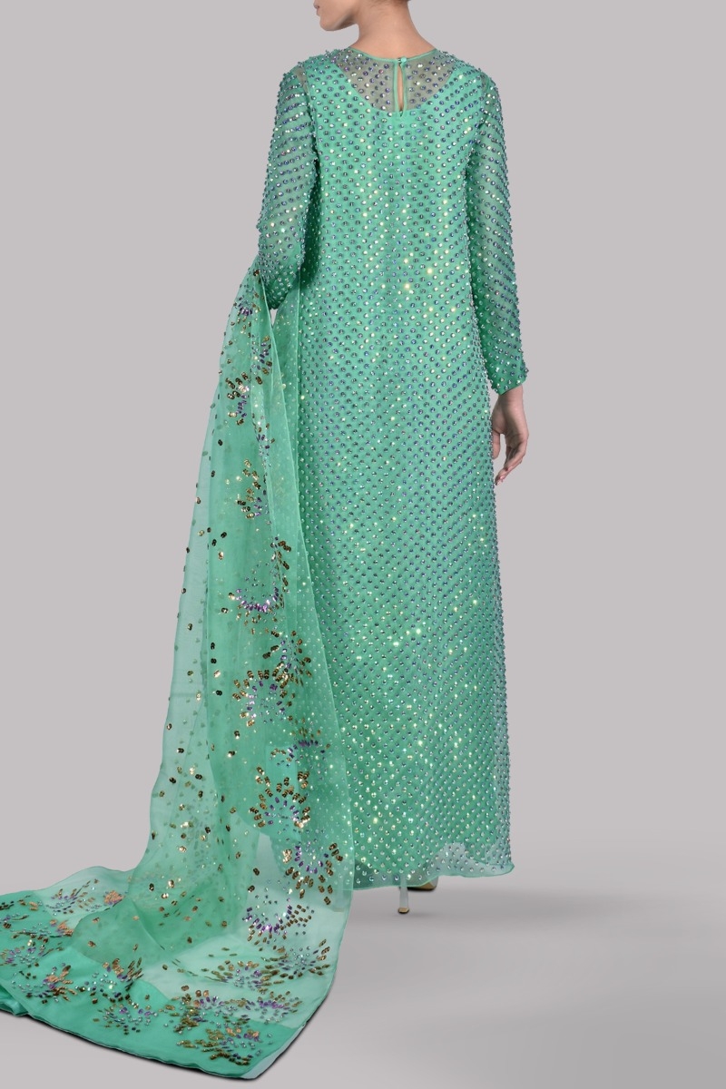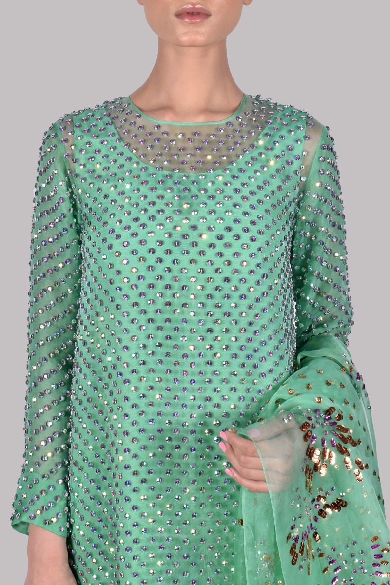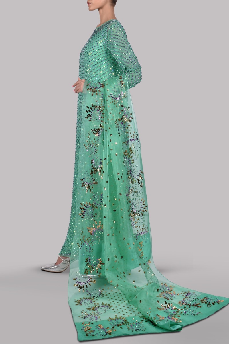 Spring Bud, Straight raw silk maxi dress, hand embellished with sparkling crystals. It’s designed in a slim silhouette with bold side slit. Matching embellished organza dupatta.