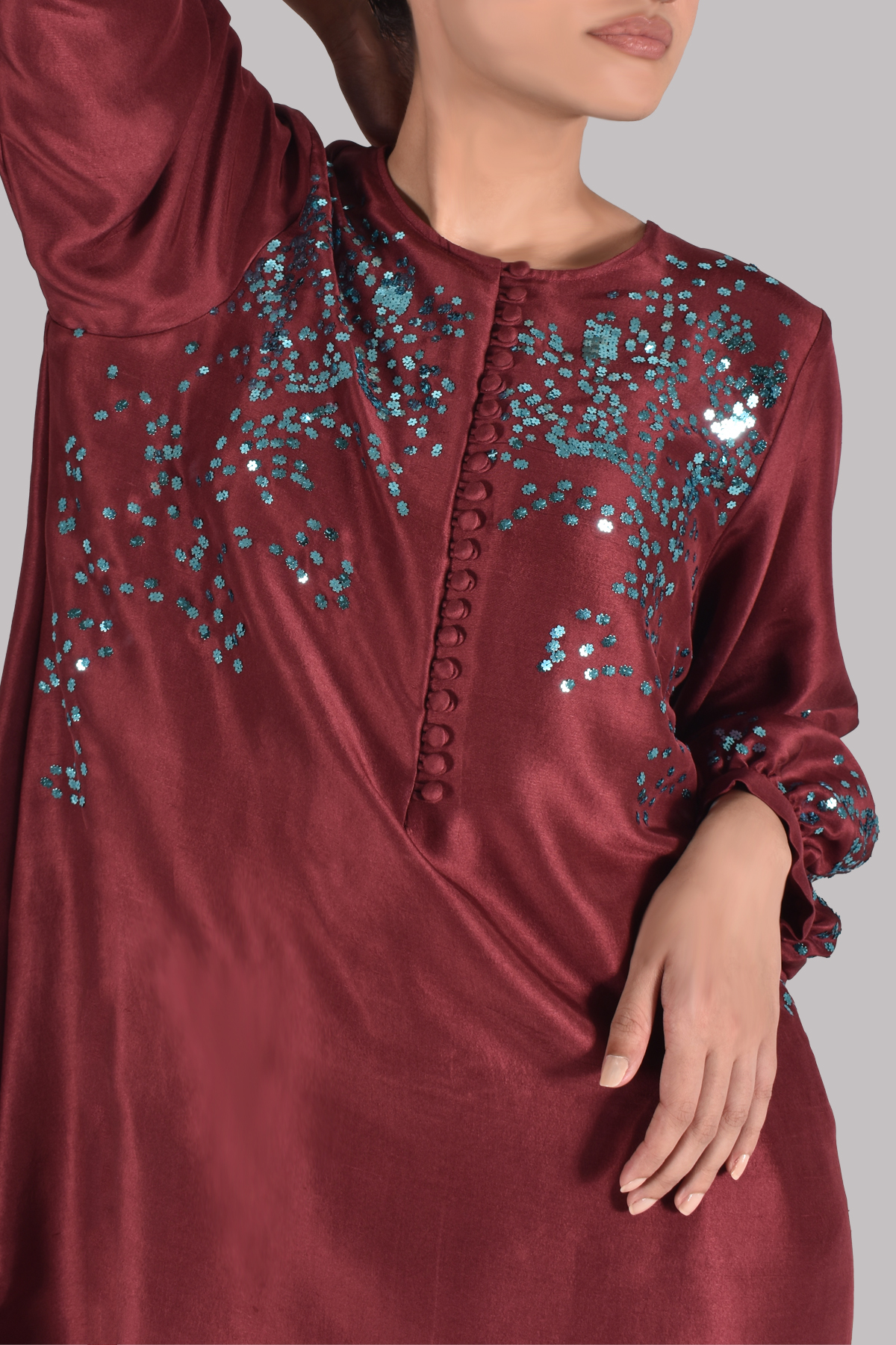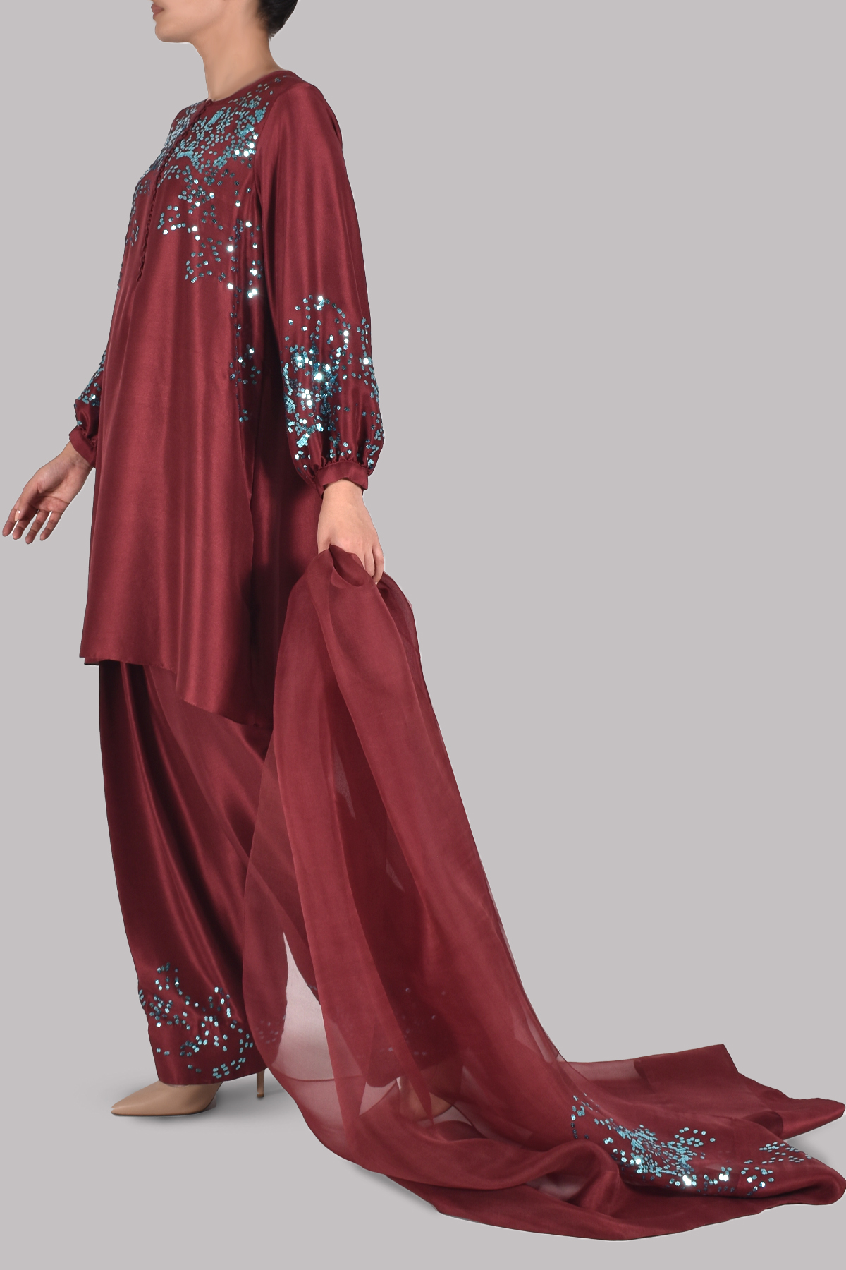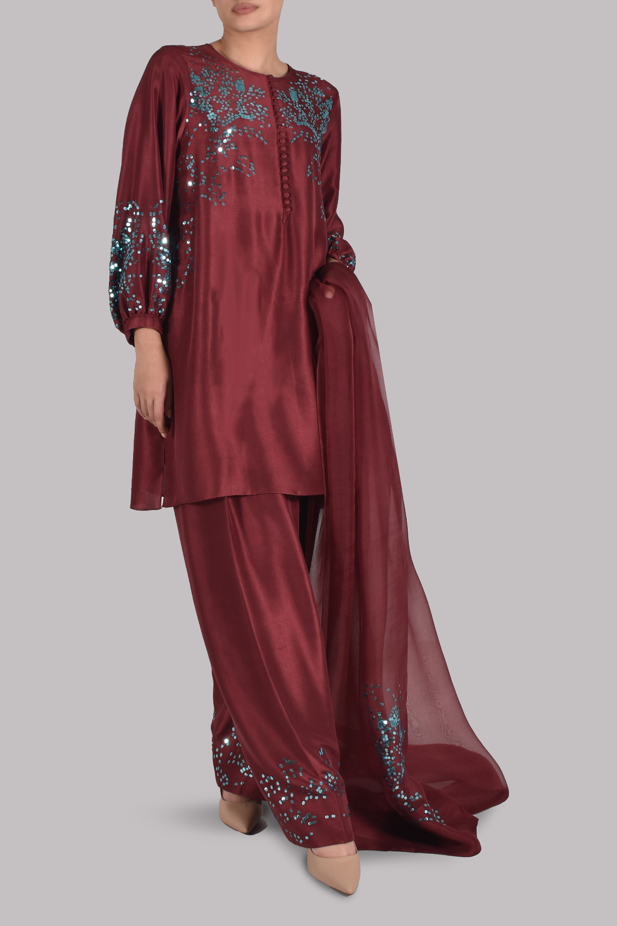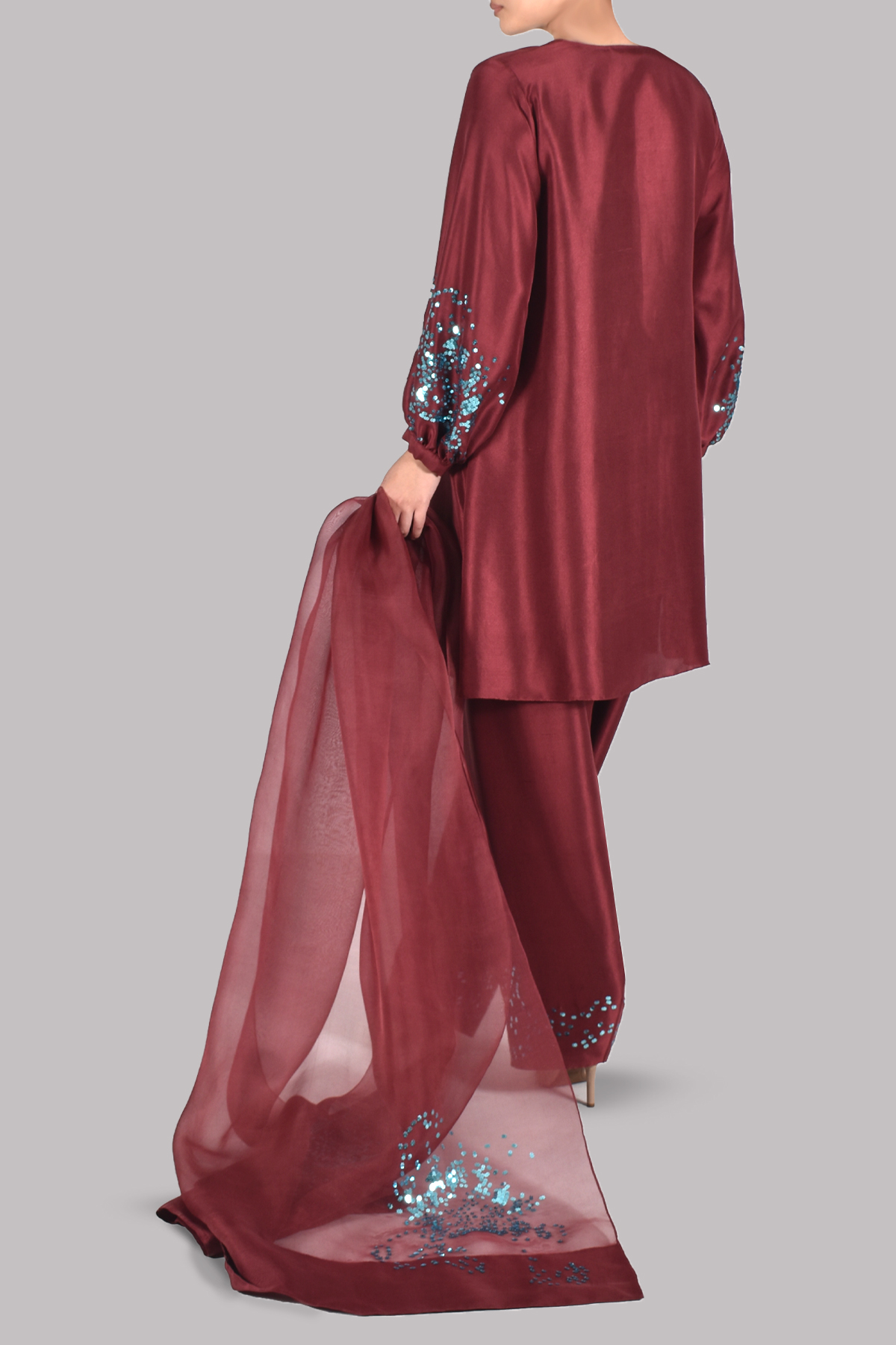 A rich Syrah Maroon raw silk tunic, beautifully embellished to add a touch of glamour and grace. Paired with a matching shalwar and a delicately embellished organza dupatta, this ensemble exudes timeless elegance.