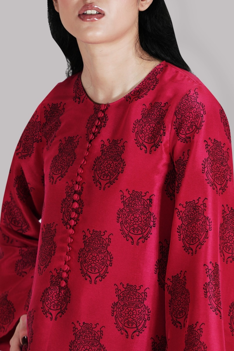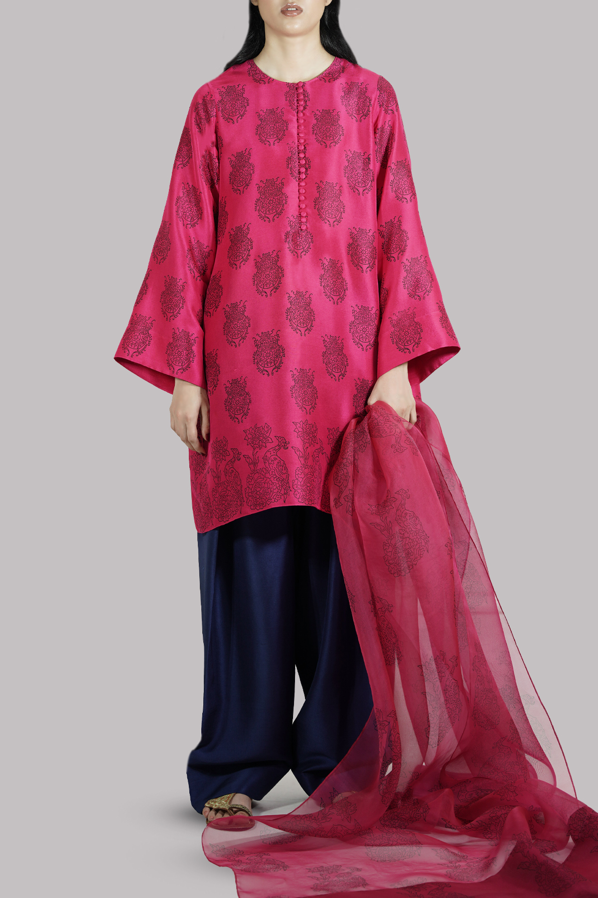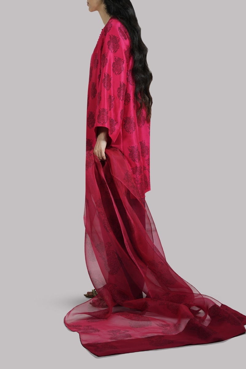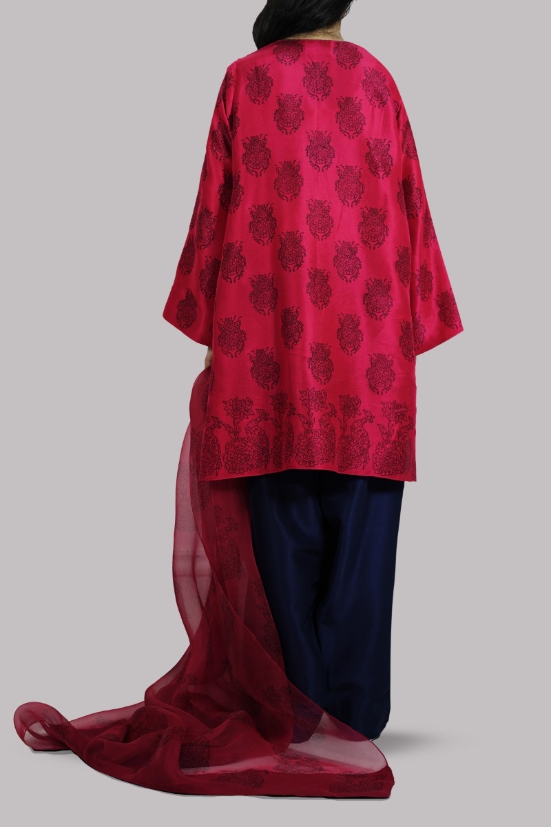 Tango red and black iris block printed raw silk tunic with contrasting impeccably tailored shalwar pants and detailed printed organza dupatta.