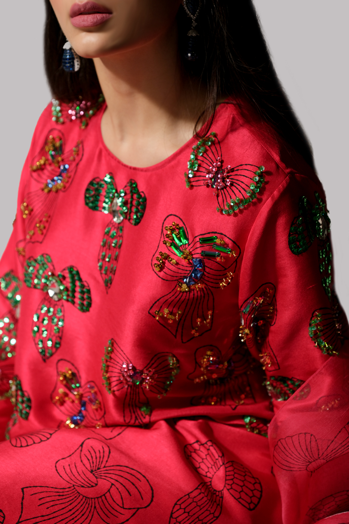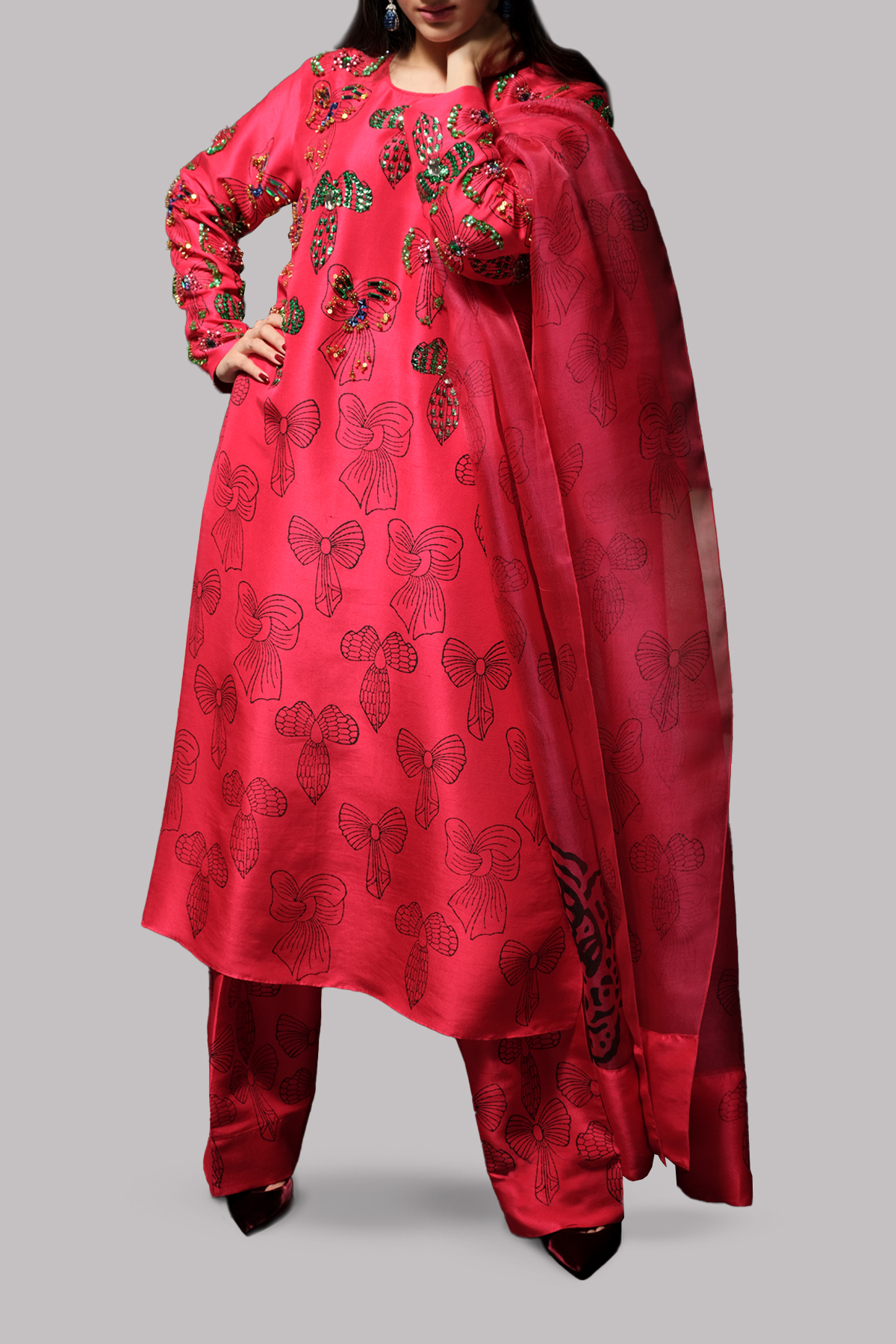 Tango Red block printed and richly embellished A-line tunic with matching shalwar and organza dupatta adding a graceful complete look.