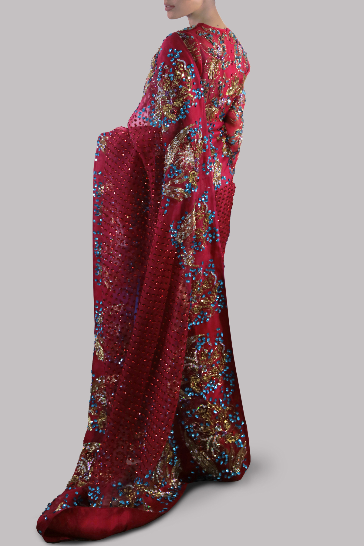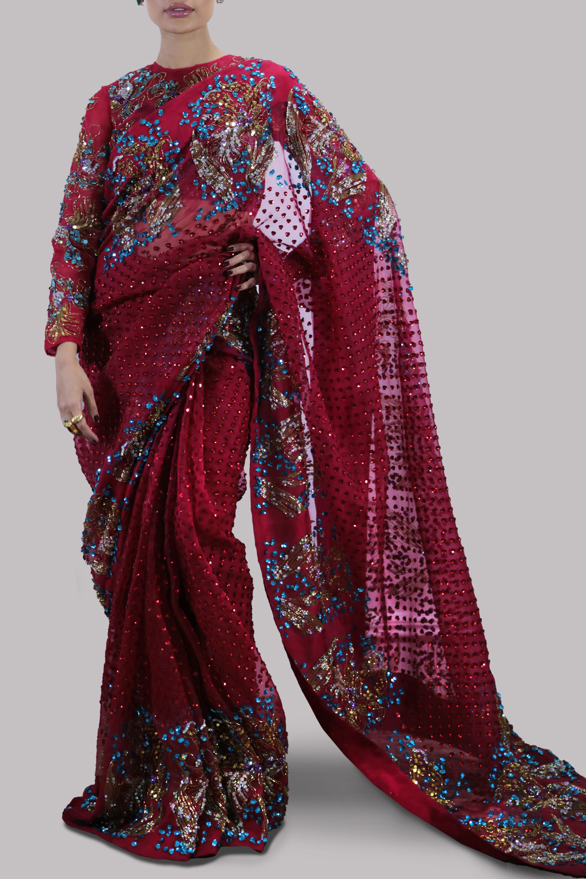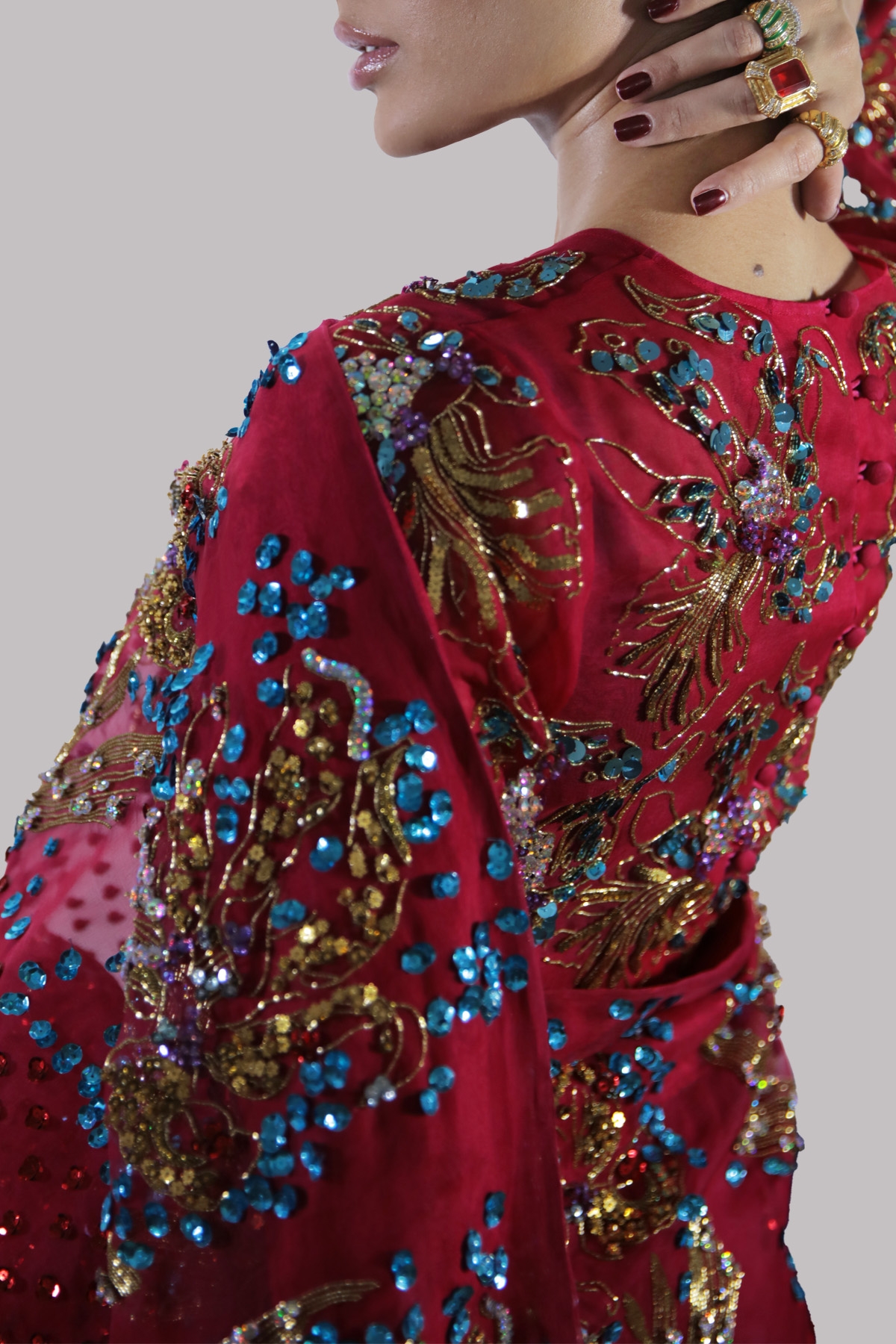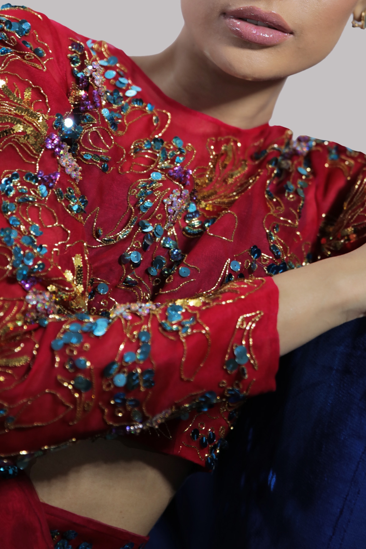 Tango Red organza sari with matching embellished dupion cropped blouse. Hand embellished with freshwater pearls, glistening sequins, dazzling crystals and gold beads. This sensational sari is no exception. The sari has stitched pleats for ease of wearing. Silk petticoat included.