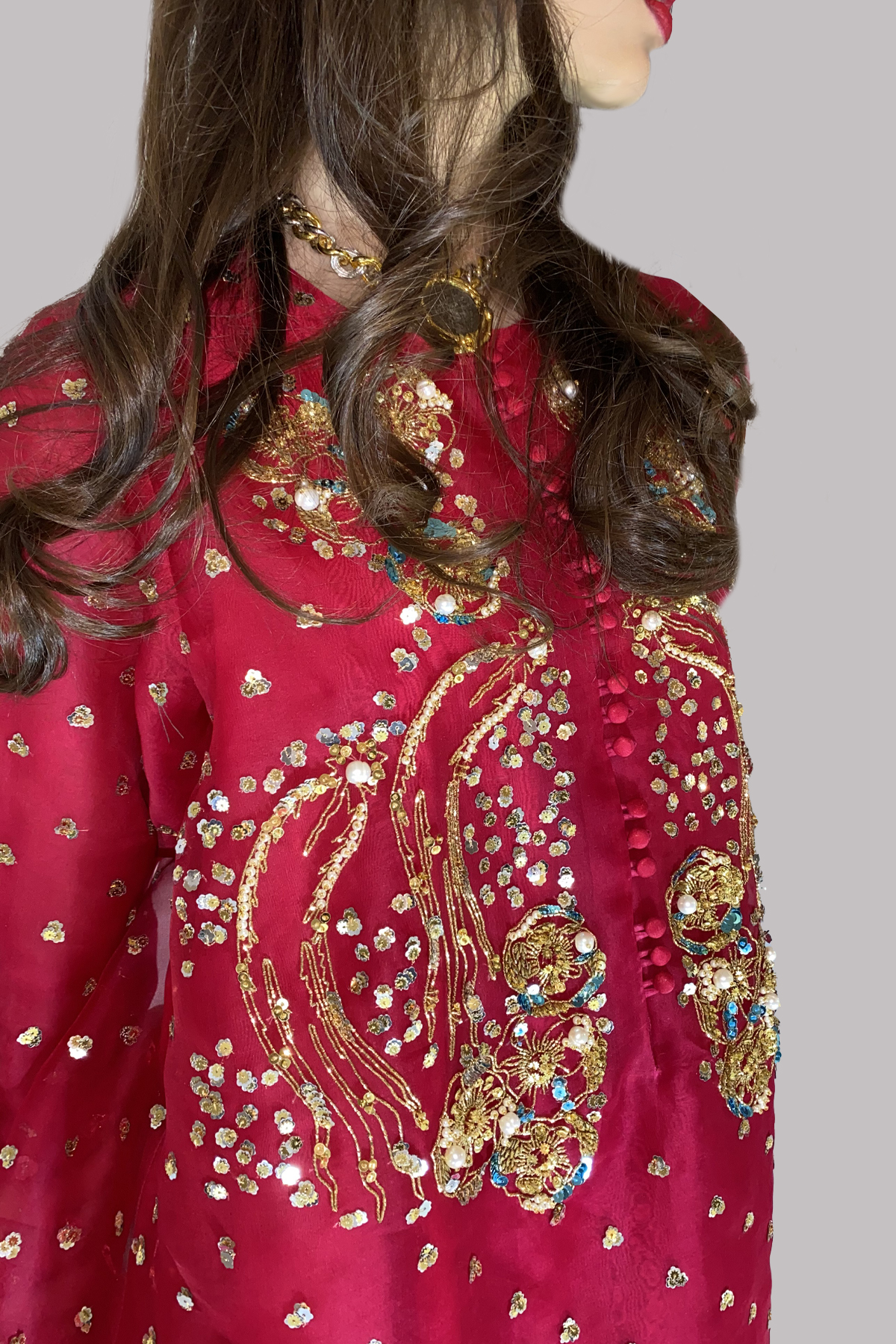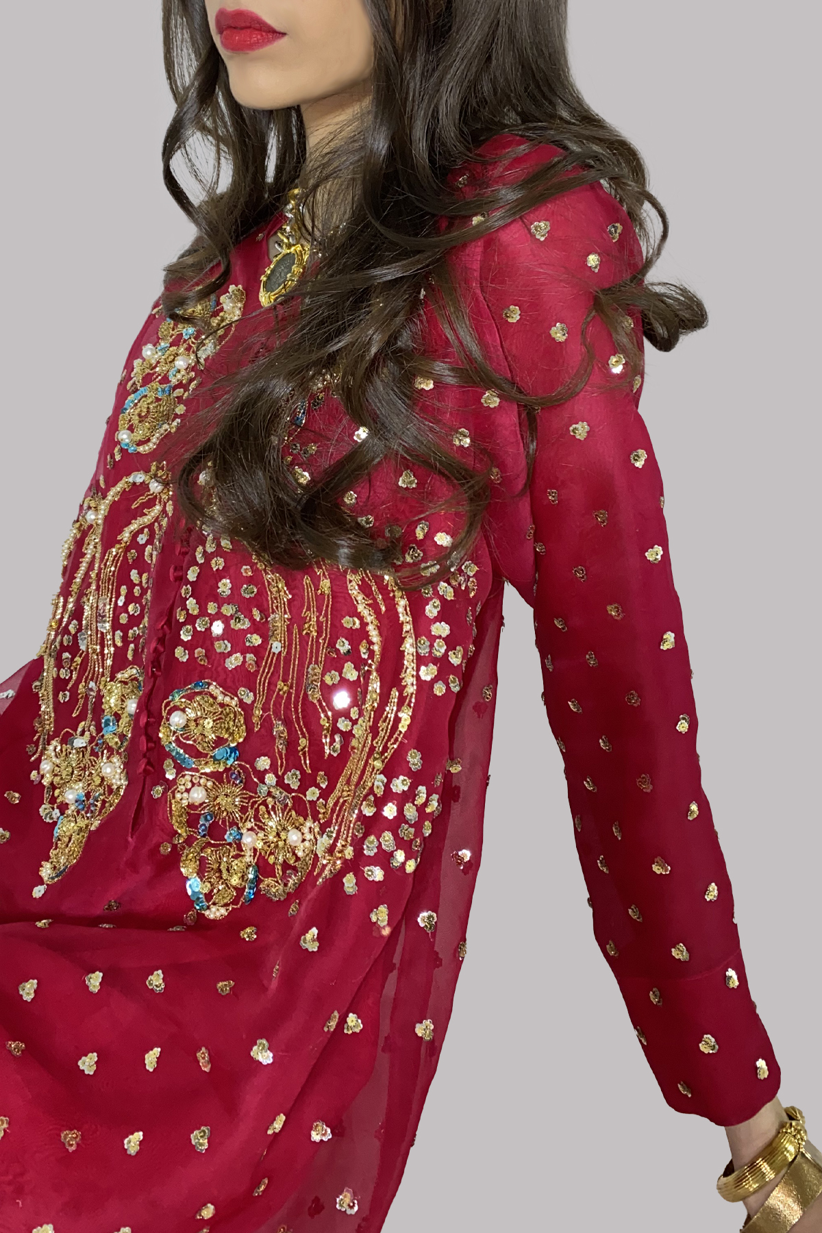 This Tango Red organza tunic is delicately embellished with sequins. Paired with a matching Tango Red wide legged pants, this timeless set blends tradition with refined elegance.