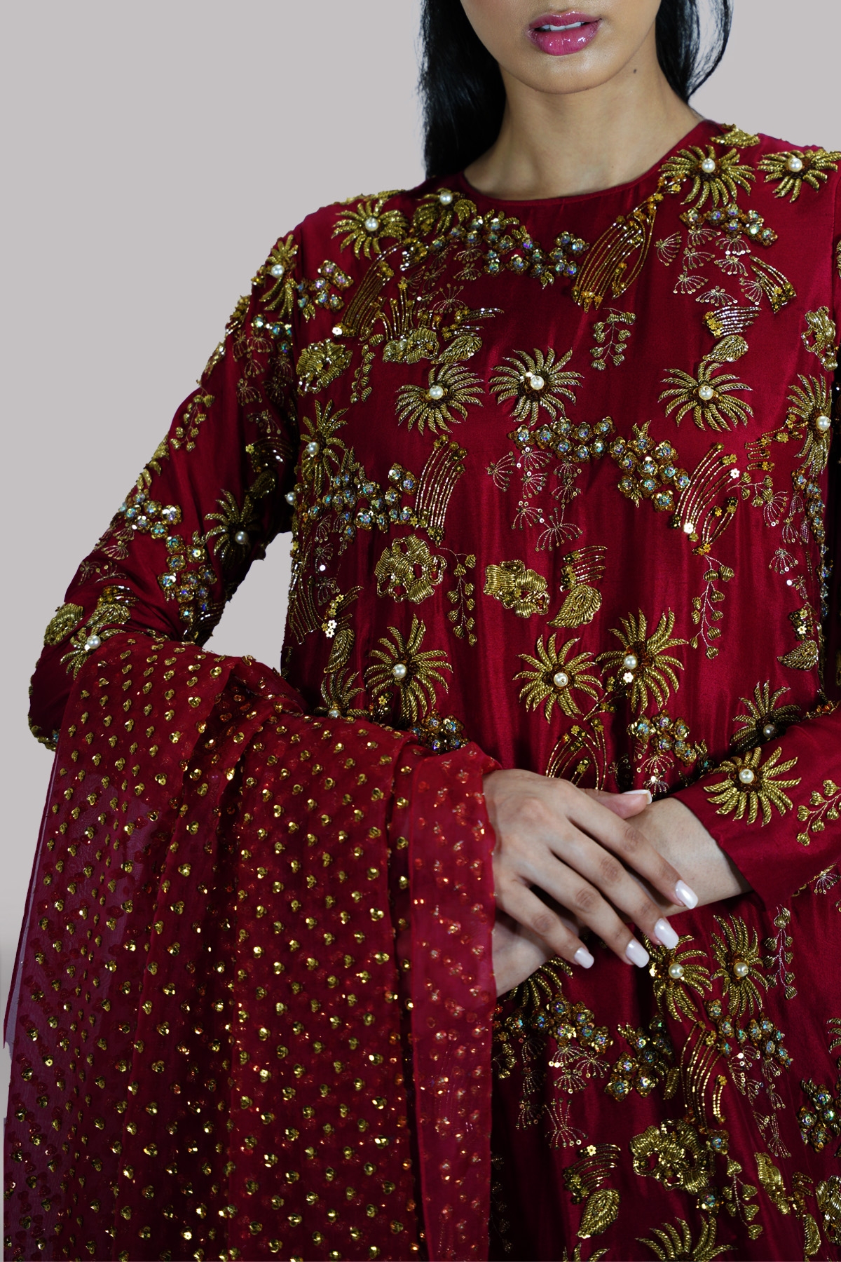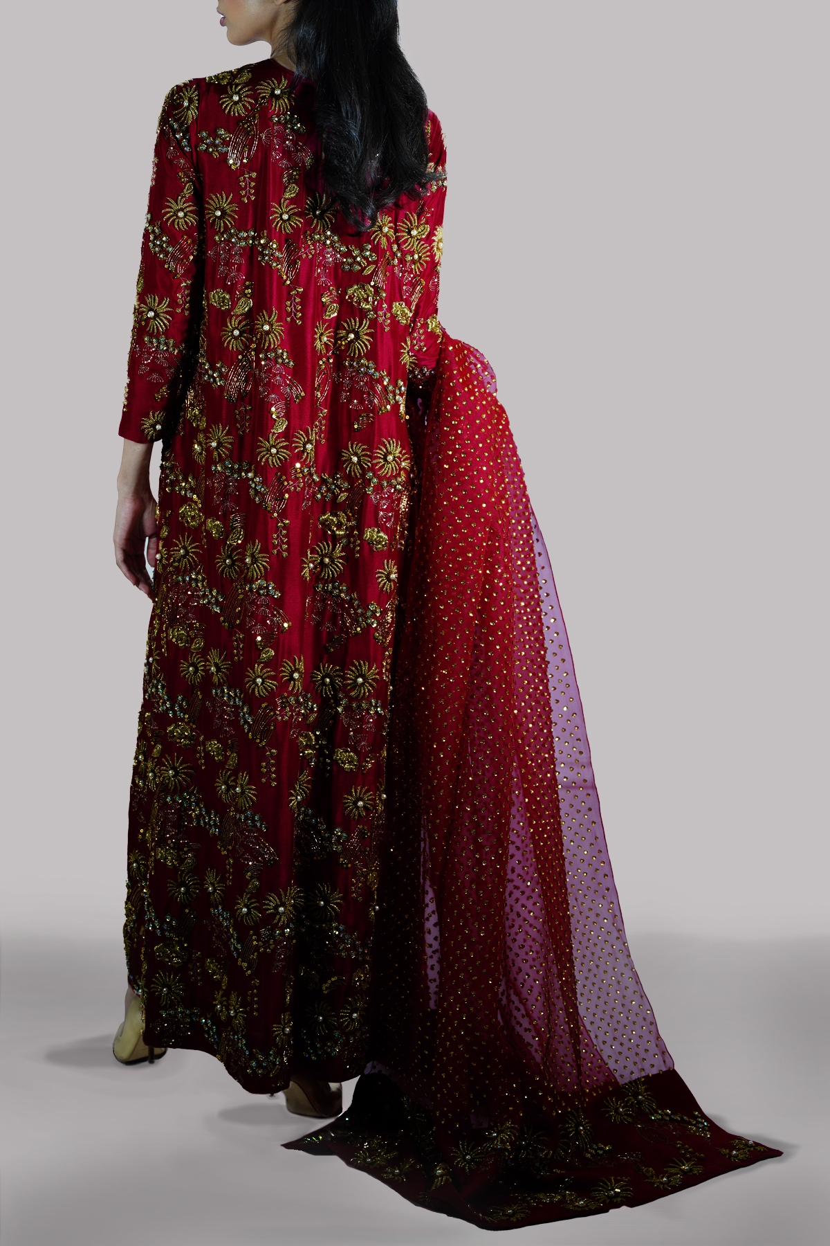 Tango red close neck raw silk maxi delicately hand-embellished with gold and silver sequins with an embellished organza dupatta.