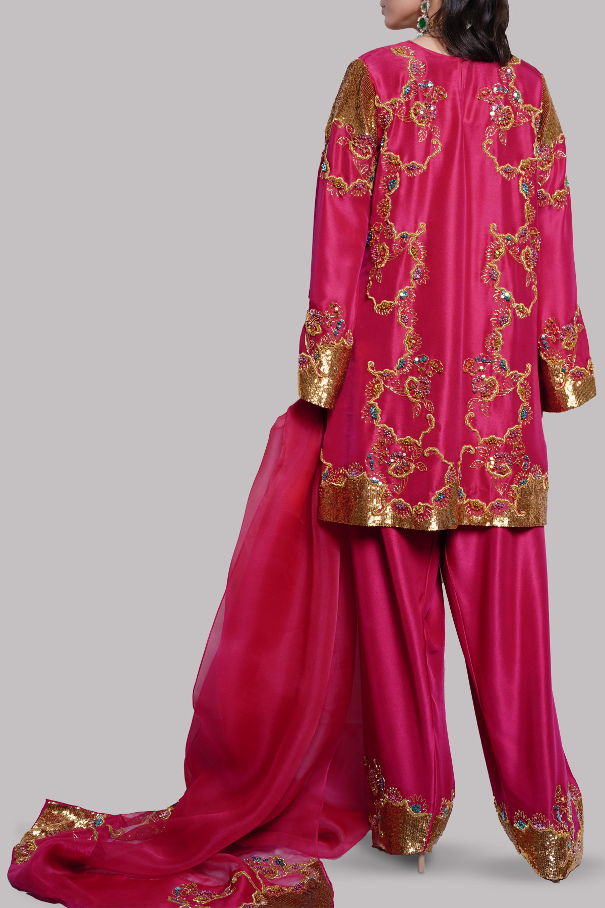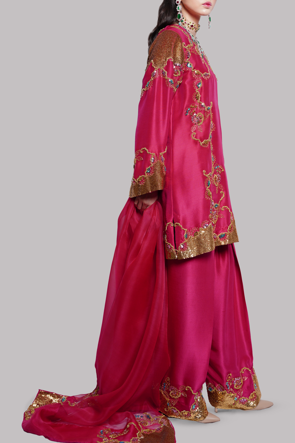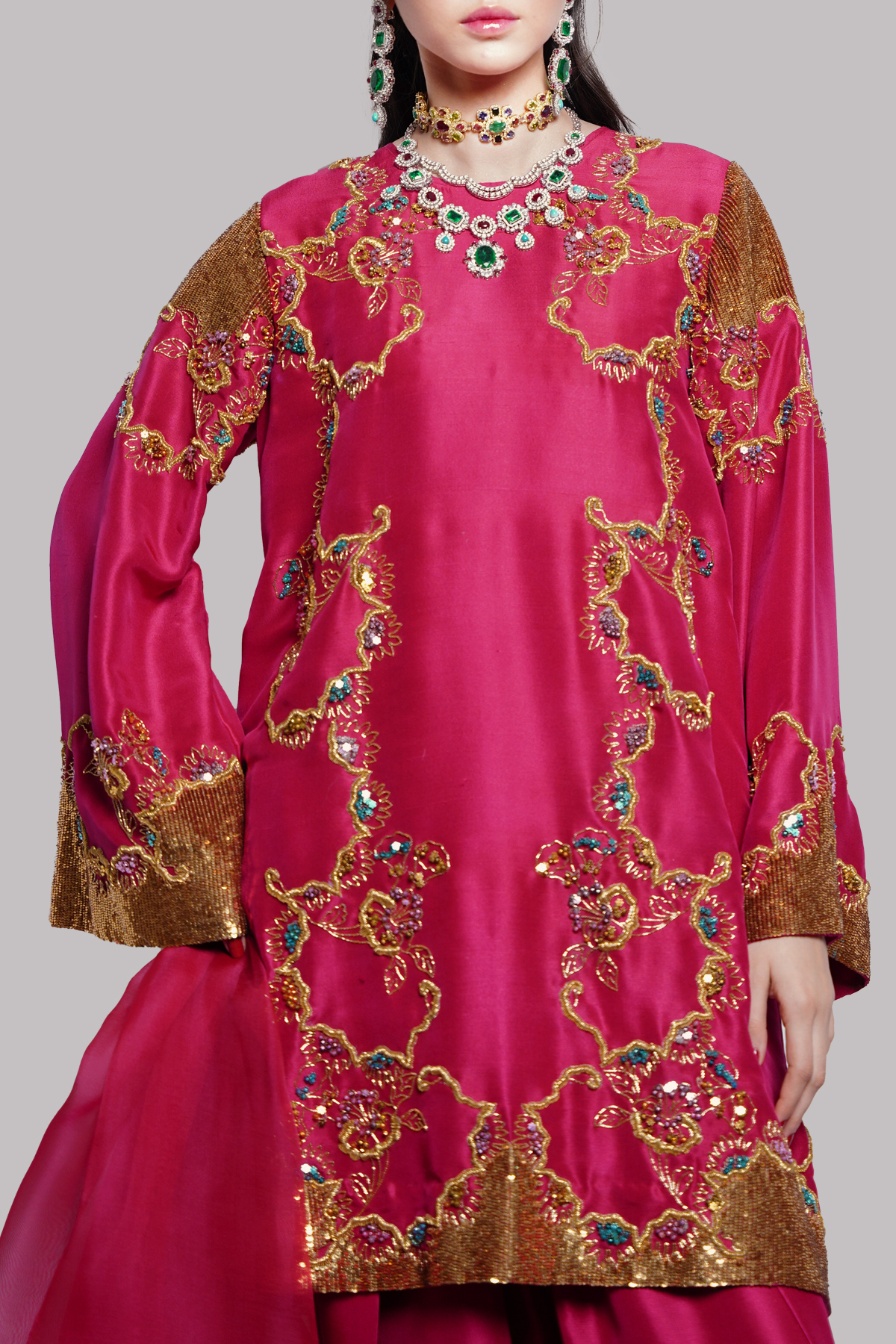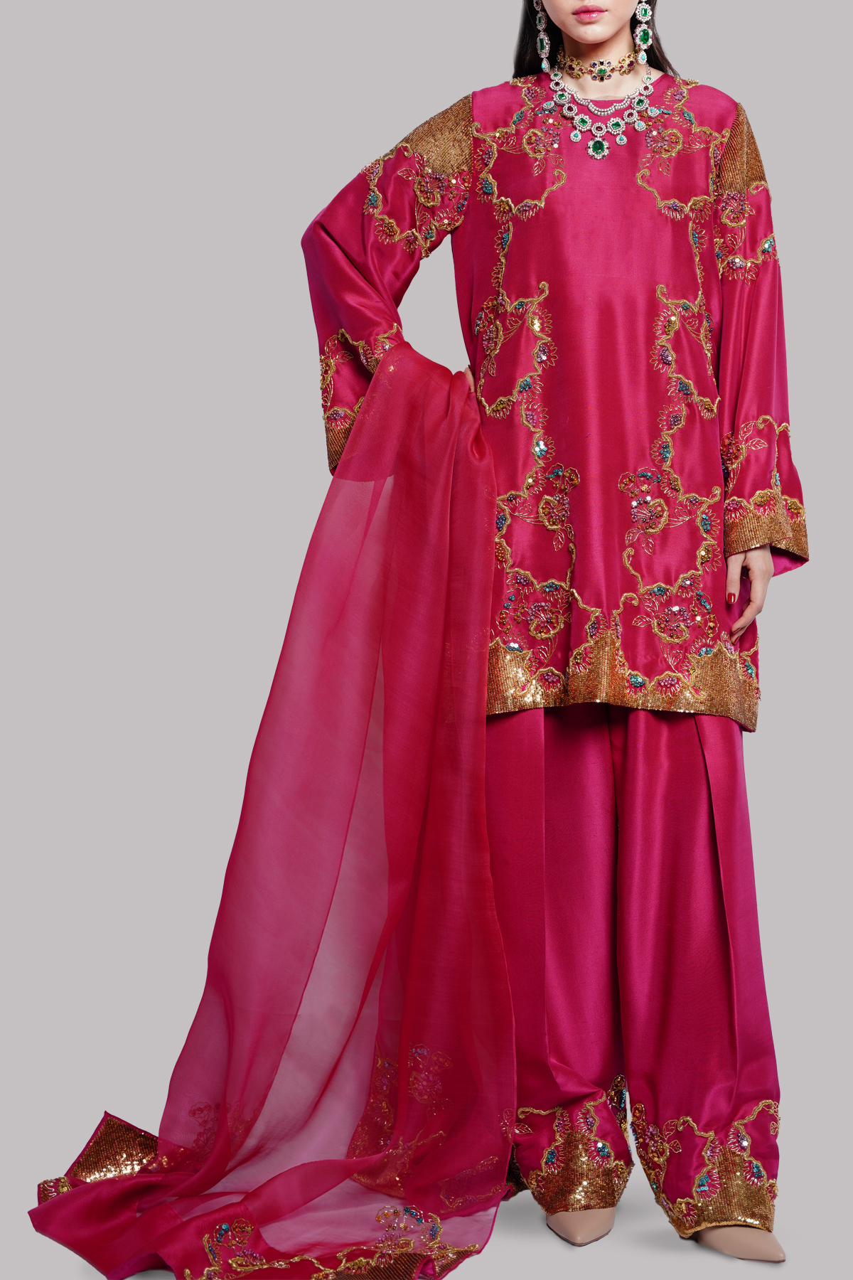 Make a vibrant statement in this Tango Red raw silk tunic, exquisitely embellished for special occasions. The set includes a comfortable matching shalwar and a delicate, embellished organza dupatta. Embrace radiant elegance for weddings and festive events.