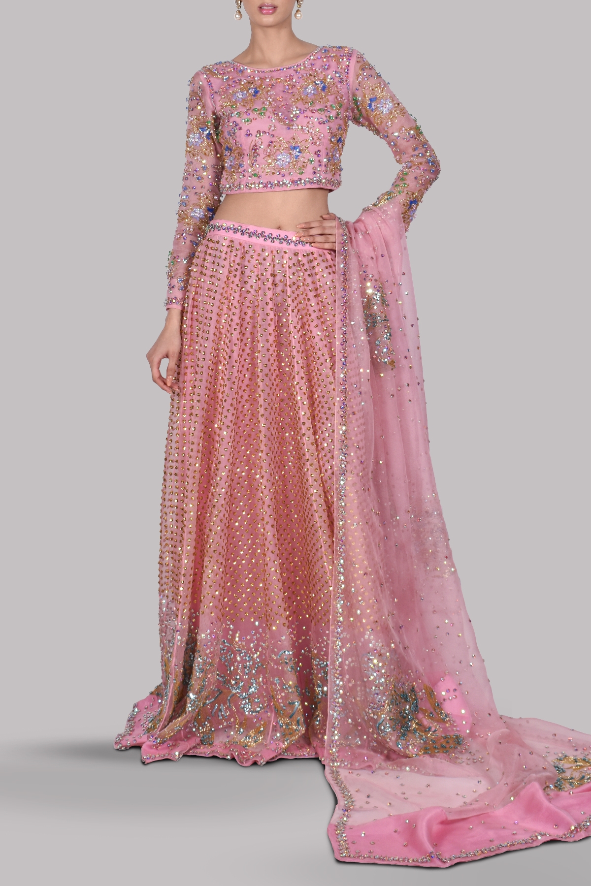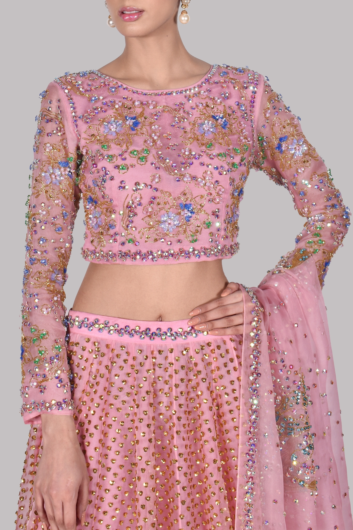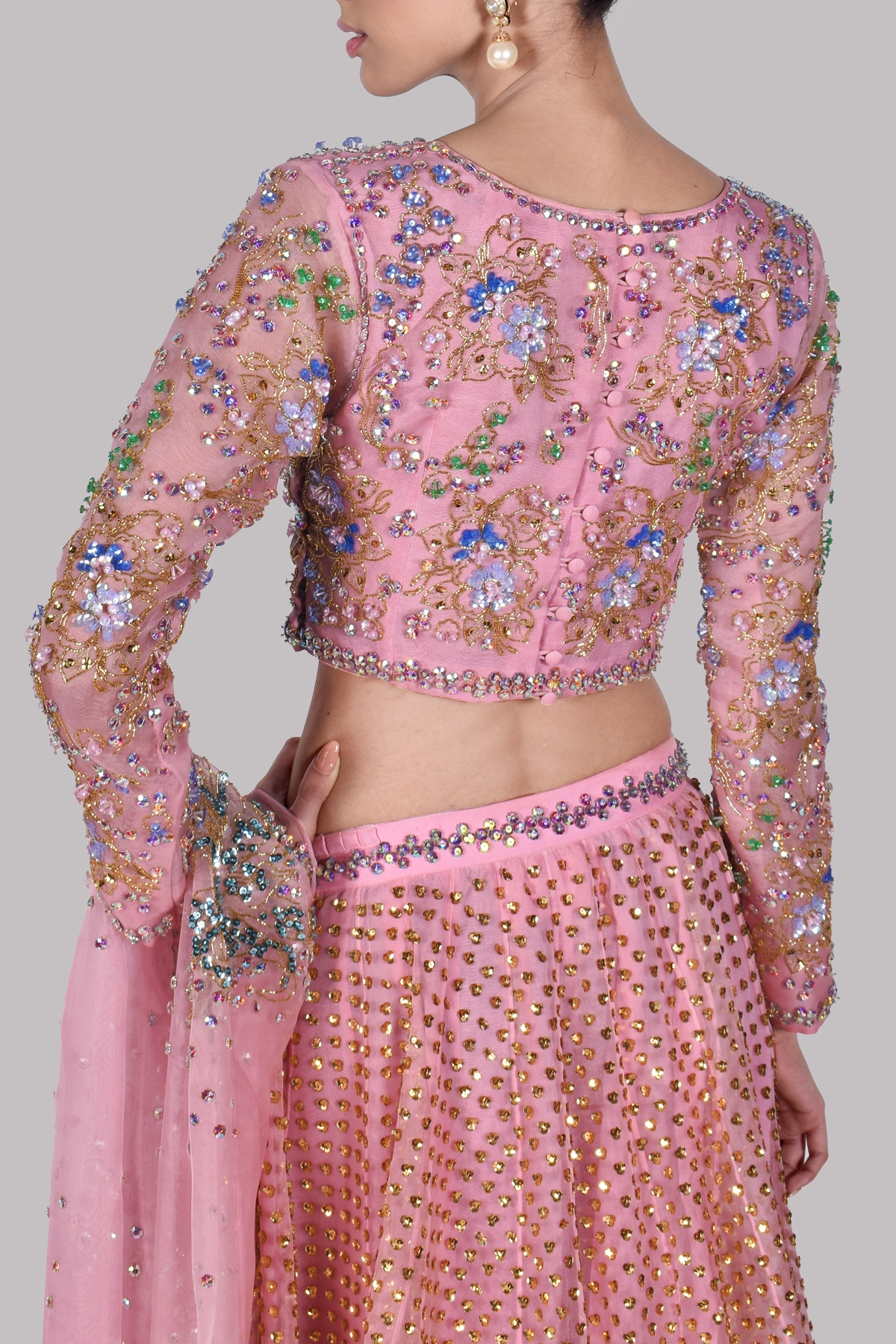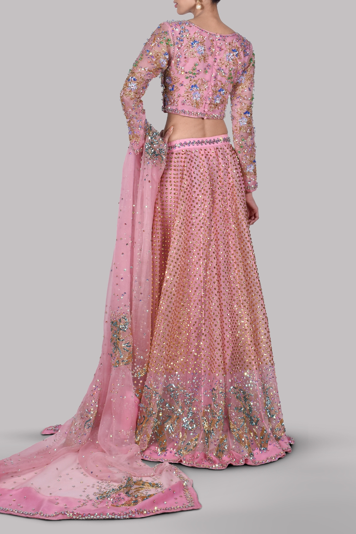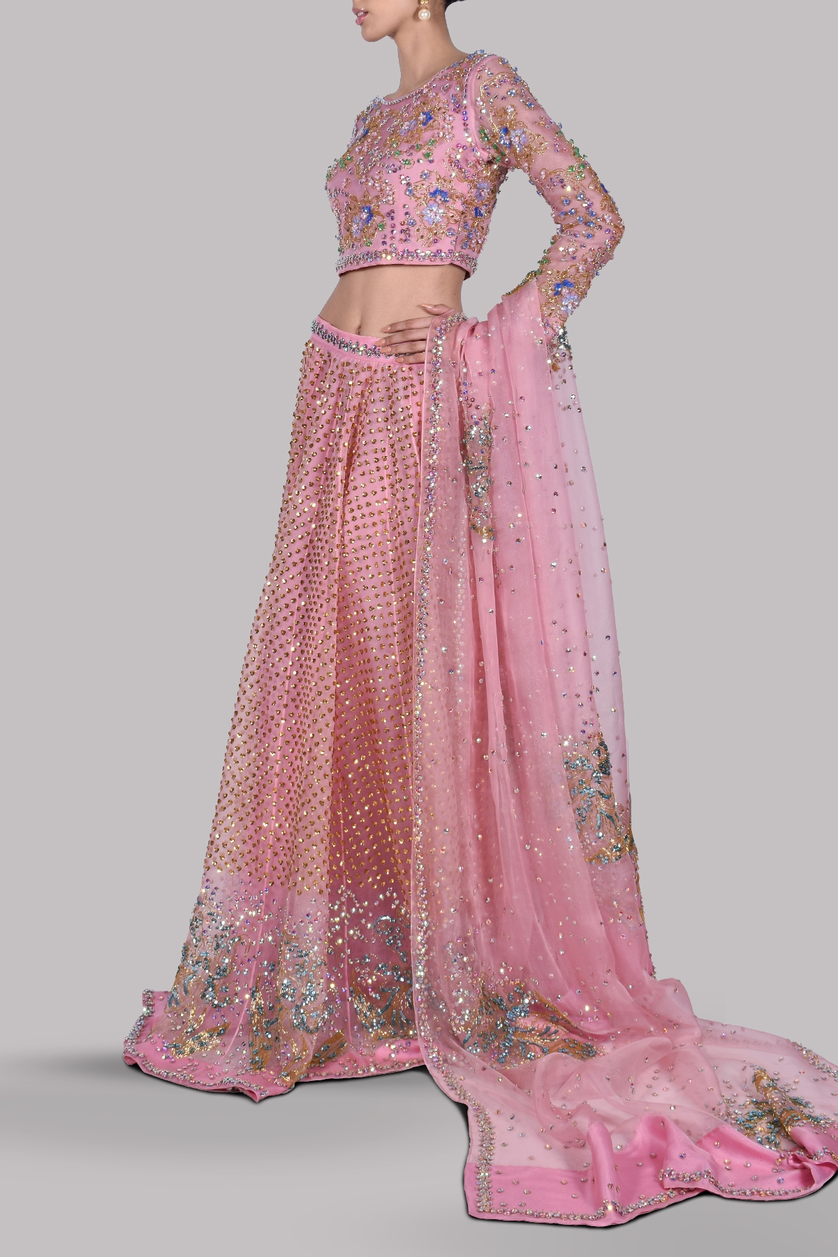 Our Mystical Tickled Pink skirt set with a low neck raw silk cropped blouse, heavily hand embellished to perfection with multi-coloured French and Italian glistening sequins work, elevated with perfect cut and extravagant details. Impeccably tailored with homogeneous embellished raw silk skirt and embellished organza dupatta gleaming in sequins. This is a perfect and elegant ensemble for the exquisite MUSE bride.