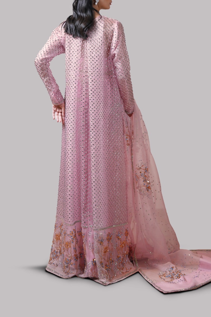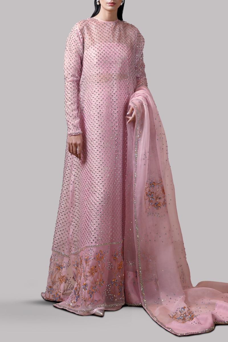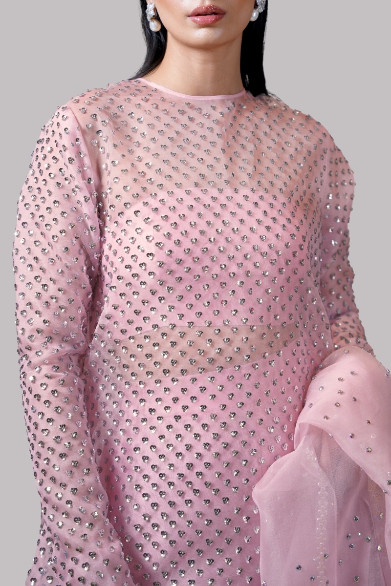 Tickled Pink, Oversized and flowing straight organza long maxi with side slit, exquisitely hand embellished with multi-coloured glittering French and Italian sequins. Its impeccably tailored with matching palazzo pants paired with matching embellished organza dupatta.