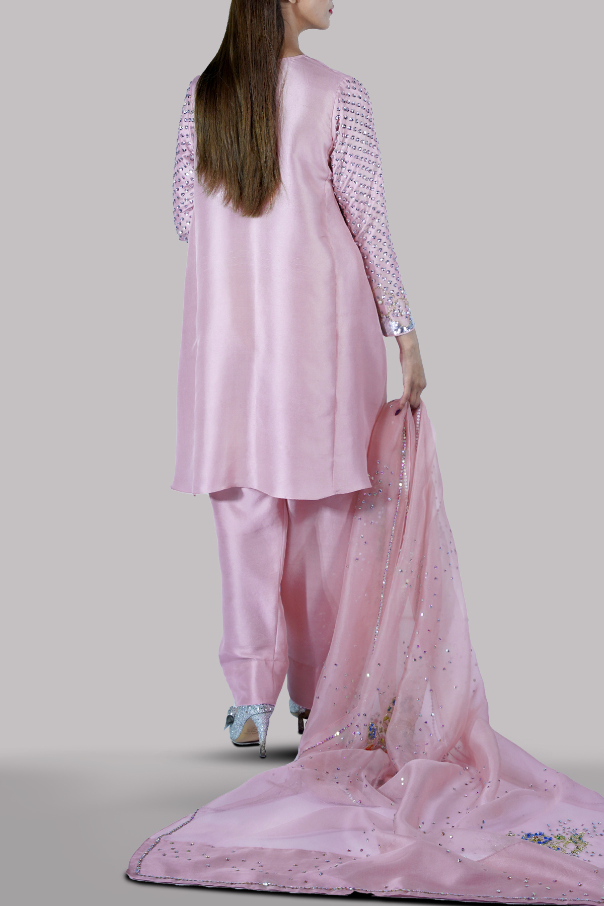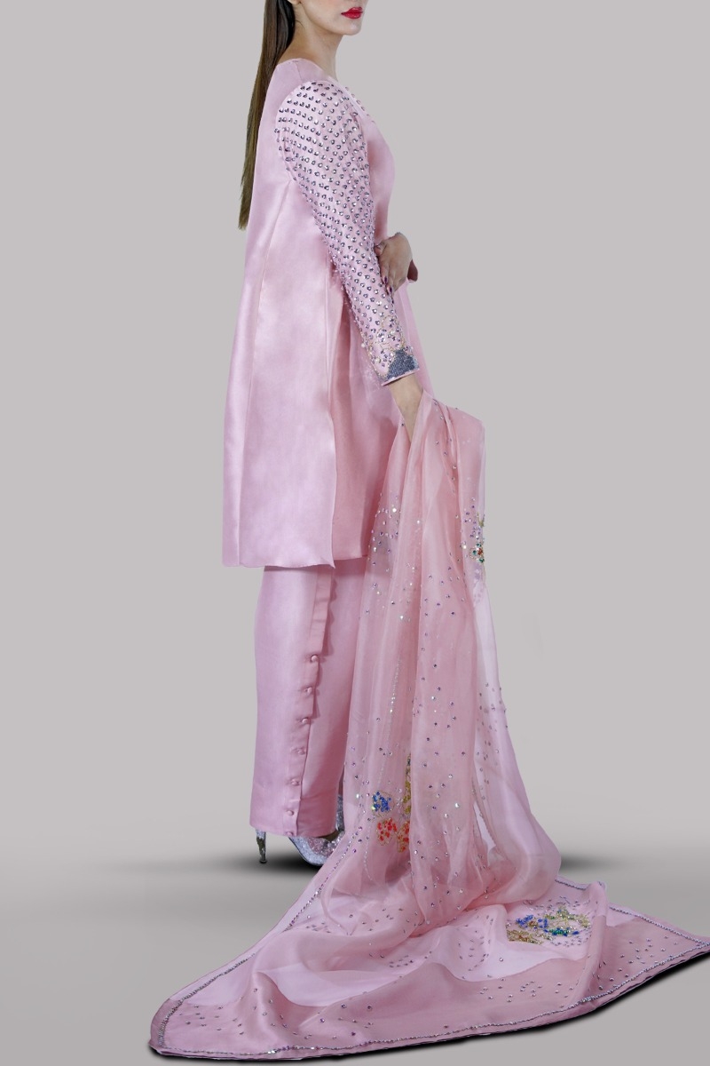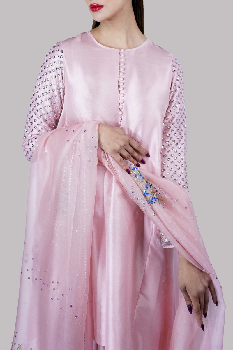 Tickled Pink close neck raw silk shirt decorated with glittering sequins on sleeves with perfect cut and extravagant details, It’s impeccably tailored with matching raw silk shalwar pants finished with fabric buttons and embellished organza dupatta.