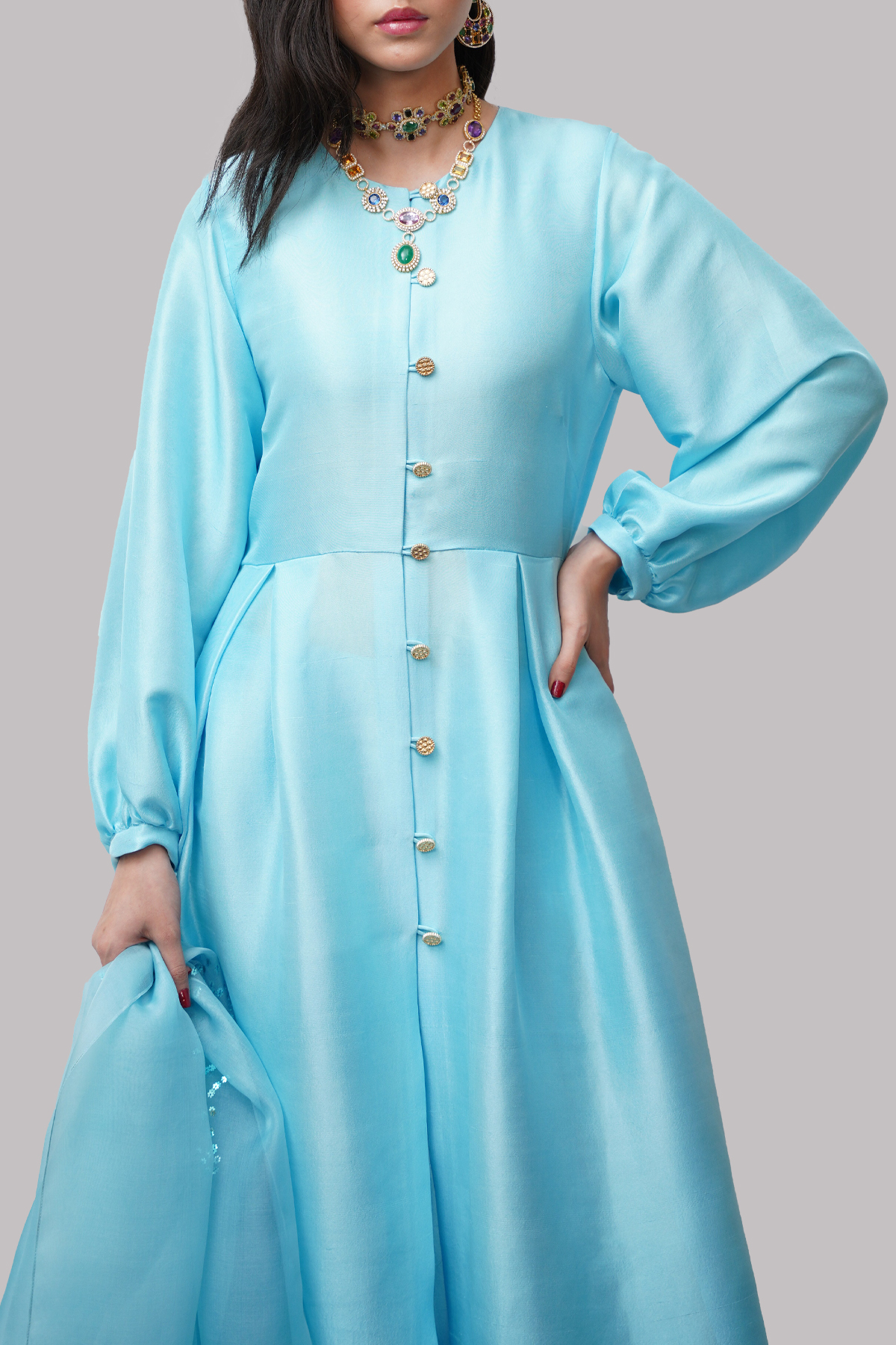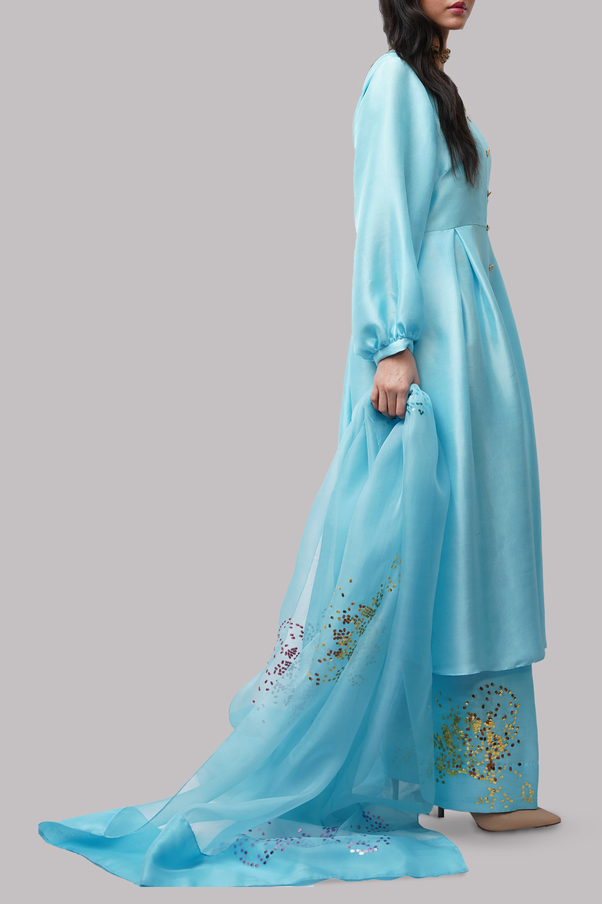 Embrace a refreshing elegance in this Tropical Breeze Blue raw silk ensemble. The tunic features a flattering A-line silhouette with a buttoned front and gracefully gathered sleeves. Delicate gold embellishments are scattered across the shoulders, sleeves, and hem, adding a subtle touch of sparkle. Paired with a comfortable matching shalwar, also adorned with embellishments at the hem, and a flowing organza dupatta, this outfit exudes a light and sophisticated charm.