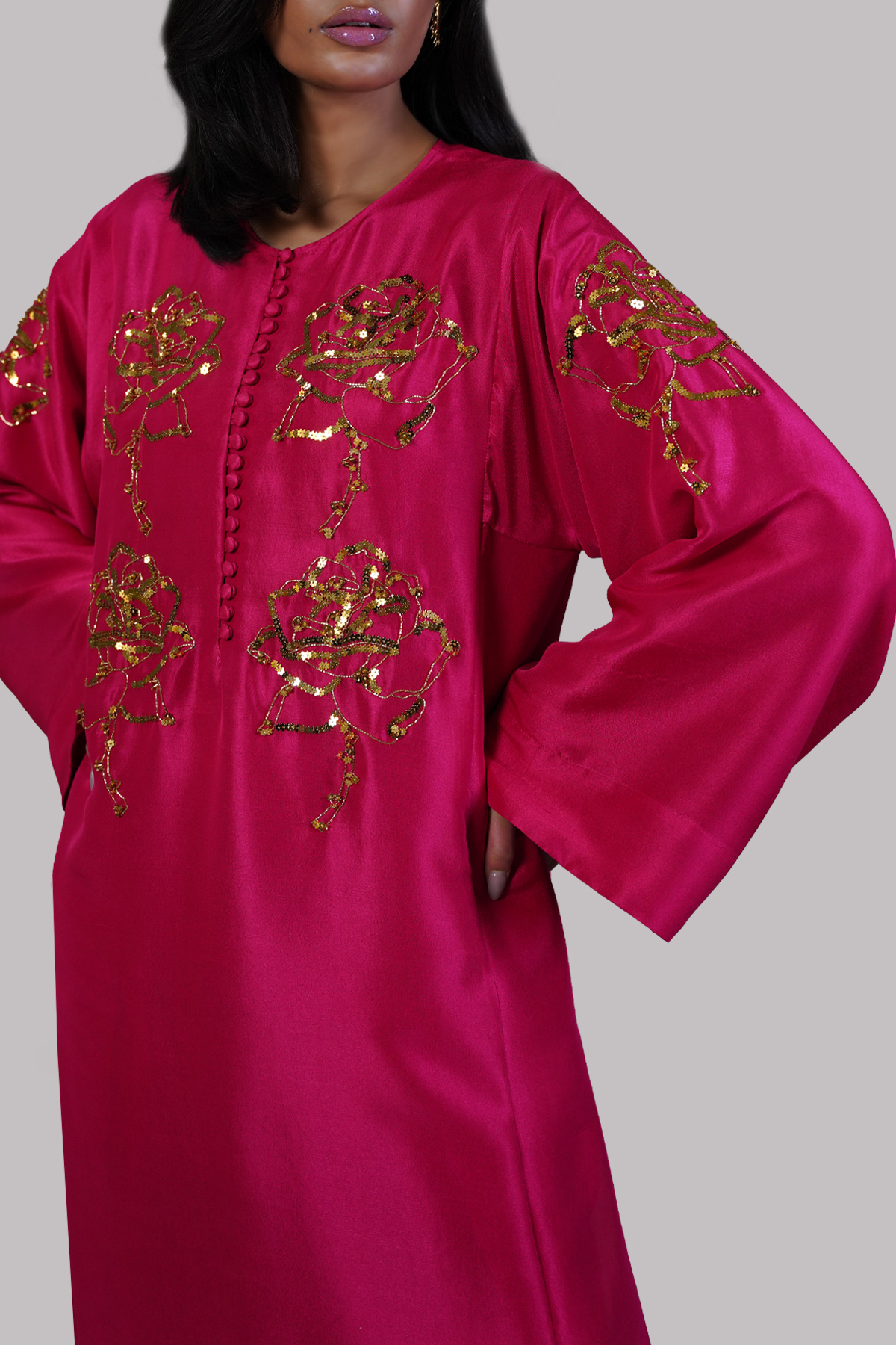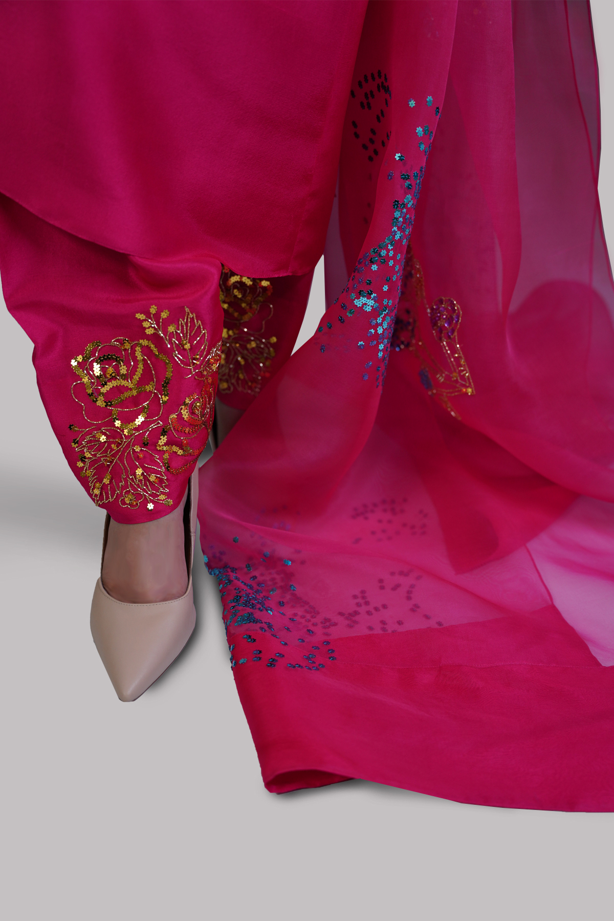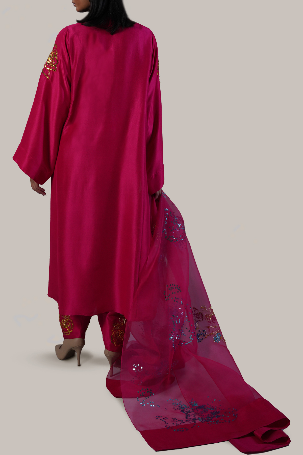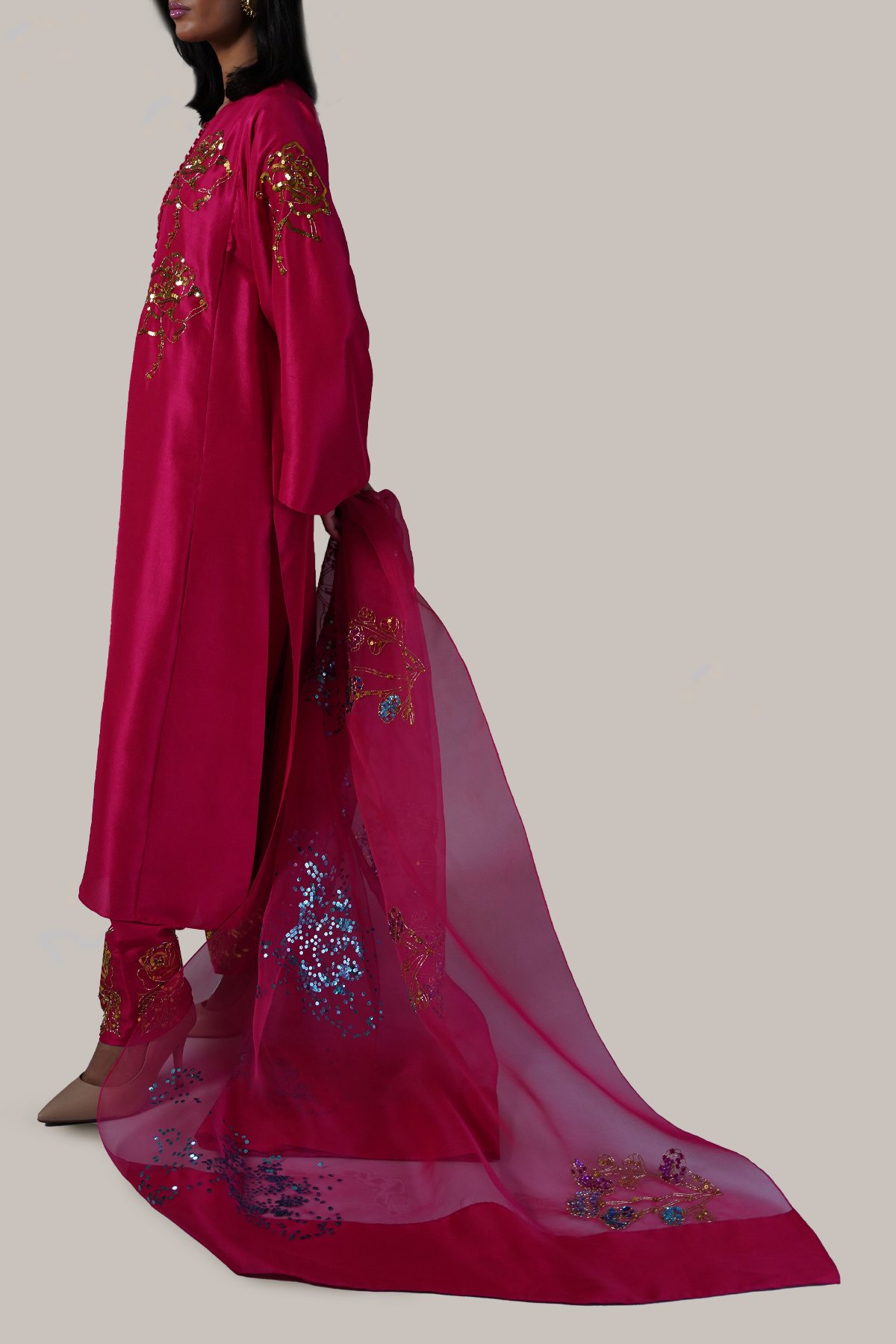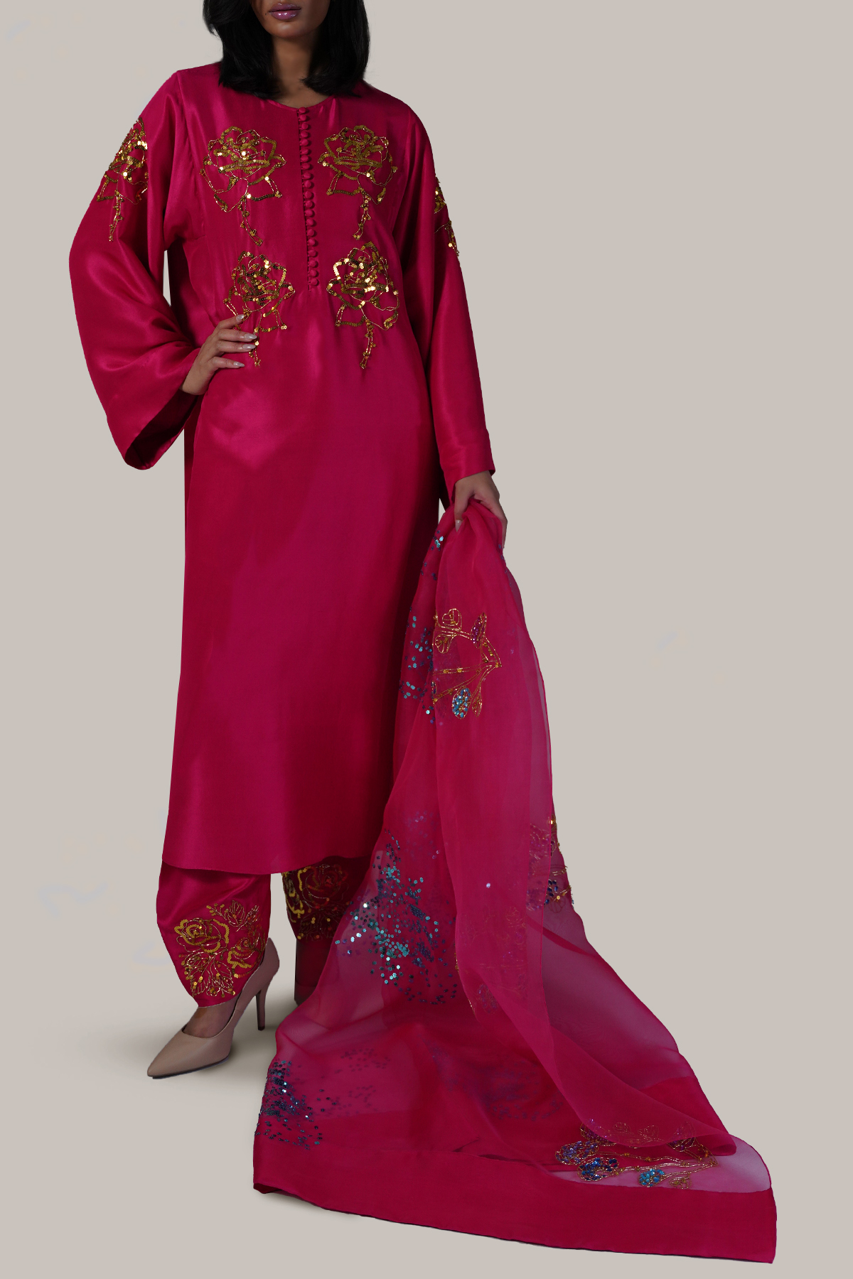 Gracefully feminine and effortlessly elegant, this Virtual Pink raw silk tunic features an embellished neckline with delicate button detailing and a handcrafted rose motif adorned with gold sequins, adding a subtle touch of shimmer. The embellishments extend to the sleeves, creating a cohesive, refined look. Paired with a matching shalwar and a beautifully embellished dupatta.
