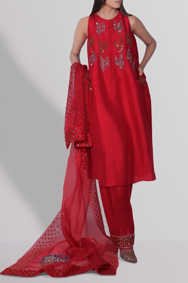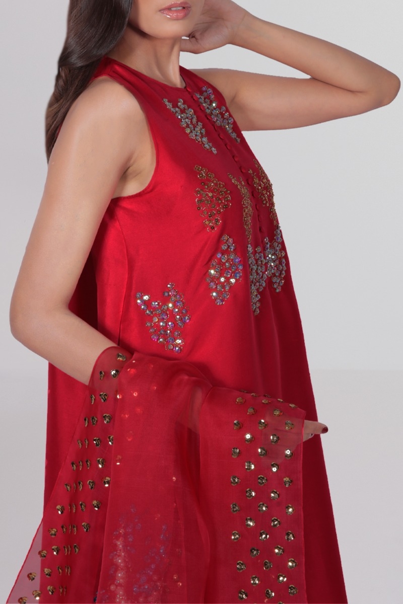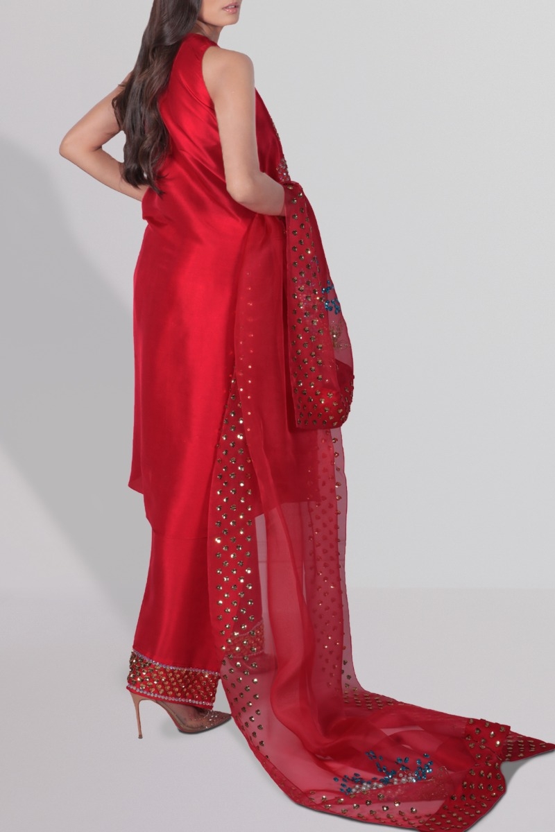 VIRTUAL PINK, DEEP RED, OVERSIZED RAW SILK TOP, HAND EMBELLISHED WITH MULTI-COLORED FRENCH AND ITALIAN SEQUINS. MATCHING EMBELLISHED RAW SILK SHALWAR PANTS AND EMBELLISHED ORGANZA DUPATTA.