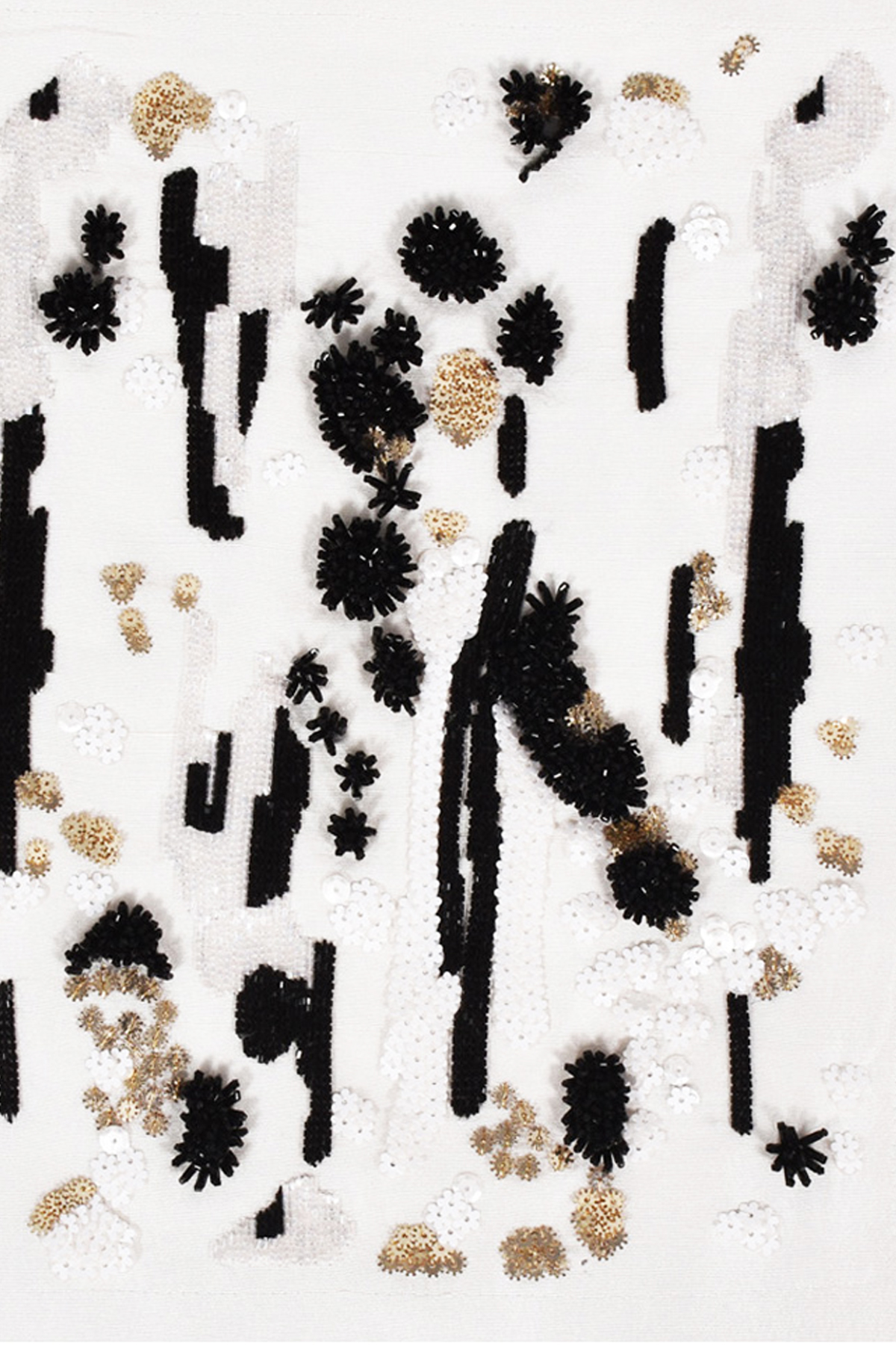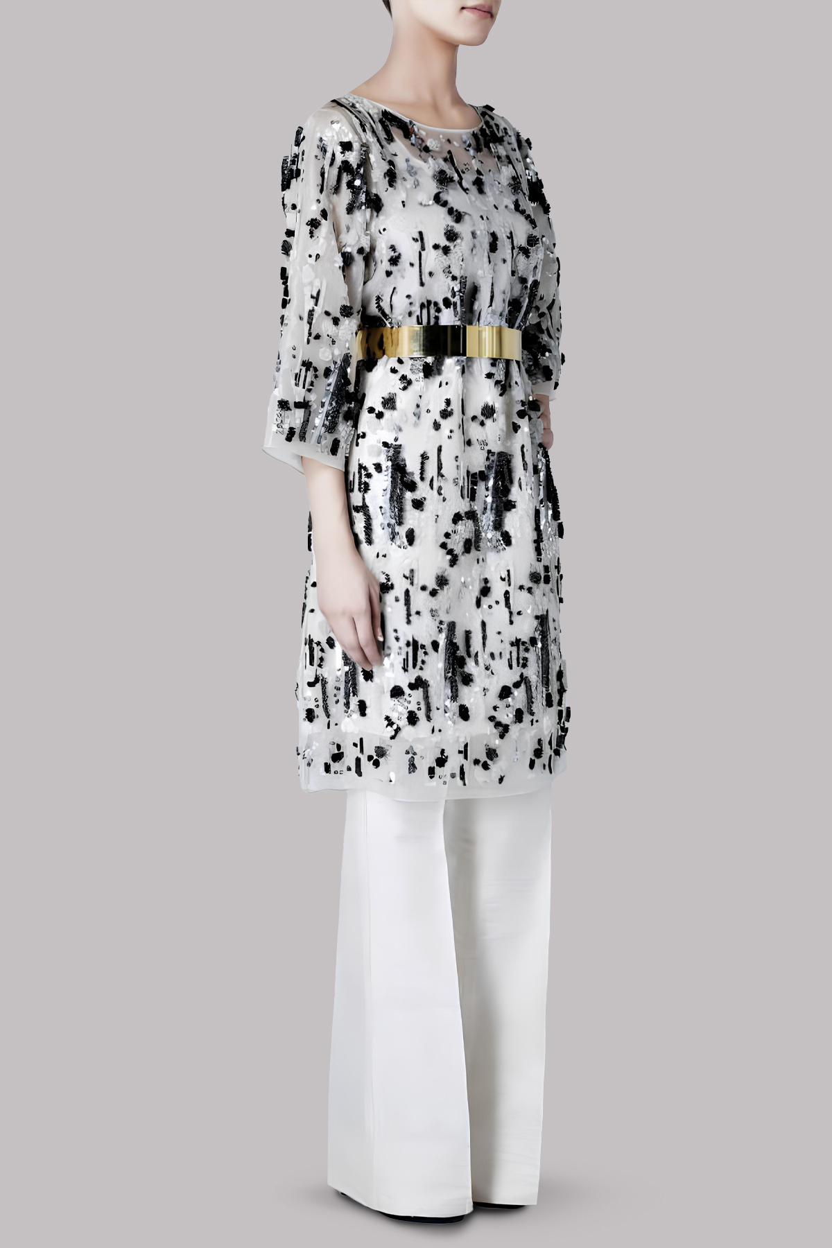 A modern classic with artistic flair, this statement ensemble features a sheer white organza tunic, adorned with intricate 3D embellishments in black and silver, creating a striking play of texture and dimension. Paired with sleek raw silk bootcut pants, this look fuses contemporary sophistication with timeless elegance.