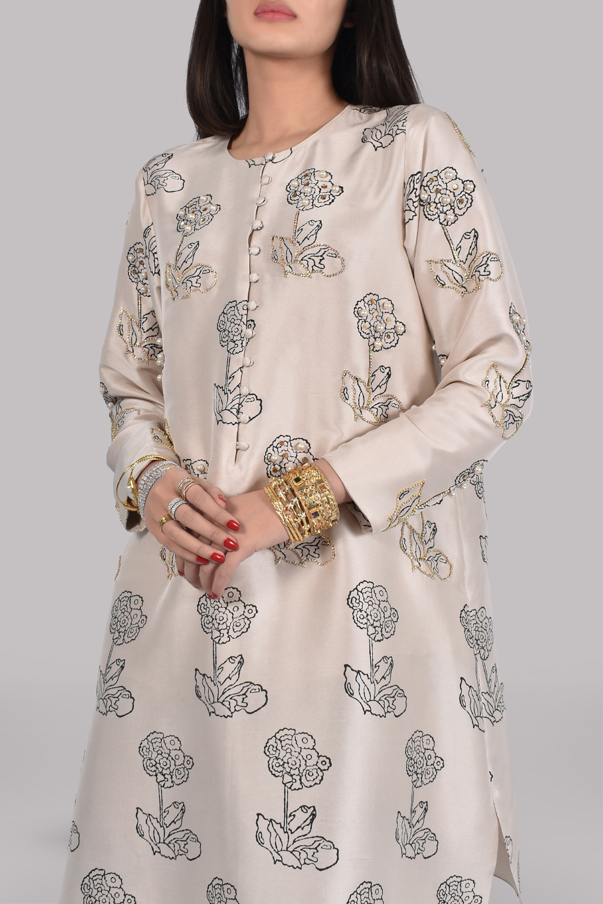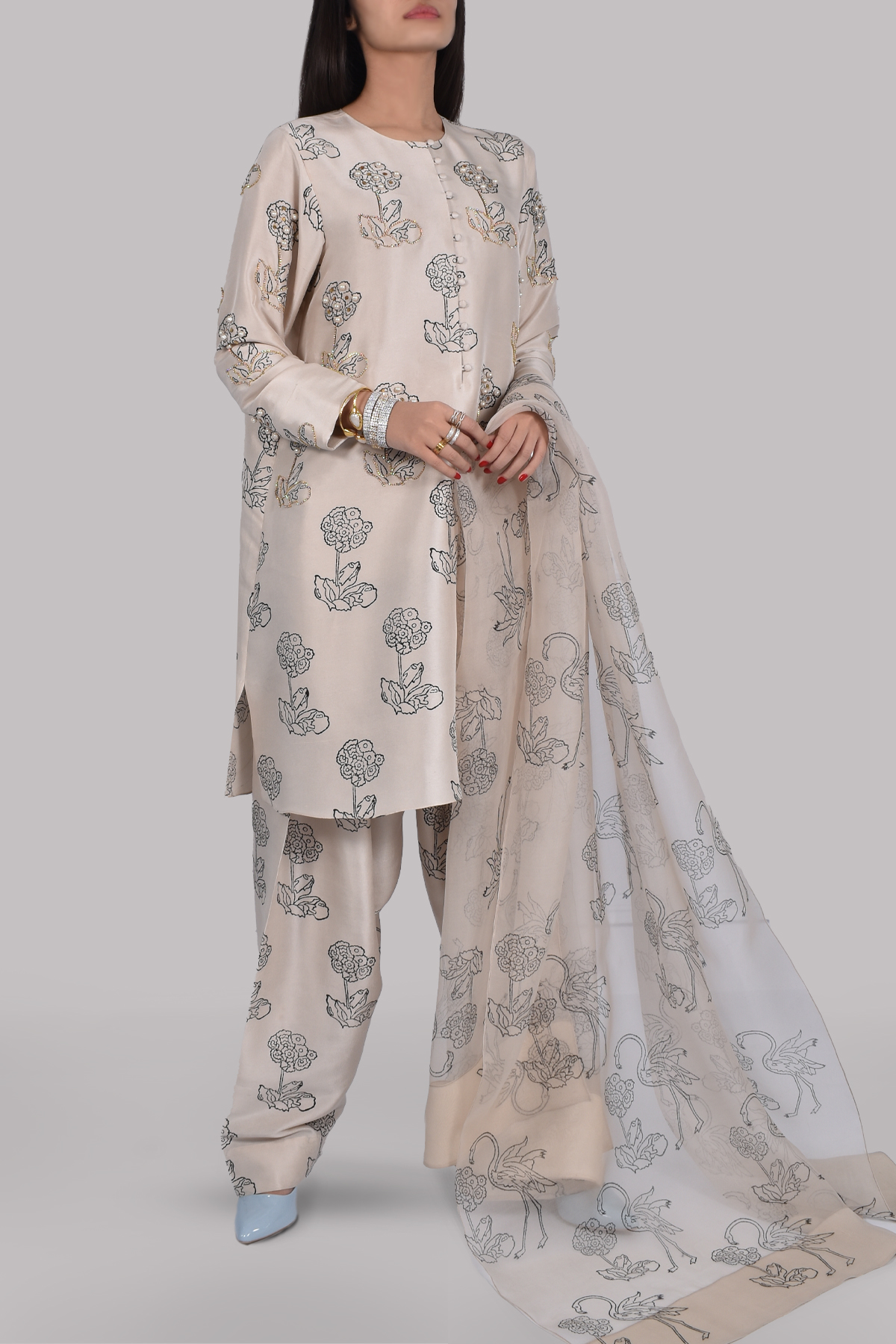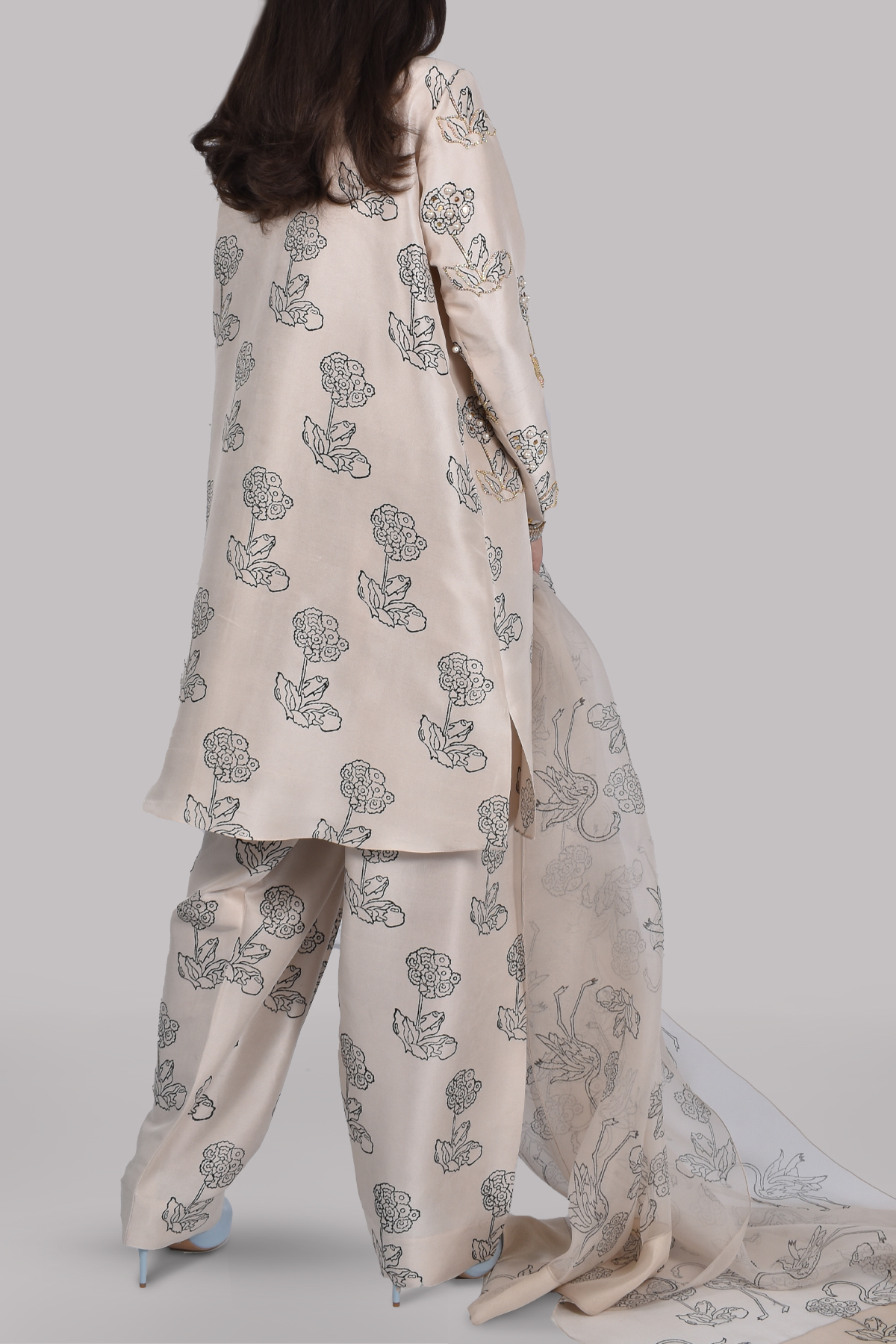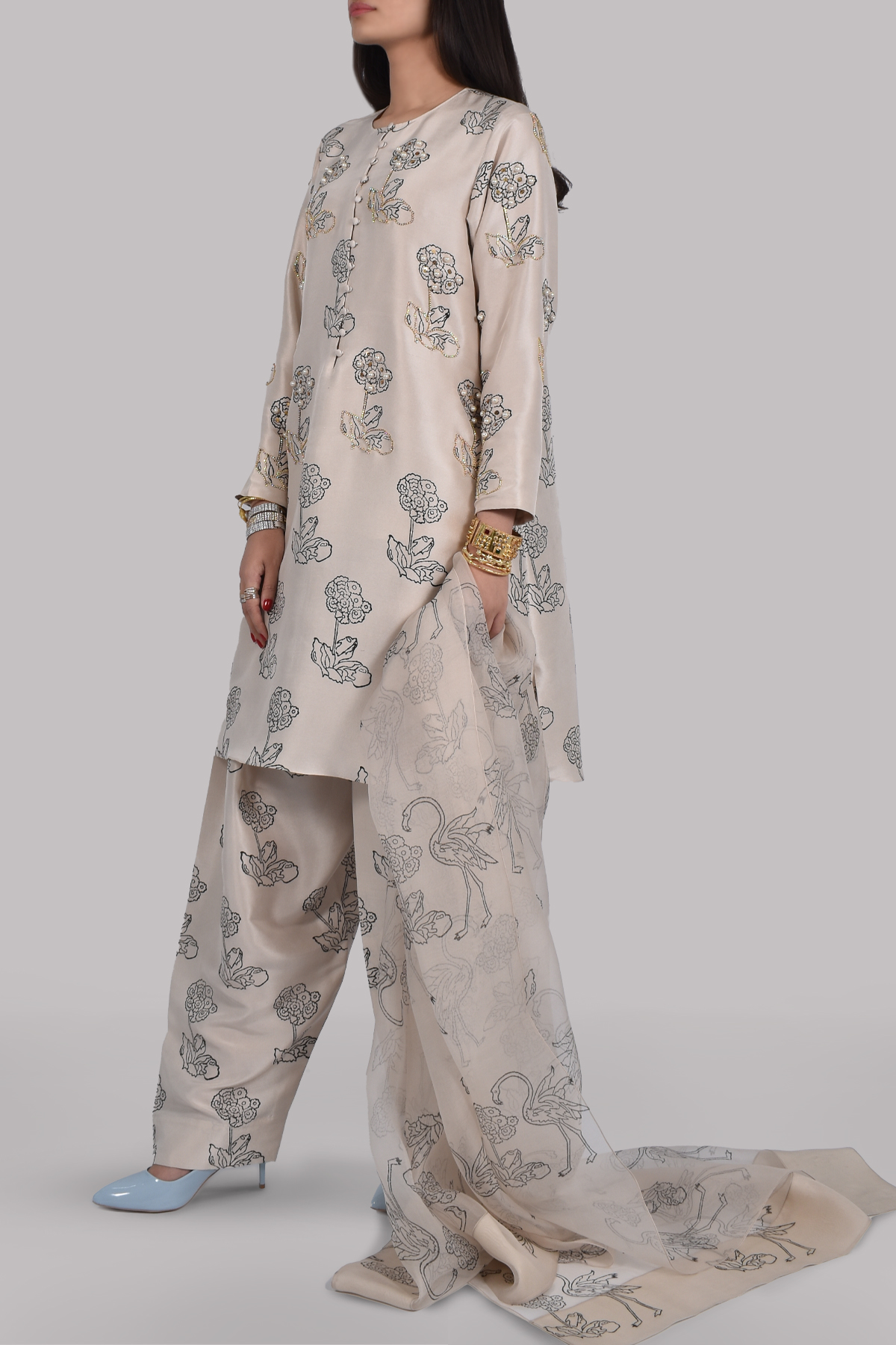 White swan block printed, slightly oversized dupion silk top, hand embellished with gold sequins, freshwater pearls, and crystals. Matching block printed raw silk shalwar pants and organza dupatta.