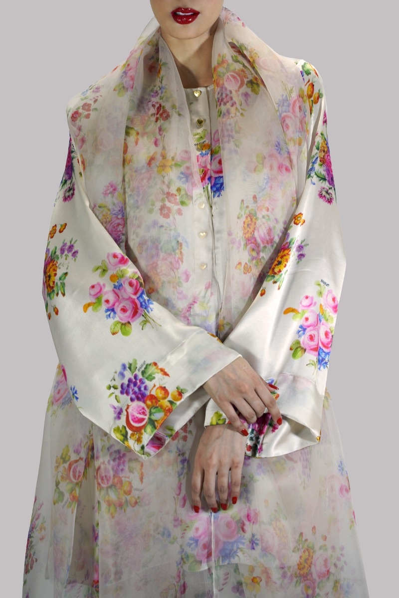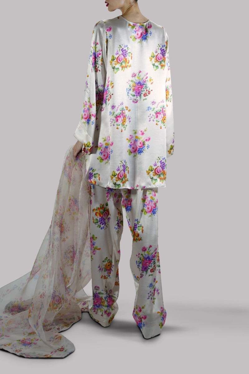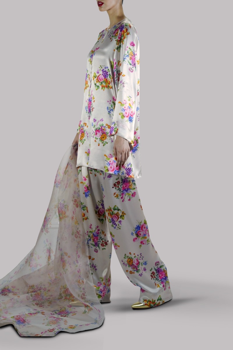 White Swan close neck satin silk floral printed shirt. It has perfect cuts and extravagant details, It’s impeccably tailored with matching floral printed satin silk shalwar pants, paired with printed organza dupatta.
