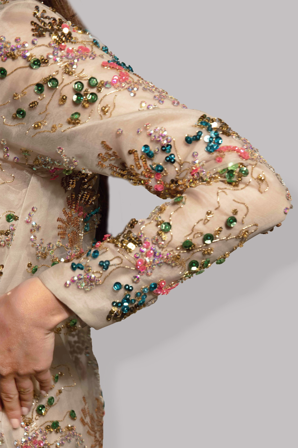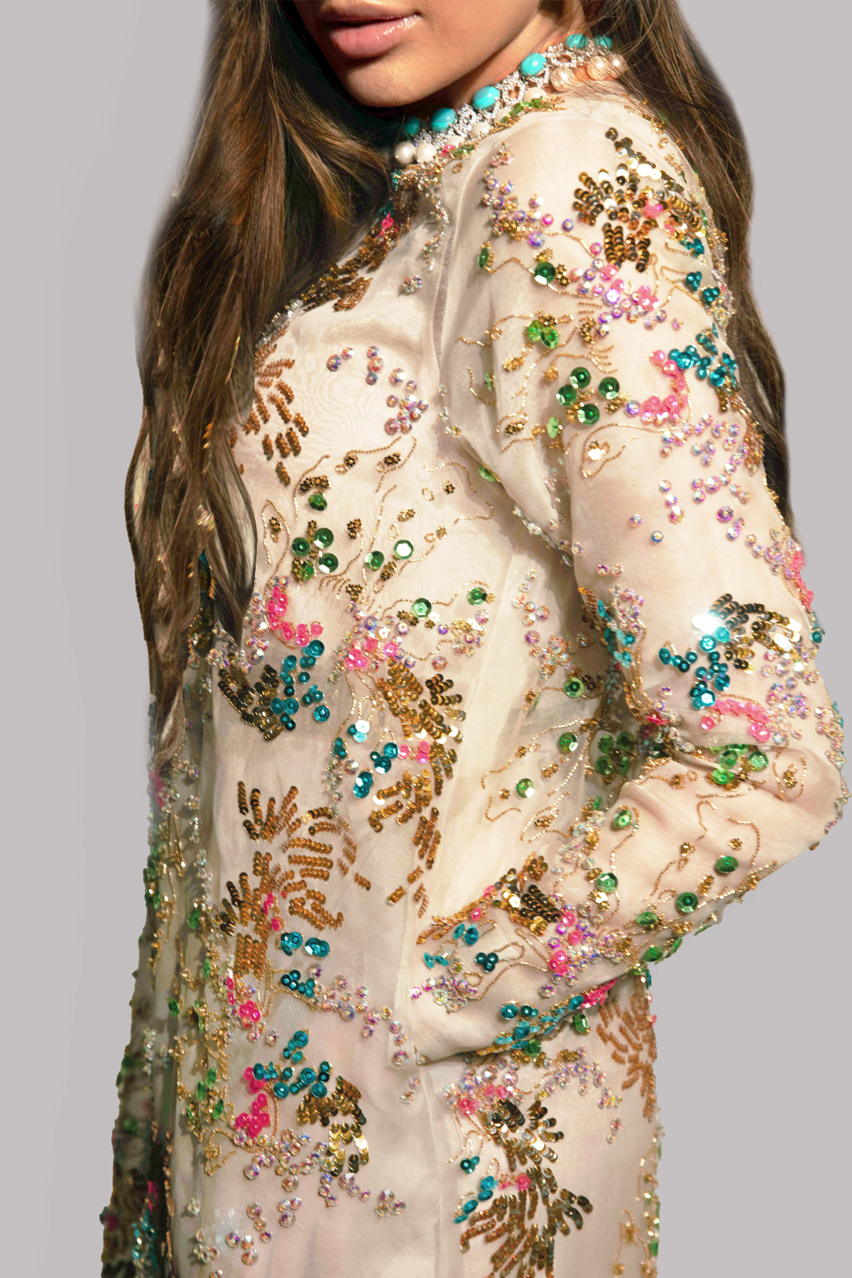 White swan organza maxi dress hand embellished with sparkling crystals and metallic gold, neon, and multi-coloured sequins.