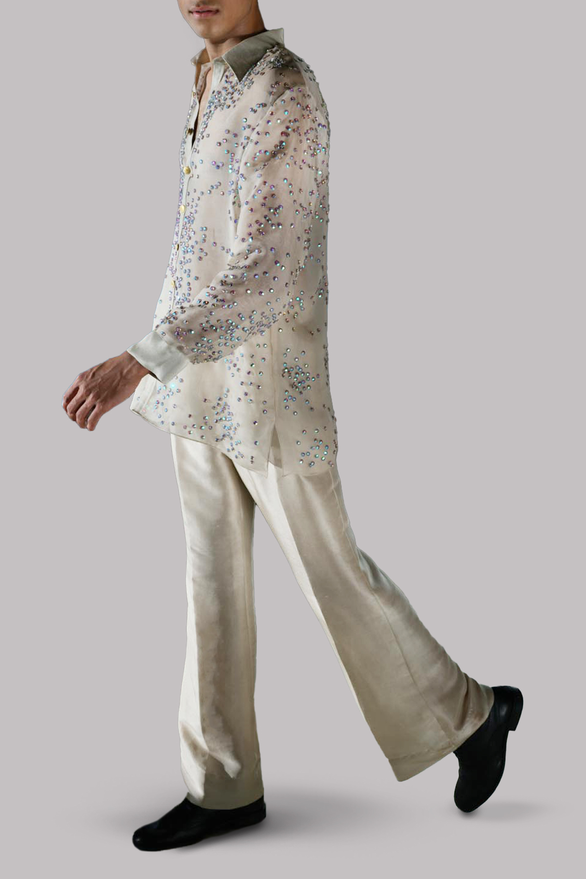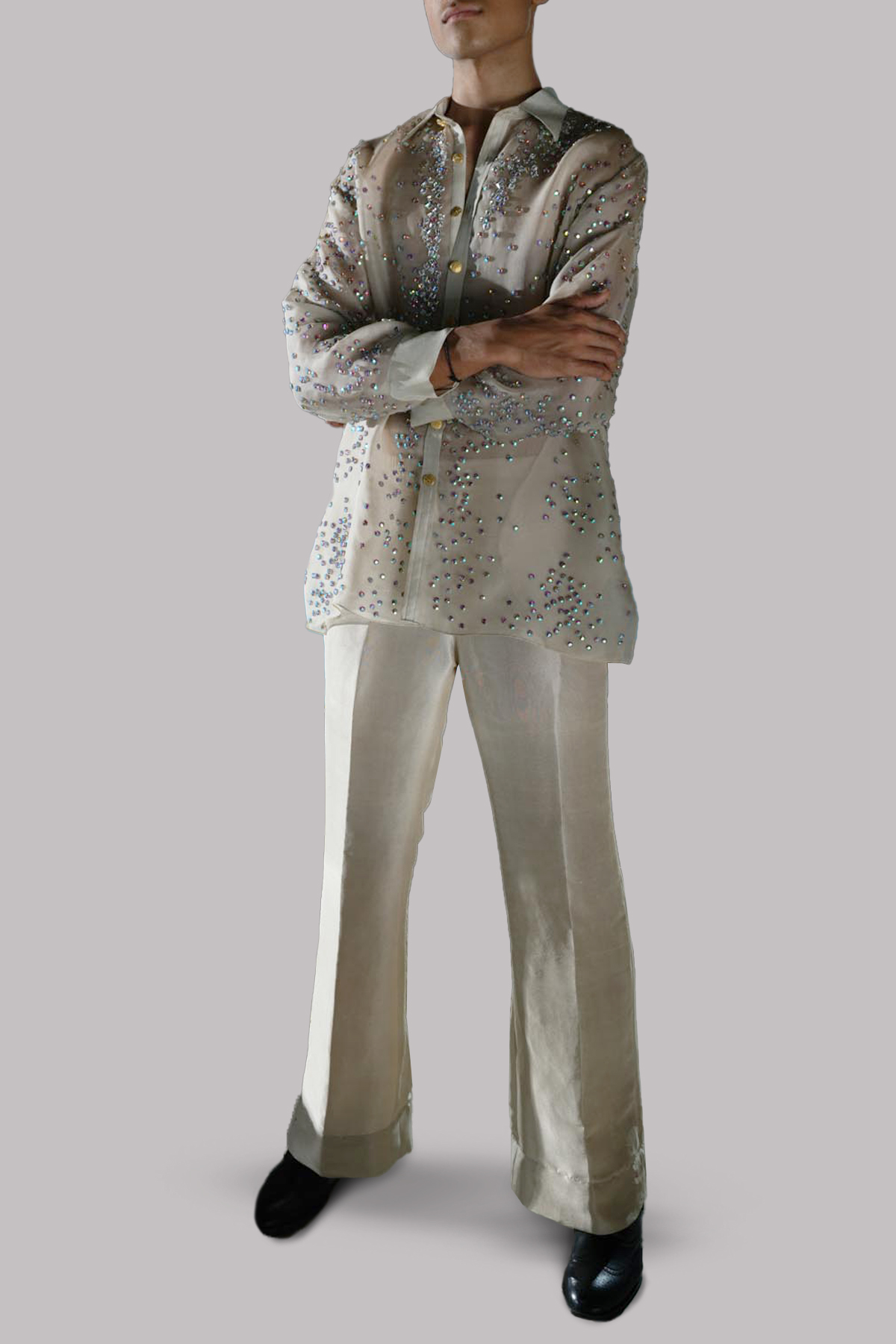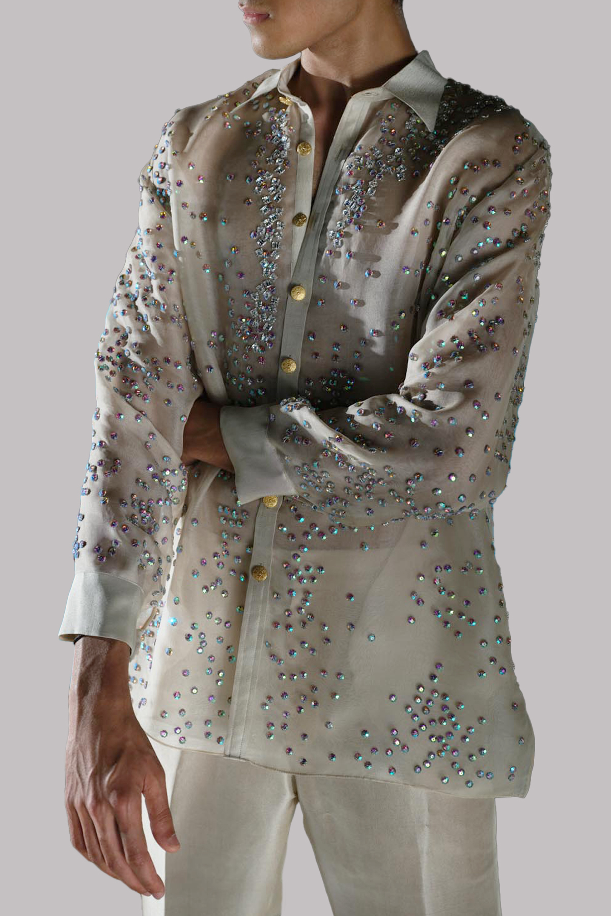 This White Swan Embellished Organza collar shirt adorned with gold French buttons and appealingly shiny and smooth embellishments. Paired with impeccably tailored trousers made from raw silk feels so luxurious.