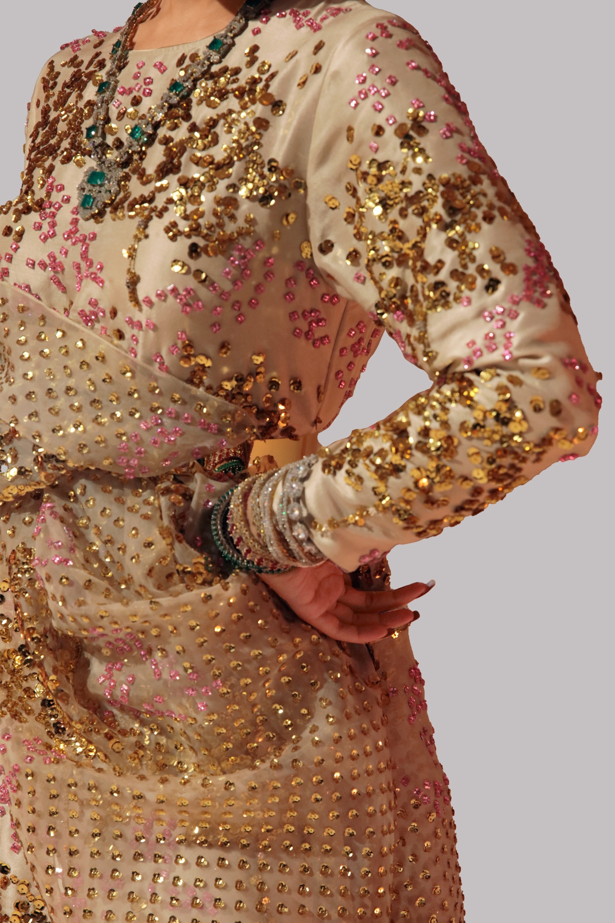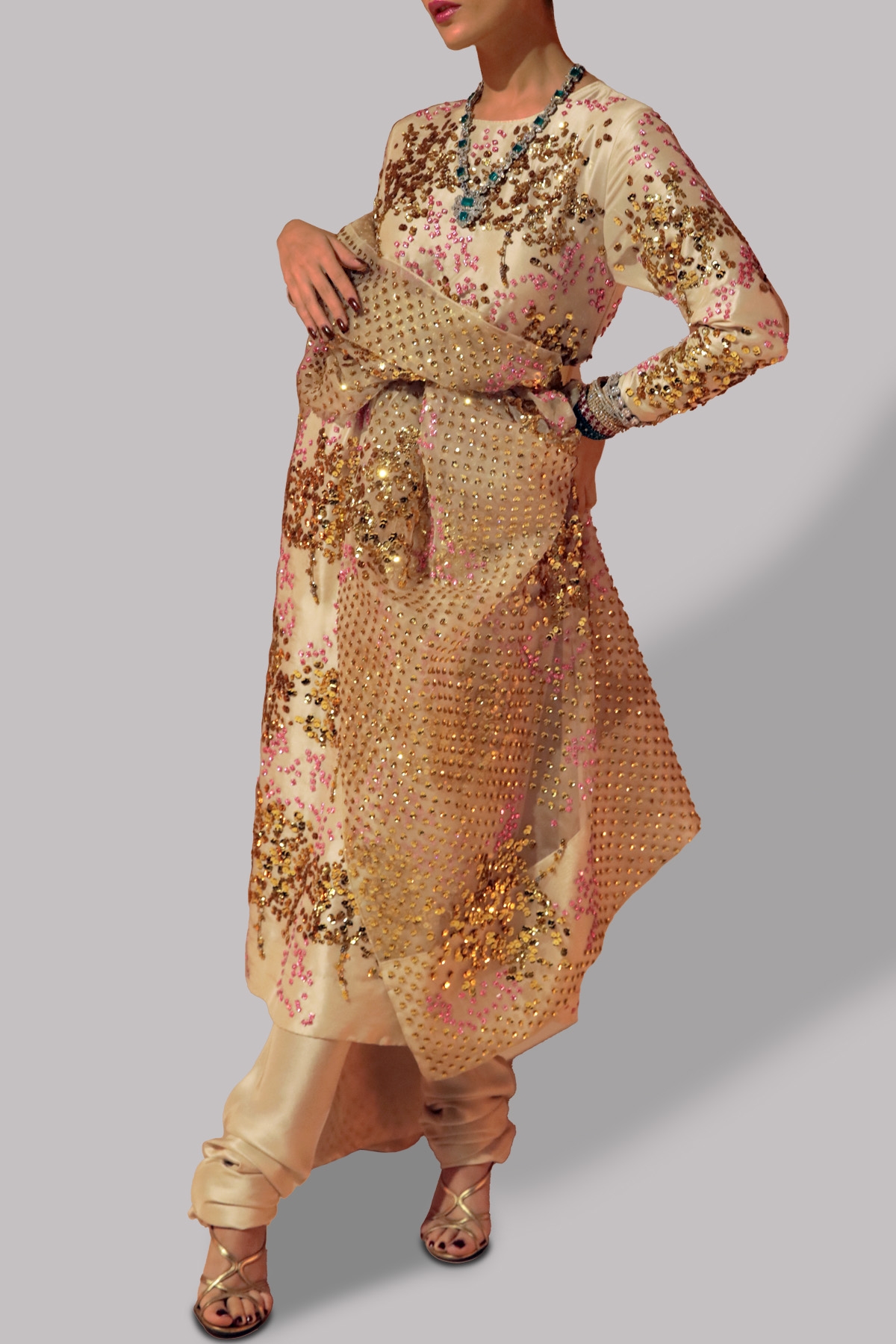 White Swan Raw Silk straight shirt, the shirt is beautifully decorated with multi-coloured French and Italian sequins. Matching embellished raw silk slim fit churidaar pants through the legs that are expertly tailored with matching embellished organza dupatta.